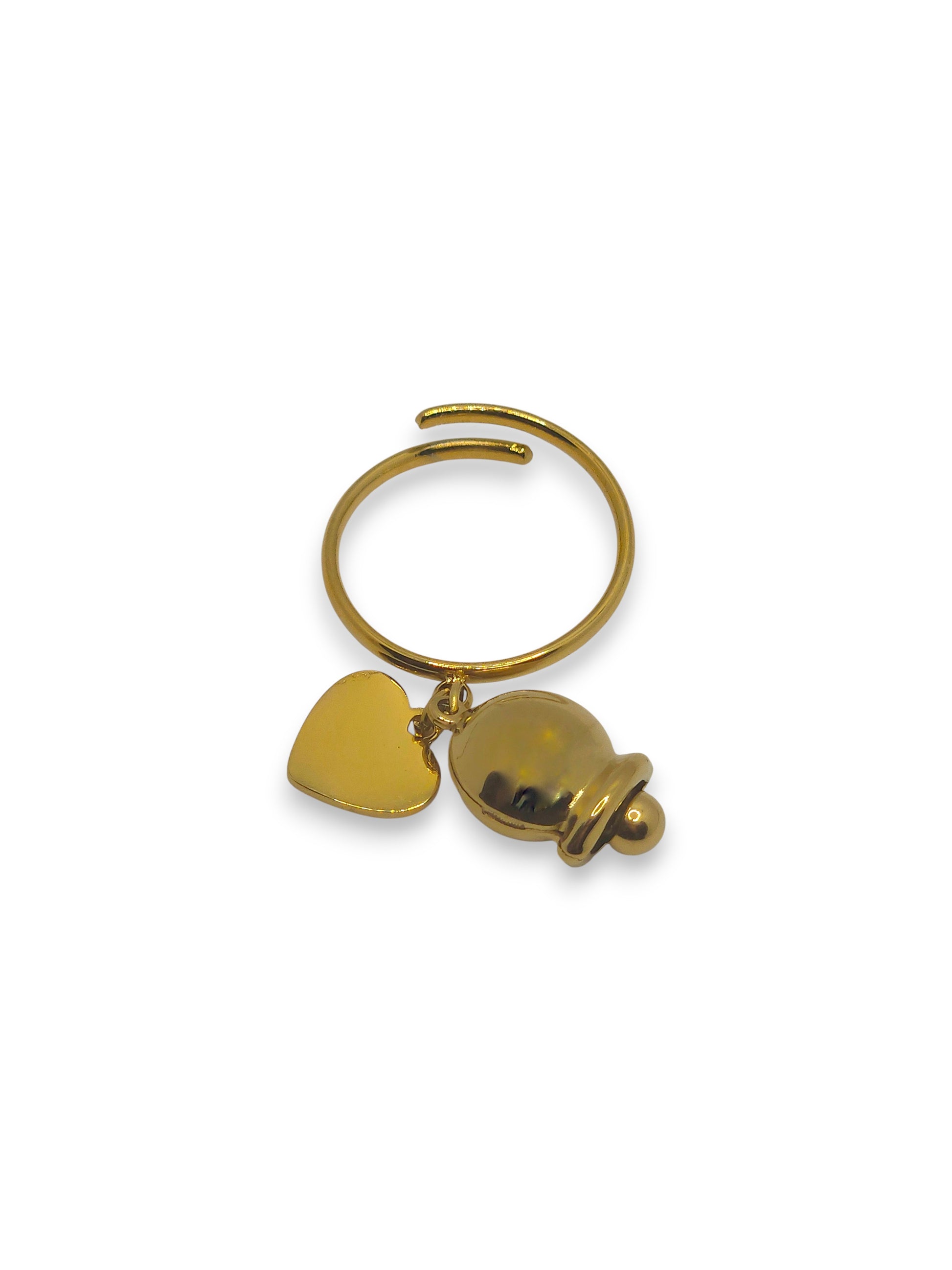 Anello con charm a forma di piccola campana e cuore pendente. Un simbolo di gioia e buoni auspici, perfetto per chi ama i dettagli dolci e significativi. Il suono delicato della campana richiama leggerezza e positività, rendendolo un gioiello portafortuna unico.