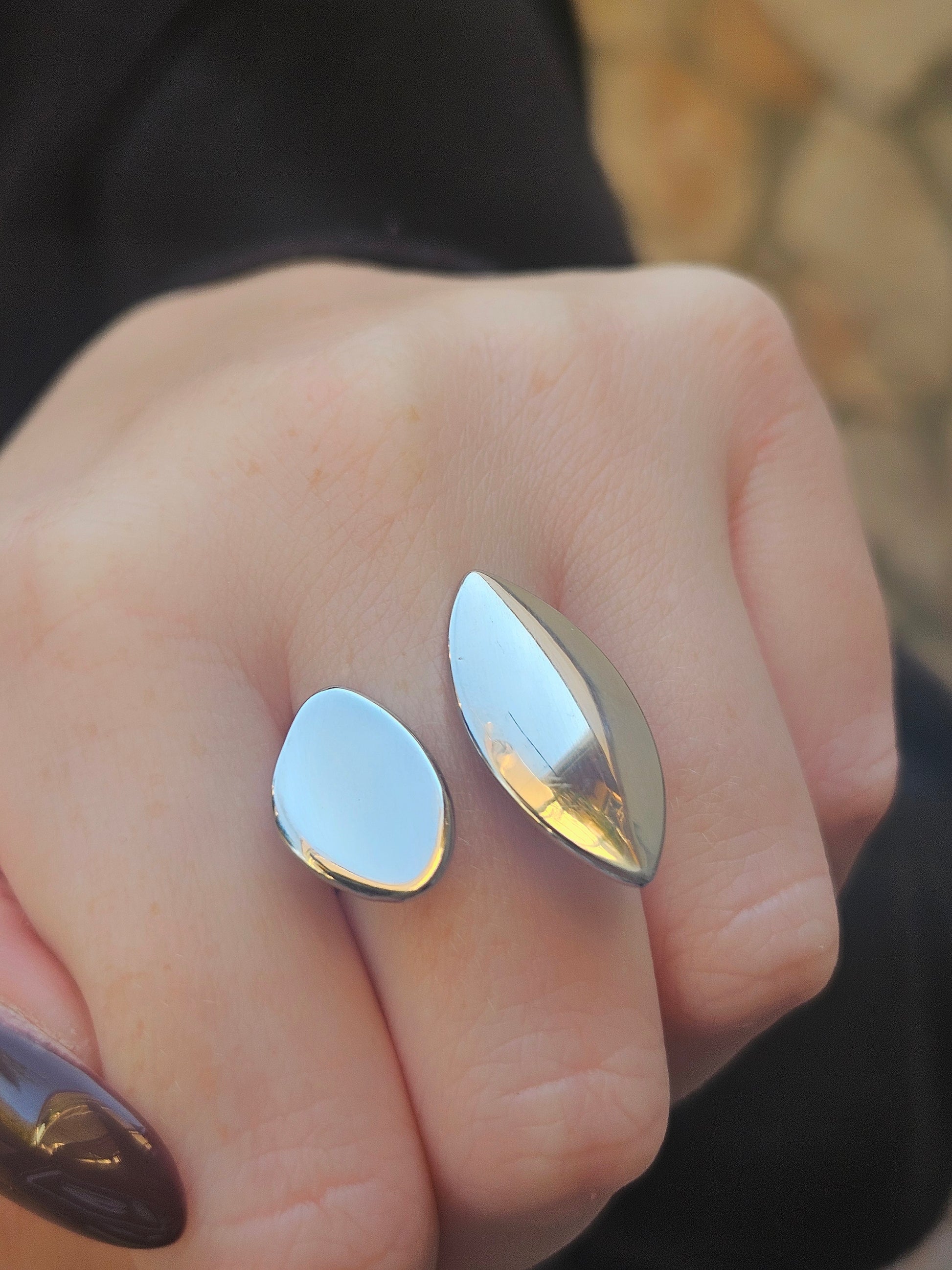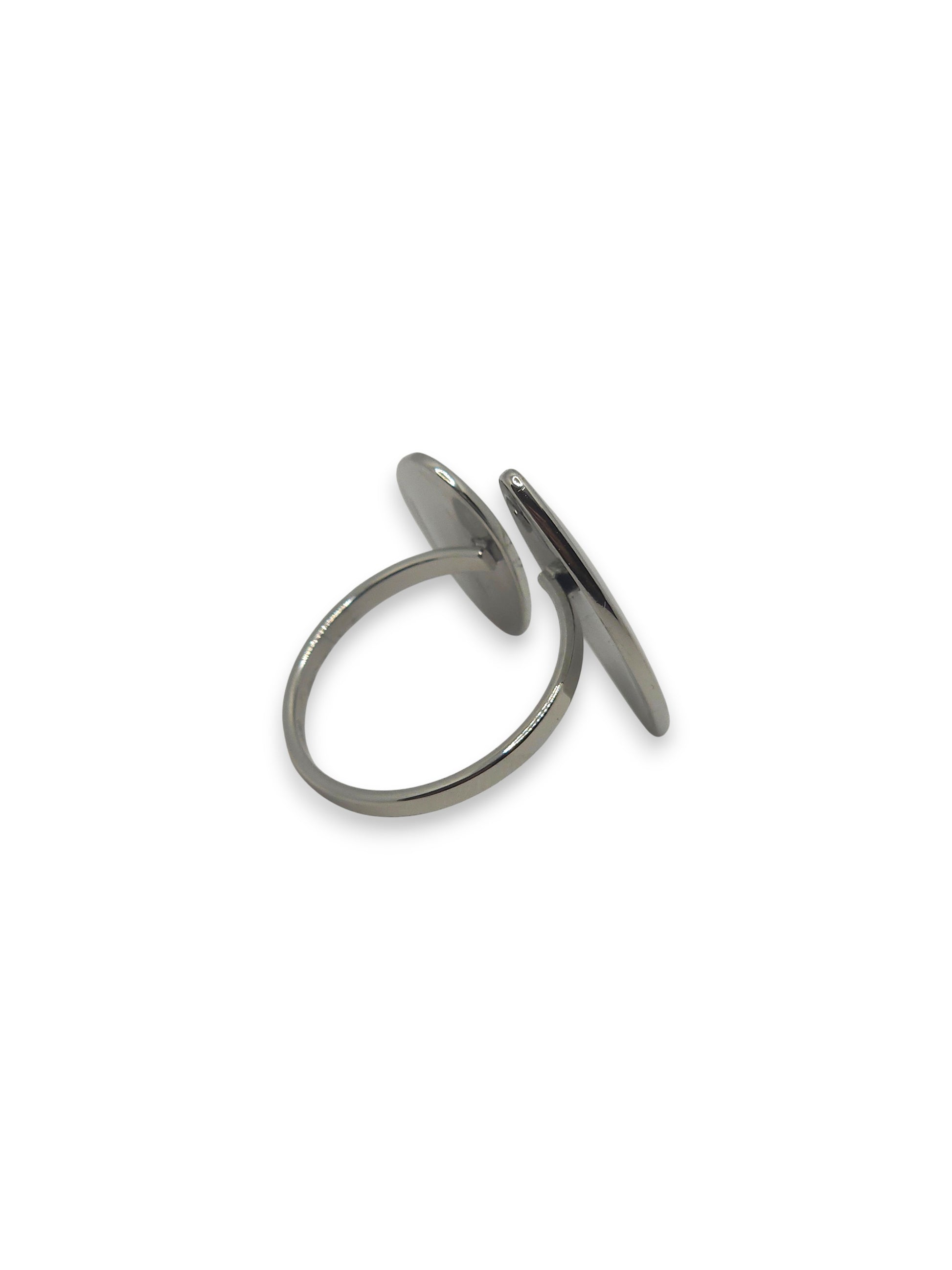 Anello aperto in acciaio argentato con due forme allungate, ispirato alla natura e alla leggerezza.
