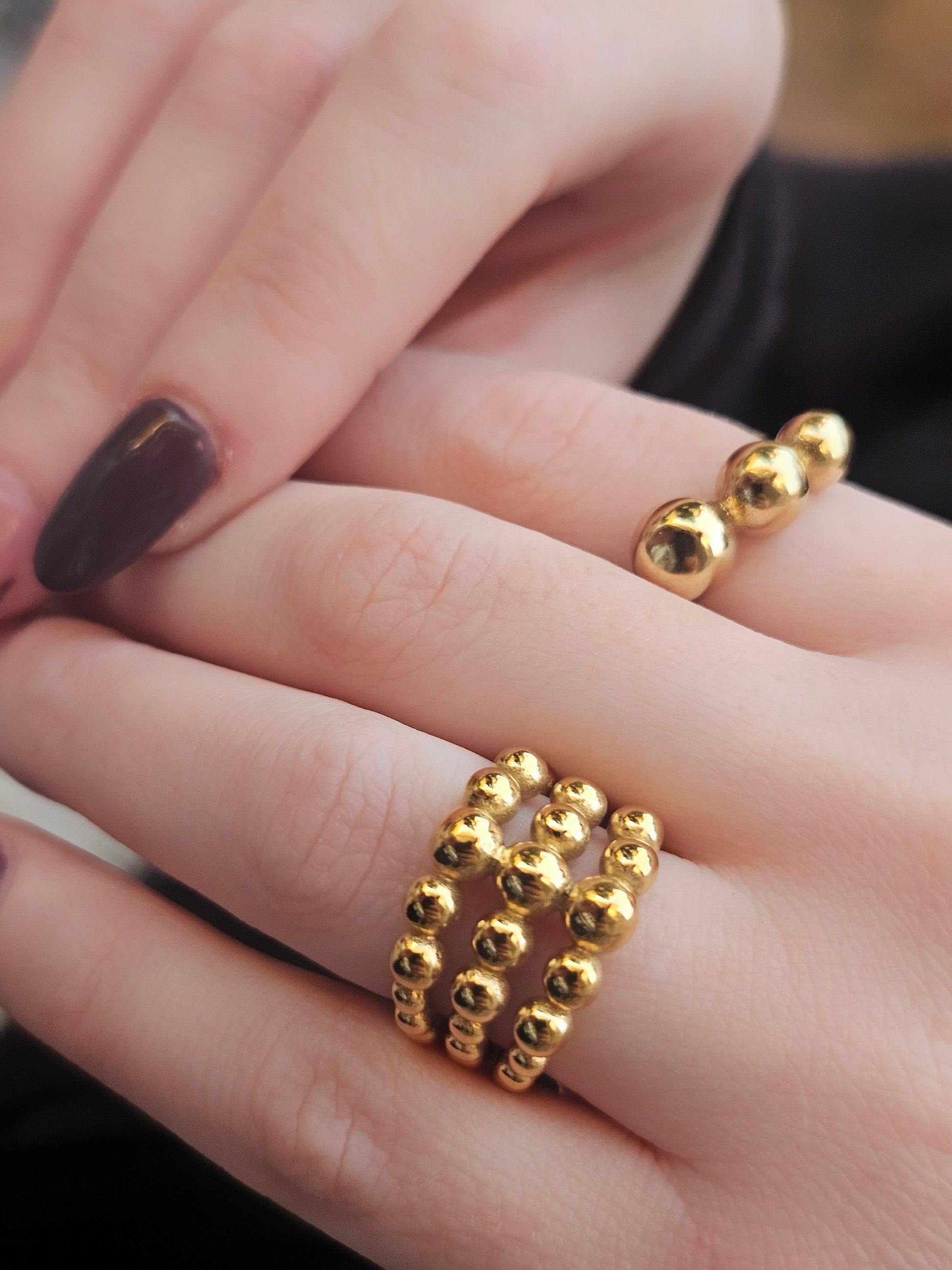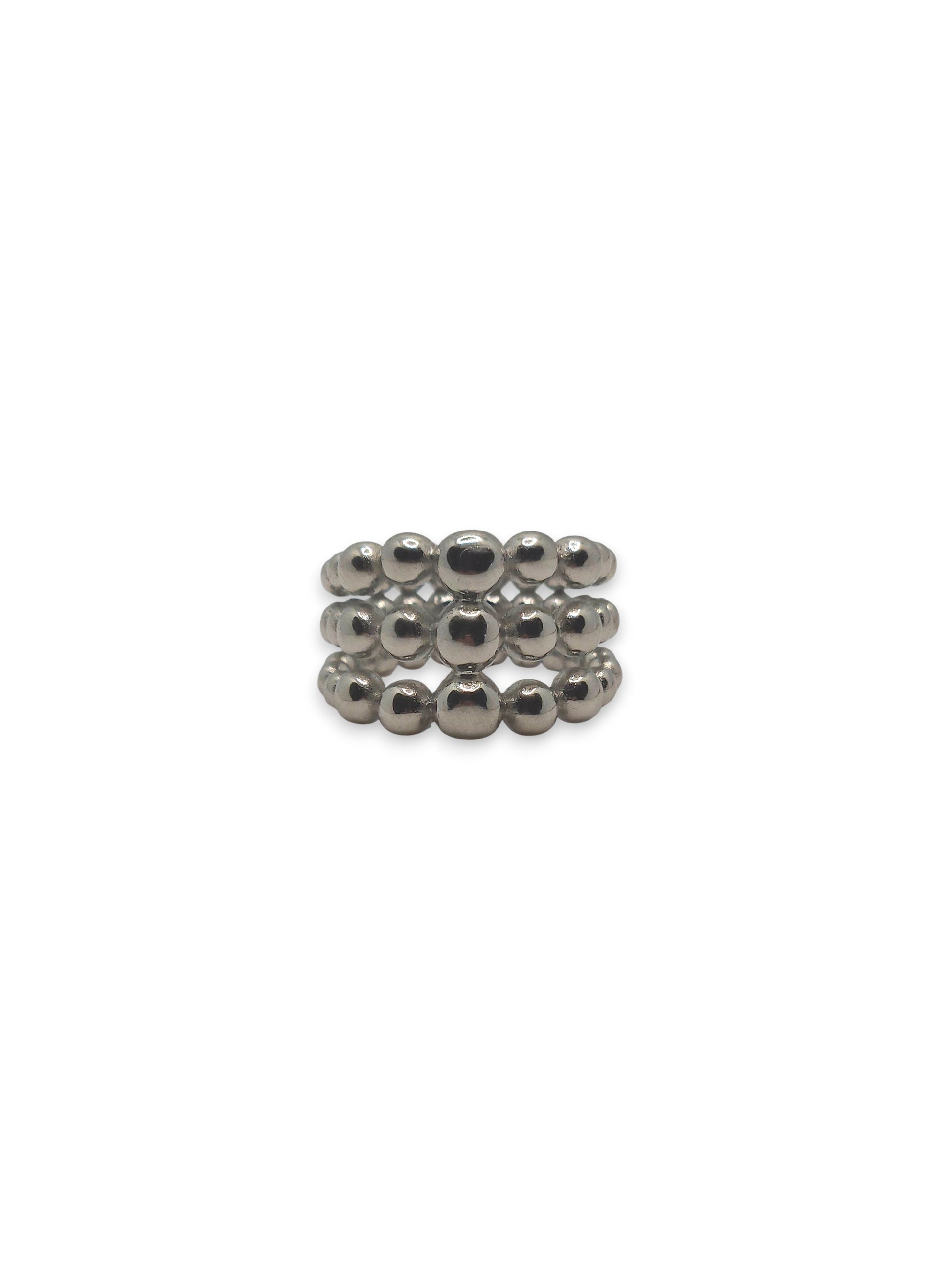 Anello a tre file di sfere lisce, elegante e contemporaneo. Ideale da portare solo o abbinato ad altri anelli.
