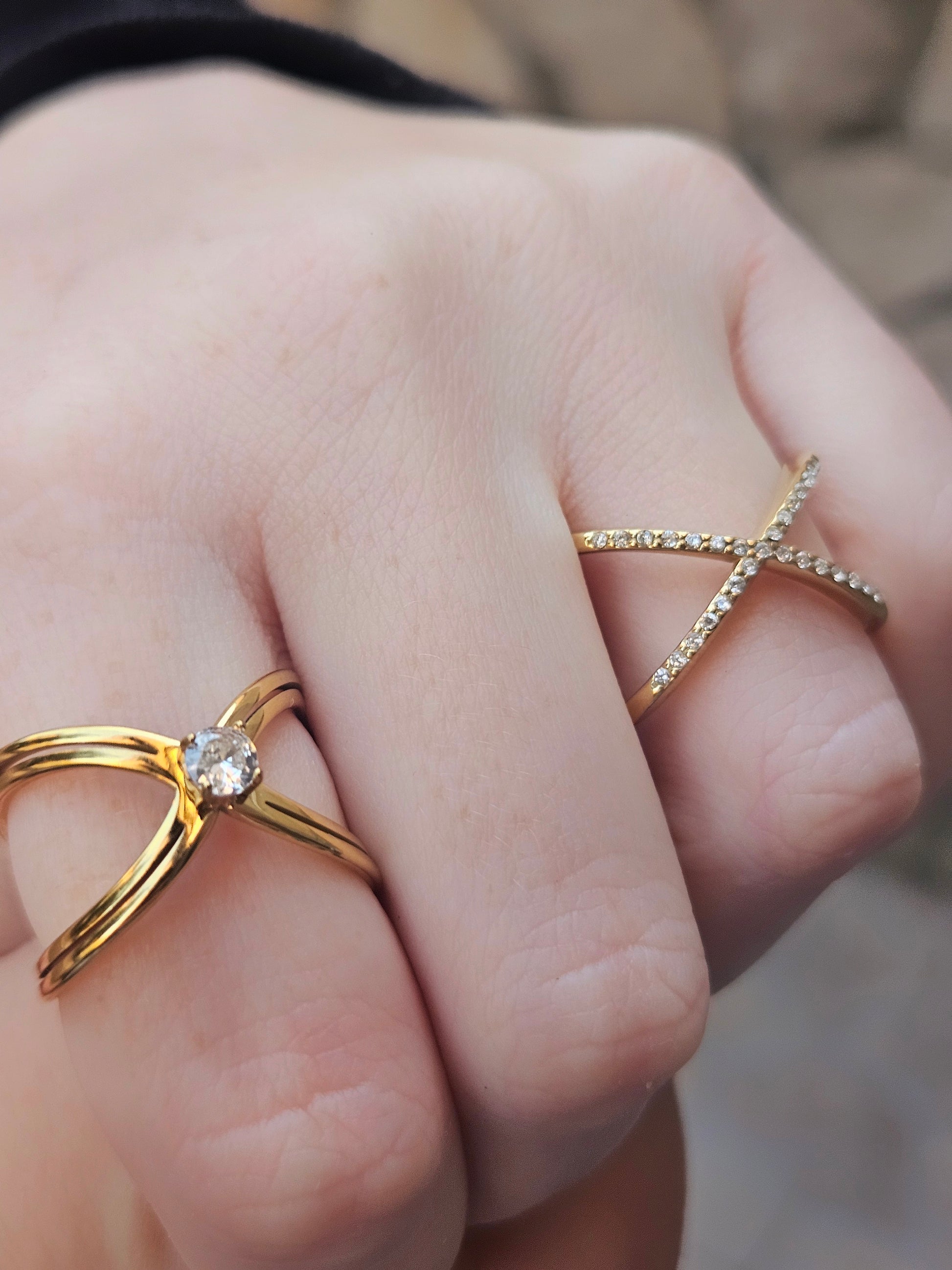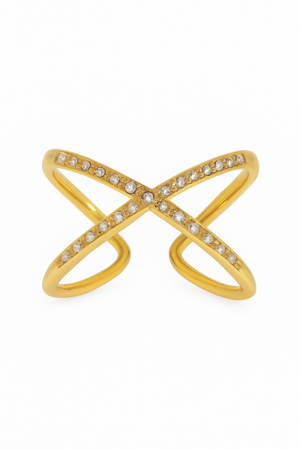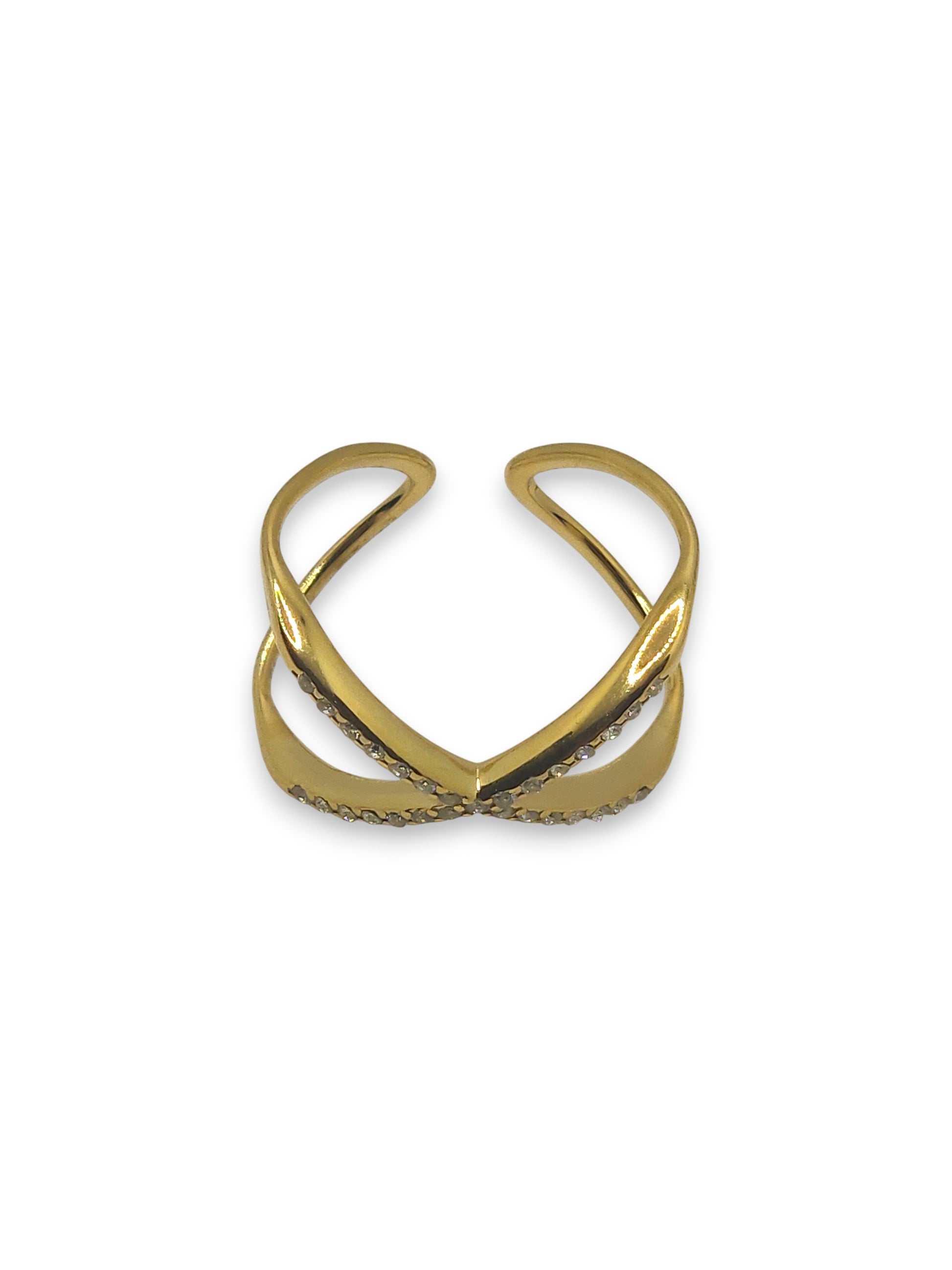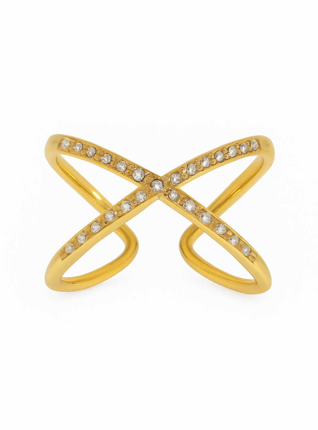 Anello con fasce incrociate e punto luce centrale. Un gioiello simbolo di eleganza e armonia.