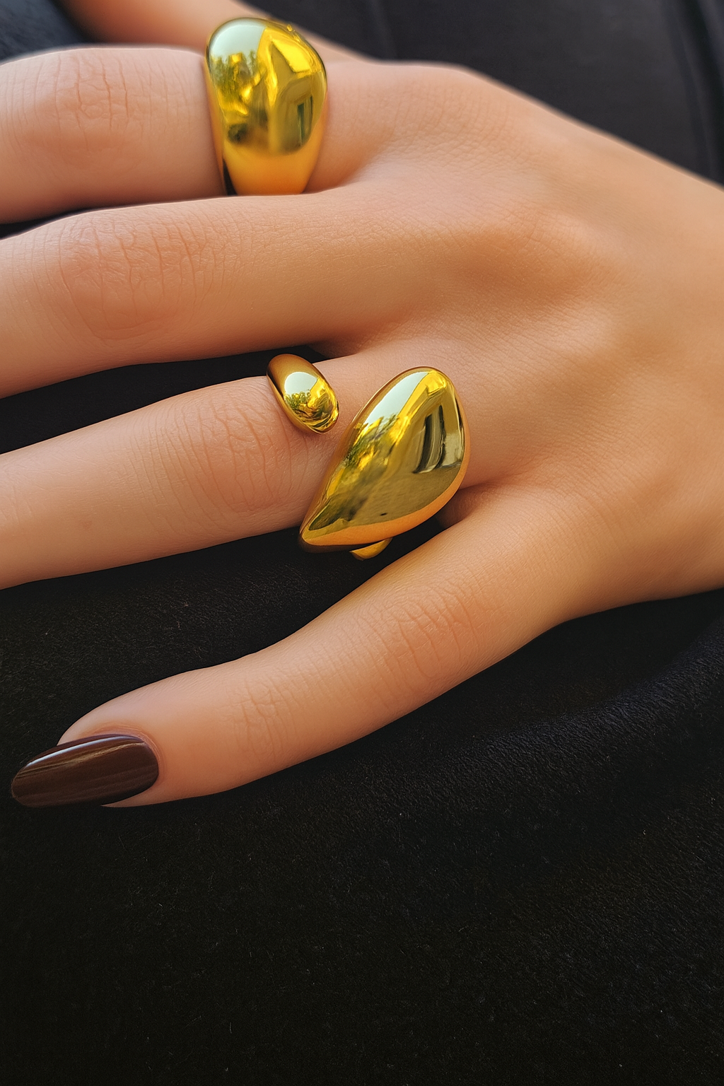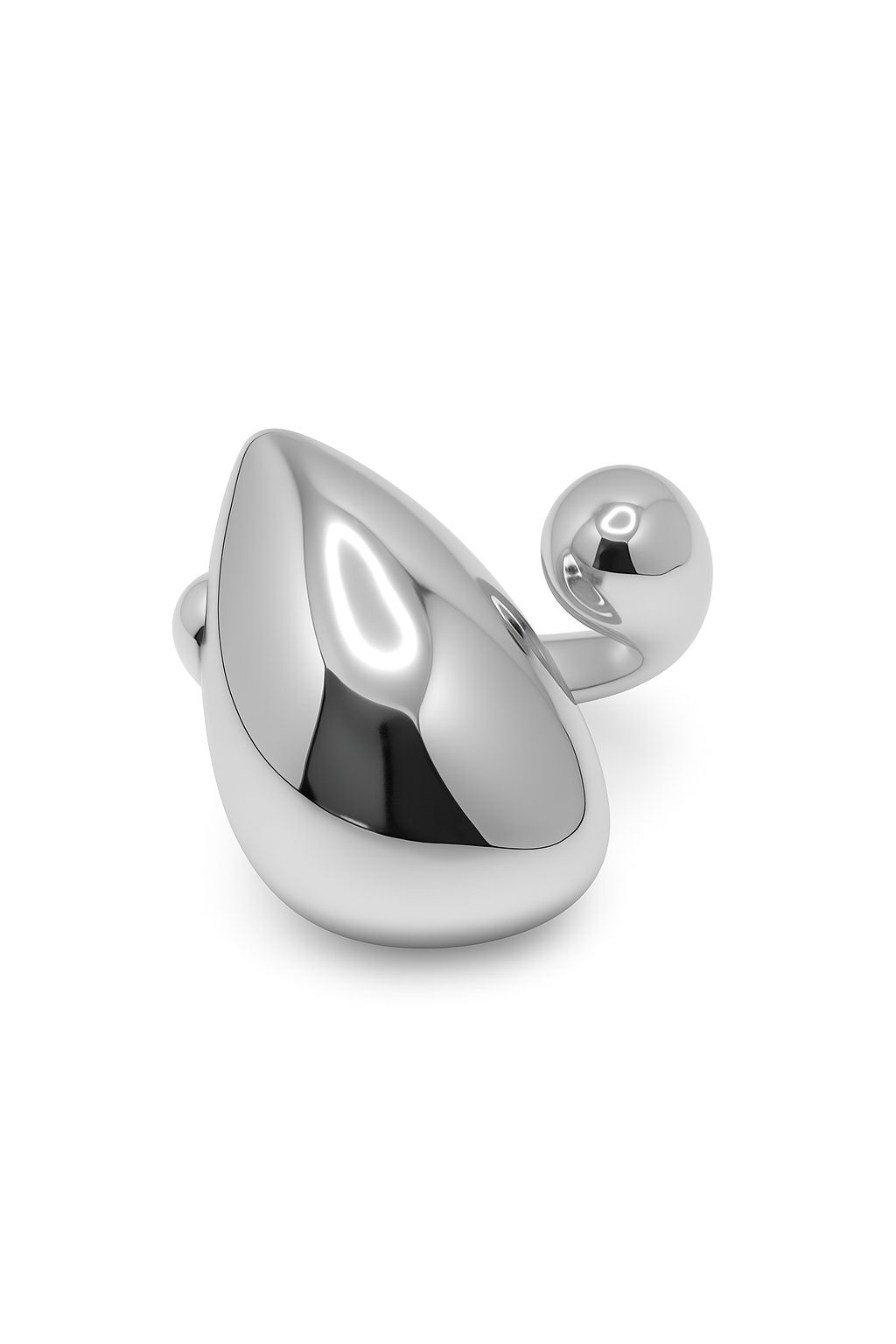 Anello dal design scultoreo e contemporaneo, caratterizzato da volumi pieni e superfici morbide che riflettono la luce in modo naturale.