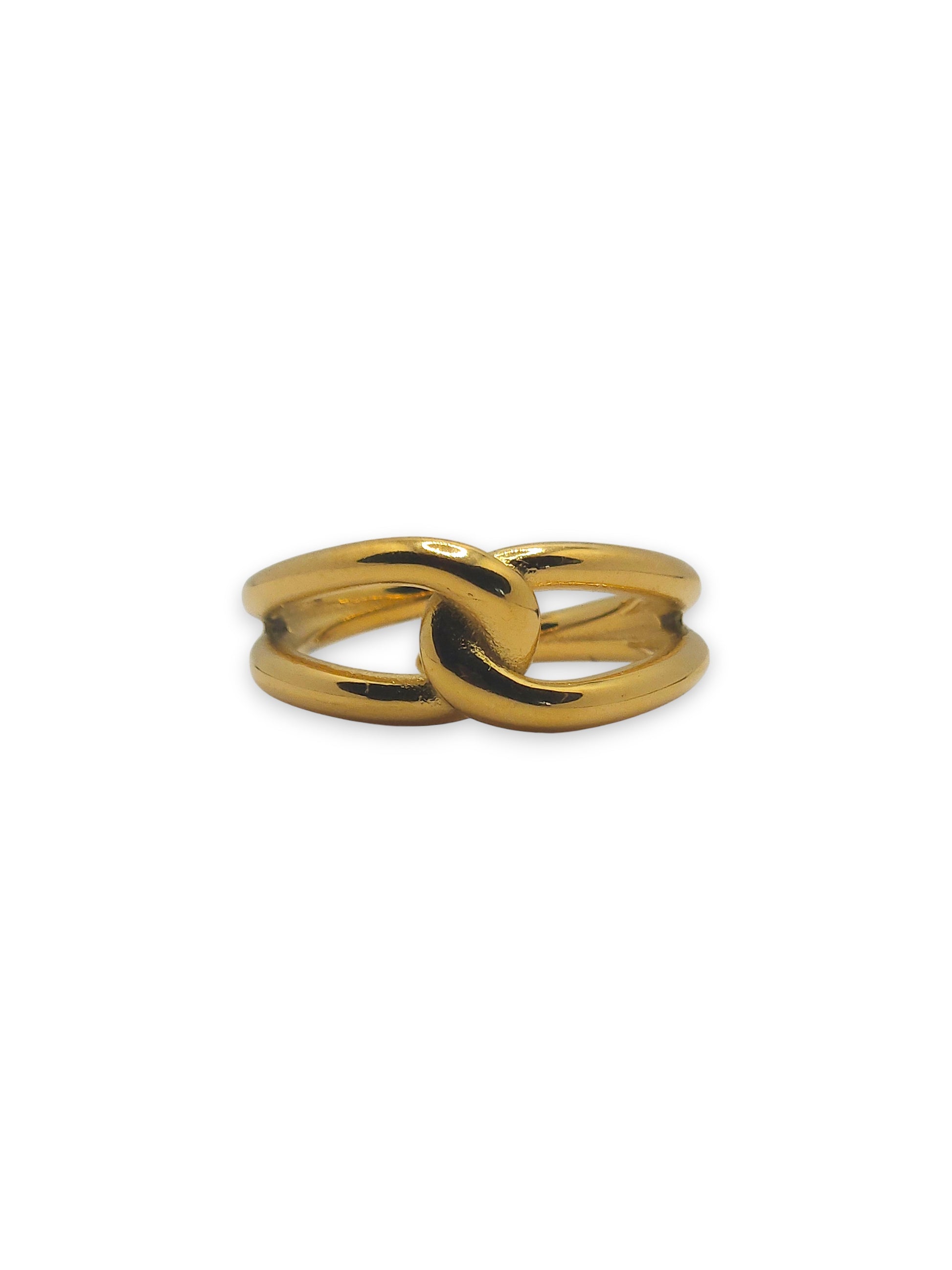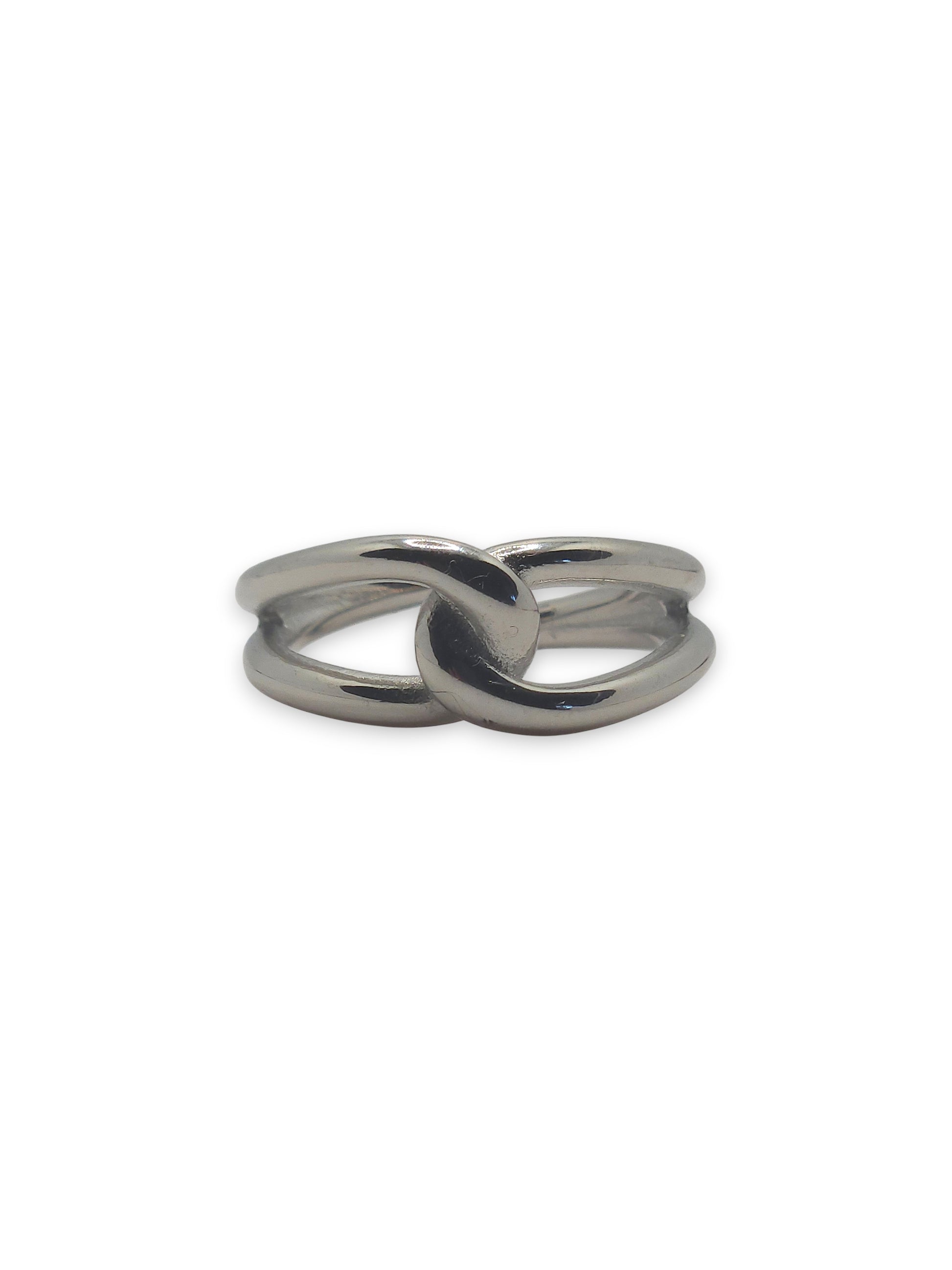 Anello con doppio giro e nodo centrale, simbolo di connessione e stile minimal.