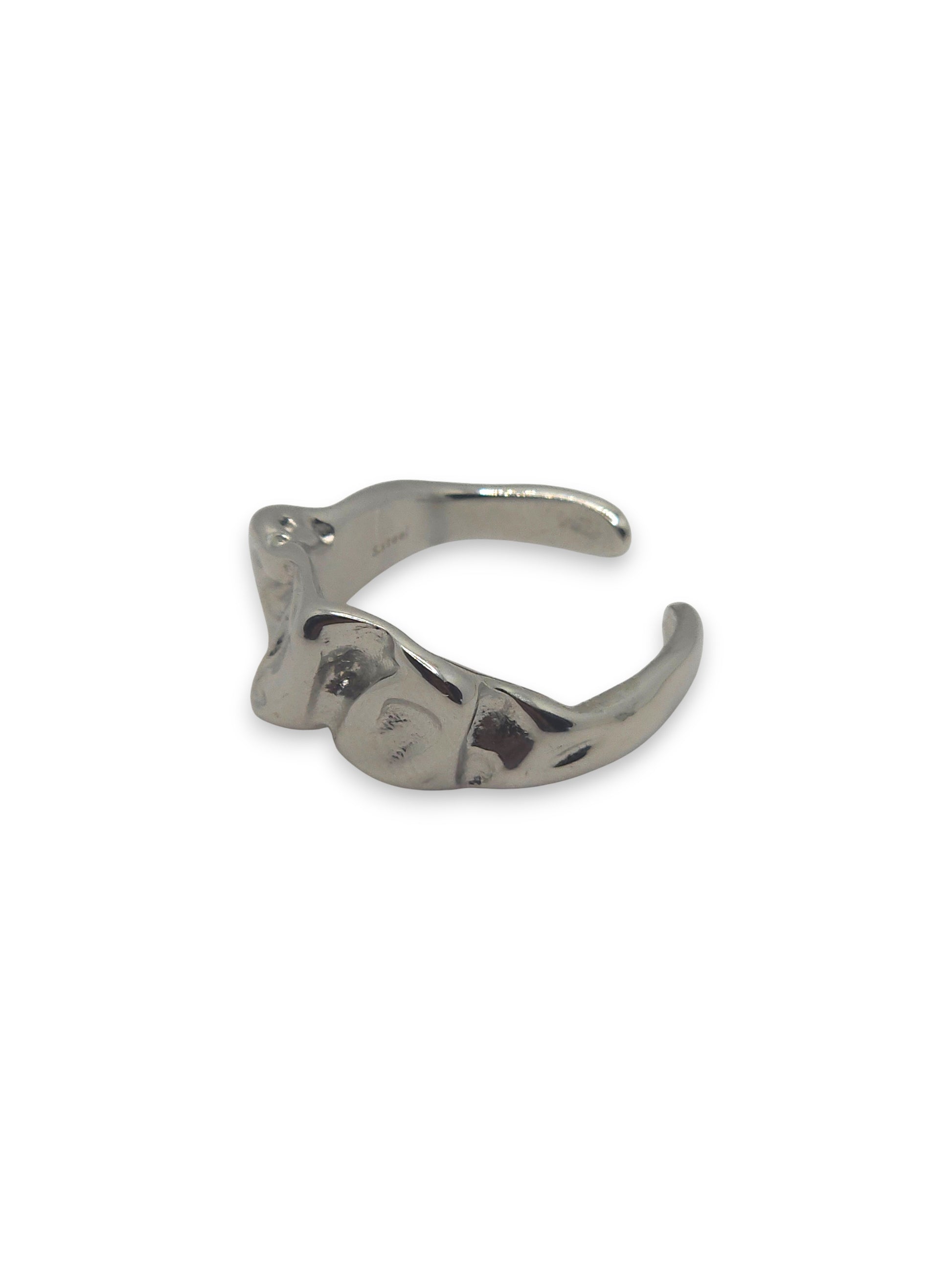 Anello aperto con superficie irregolare, effetto drappeggiato e contemporaneo.