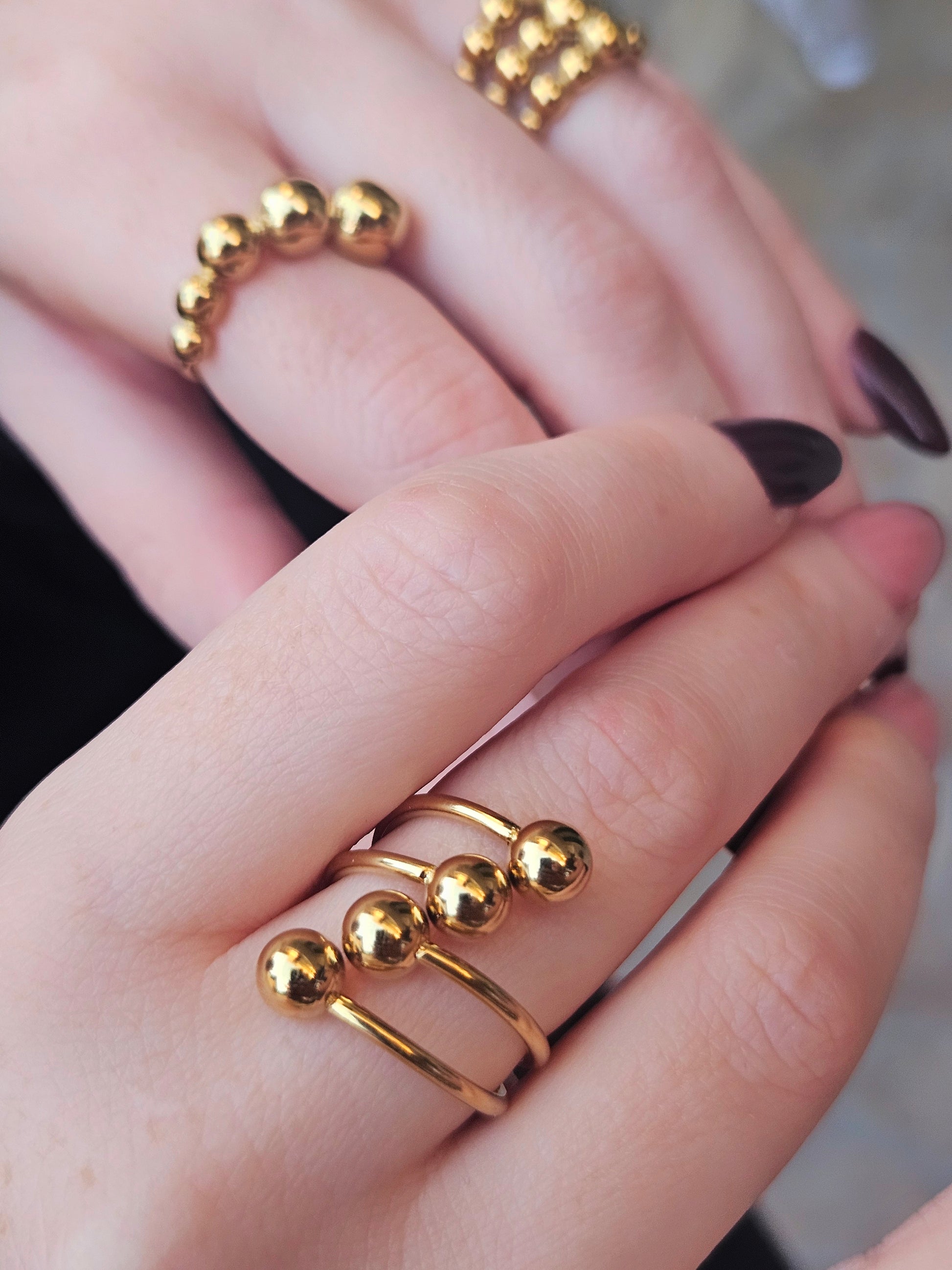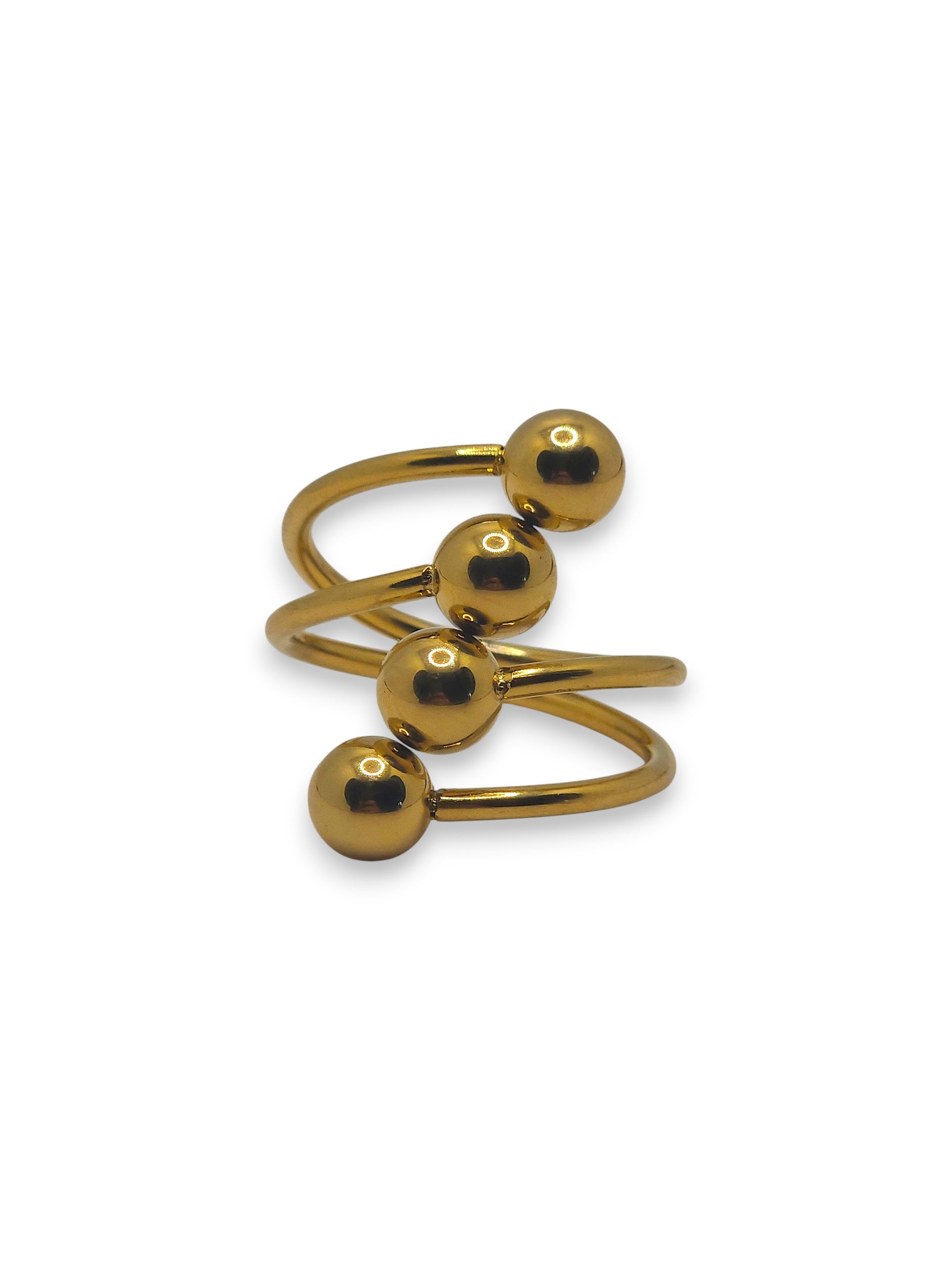 Anello con quattro sfere su doppia fascia, ispirato all’equilibrio.