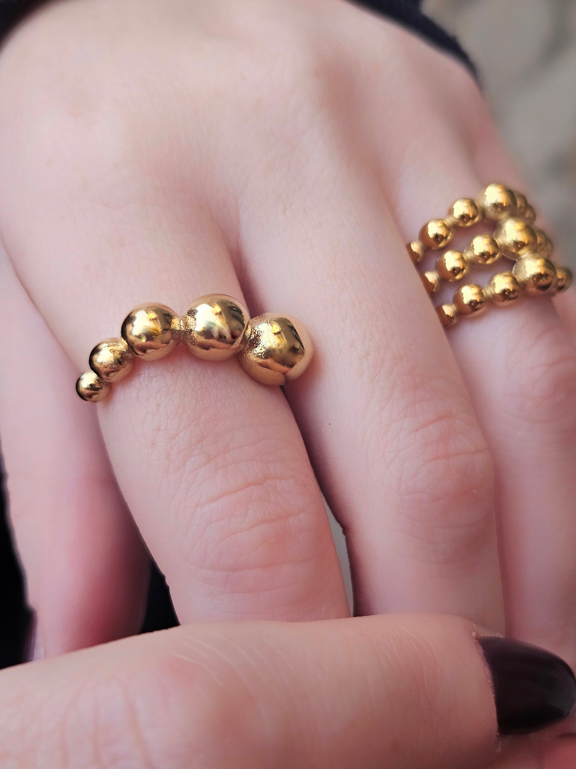 Le sfere di diverse dimensioni evocano un movimento cosmico, luminoso e armonioso.