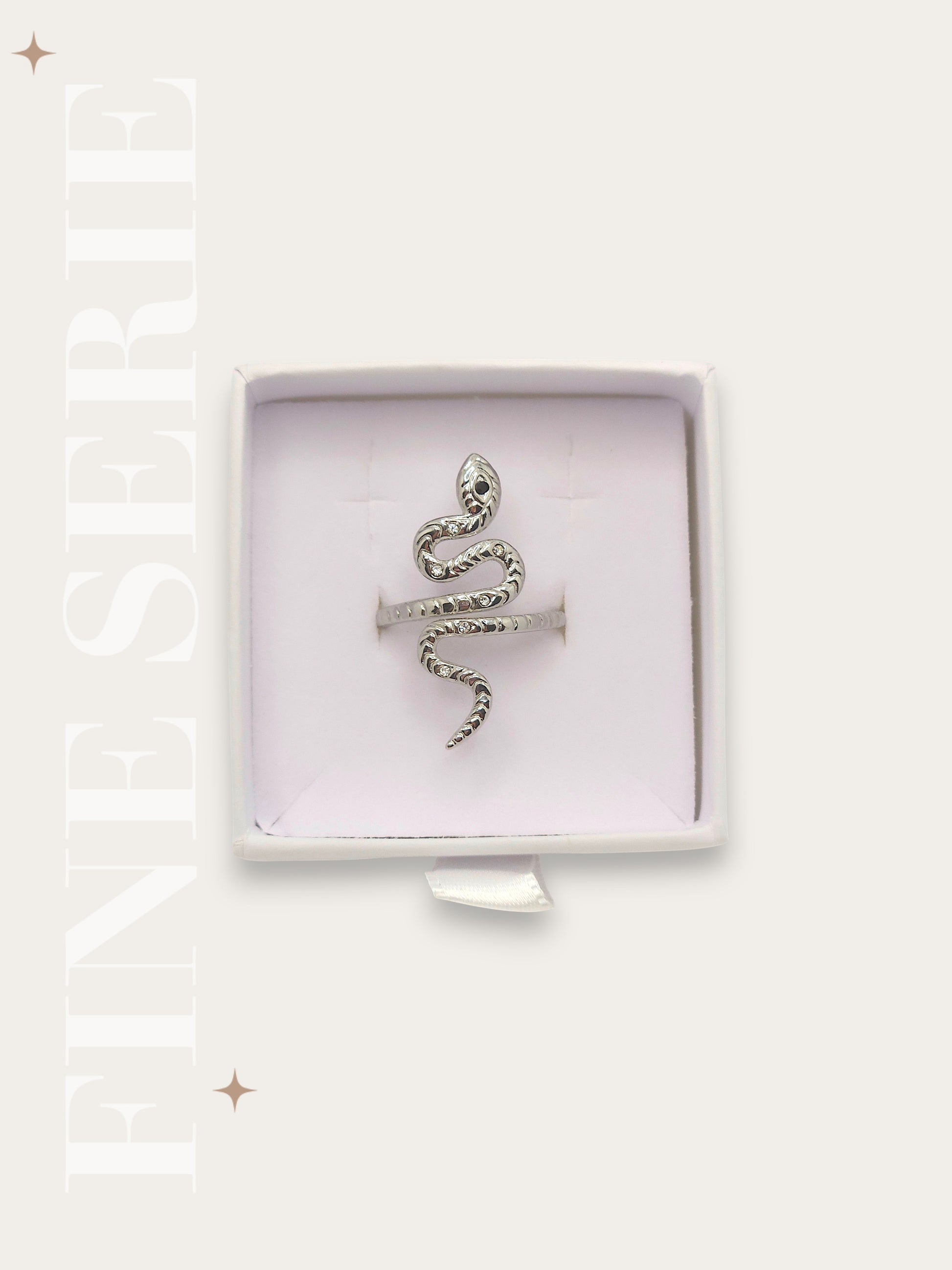 Anello dal design avvolgente e sinuoso, ispirato alla figura del serpente che si arrotola delicatamente attorno al dito. La forma fluida crea movimento e carattere, mentre le incisioni lungo il corpo e i piccoli zirconi incastonati aggiungono luce e dettaglio senza risultare eccessivi.