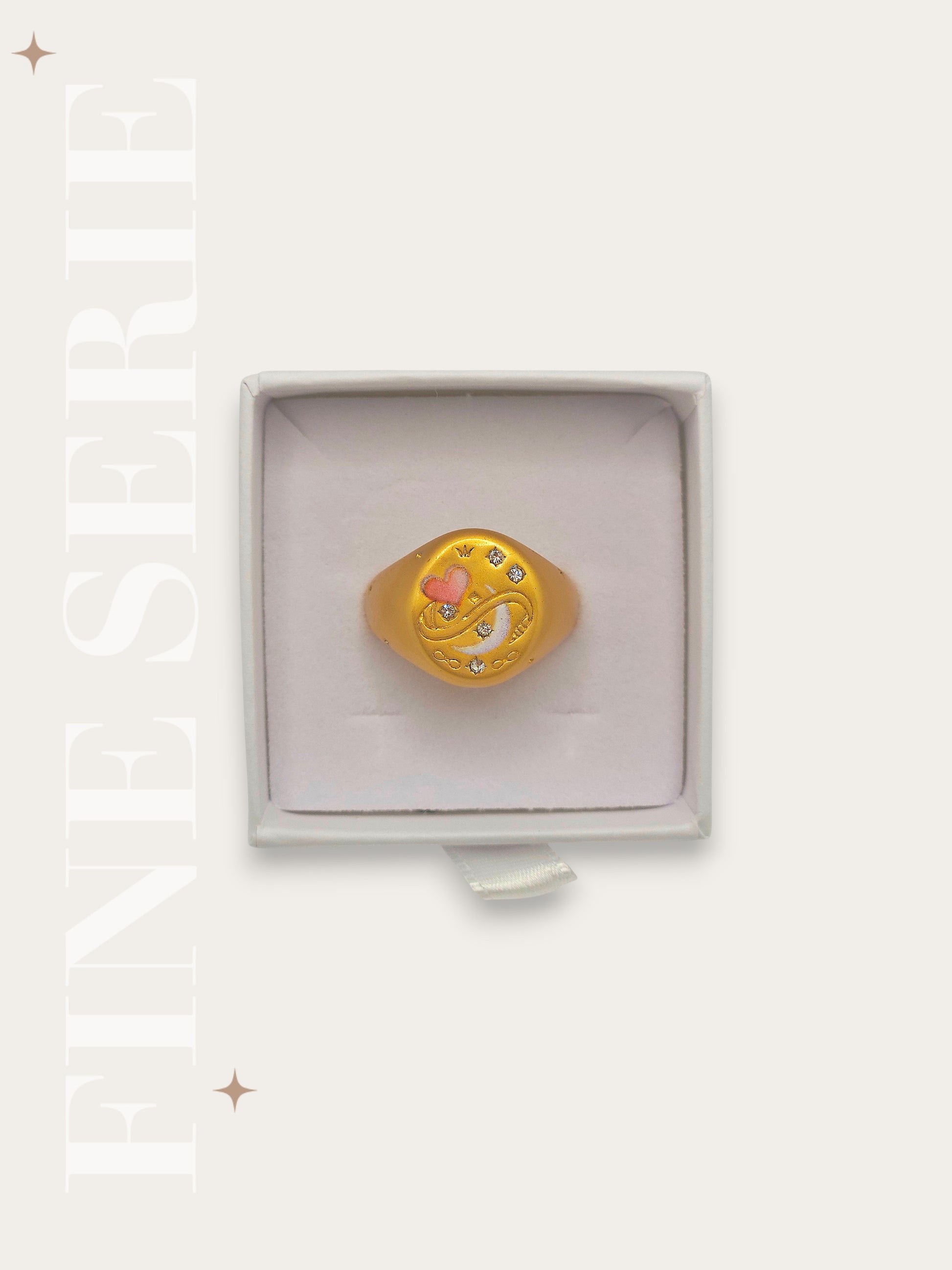 Non il solito anello in acciaio : placcato oro dalla finitura satinata e sofisticata. Le incisioni smaltate e i piccoli zirconi aggiungono carattere e luce, rendendolo diverso dai classici anelli dorati. Perfetto da indossare anche come chevalier.