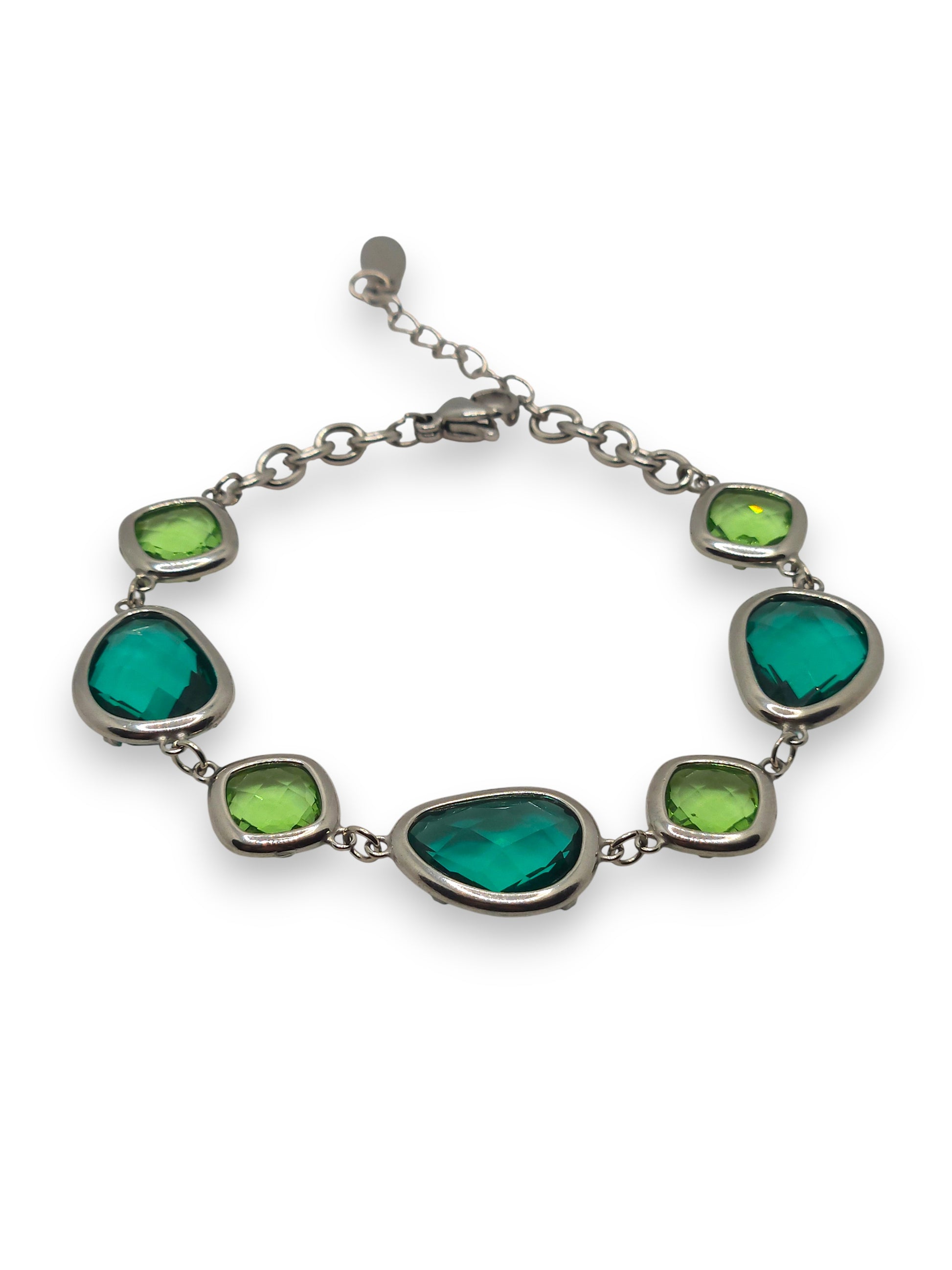 Bracciale in acciaio con cristalli colorati incastonati nella variante blu/azzurro, porpora/rosa, verde. Le forme morbide e irregolari donano un tocco elegante e femminile, perfetto per ogni occasione.