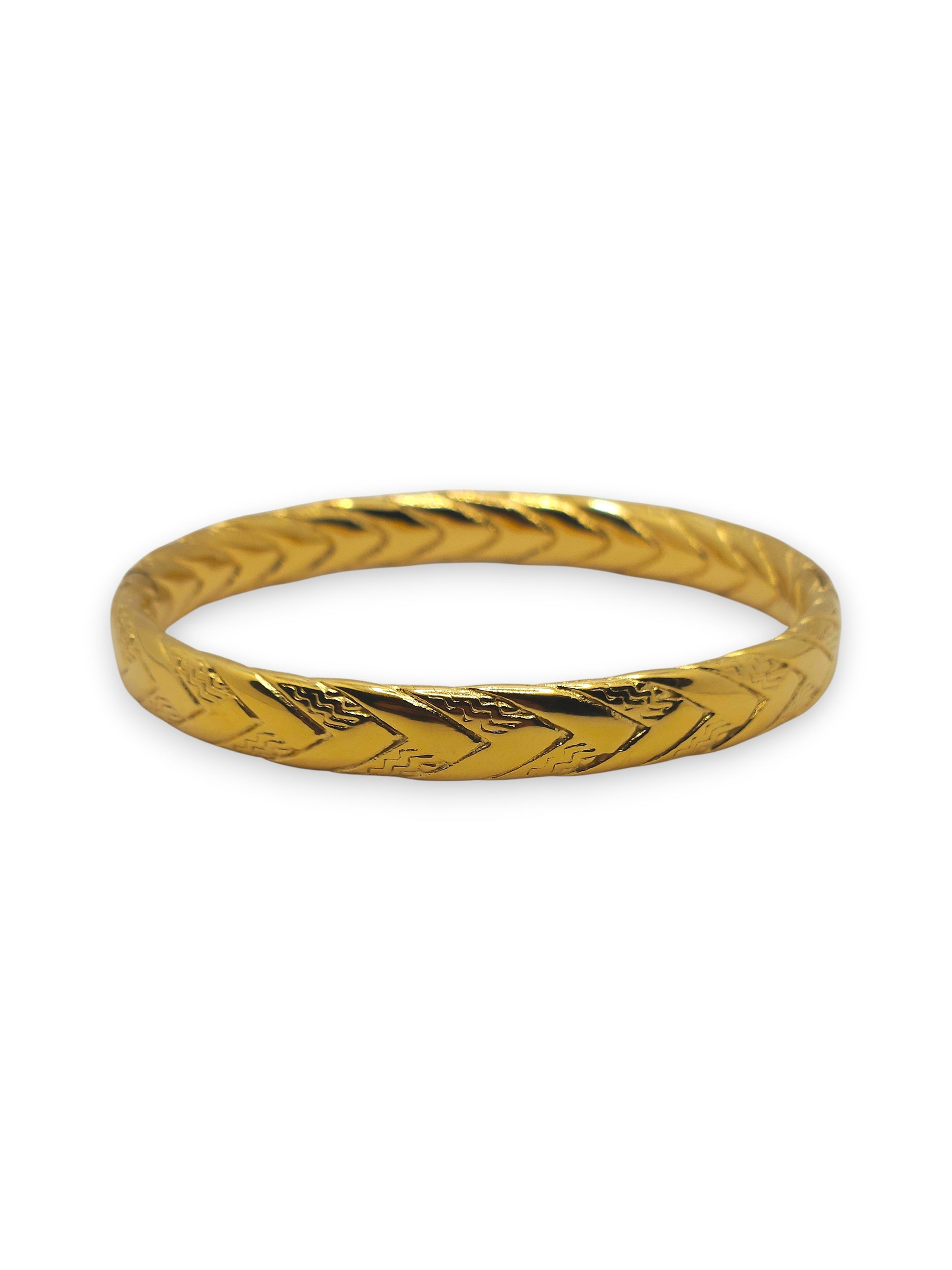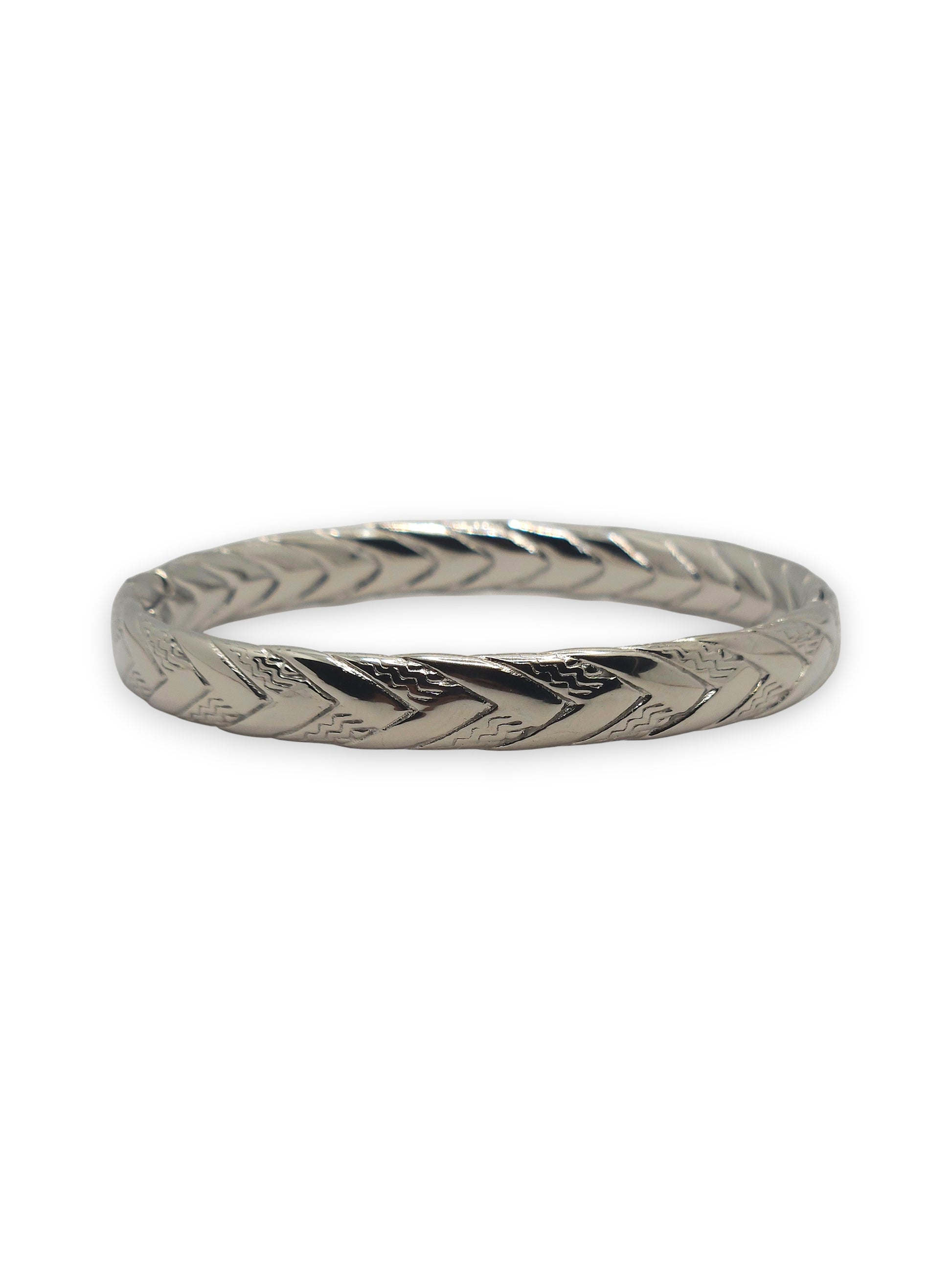 Bracciale rigido in acciaio con incisione a spina, dal design raffinato e dinamico. Un dettaglio sottile che illumina ogni movimento.