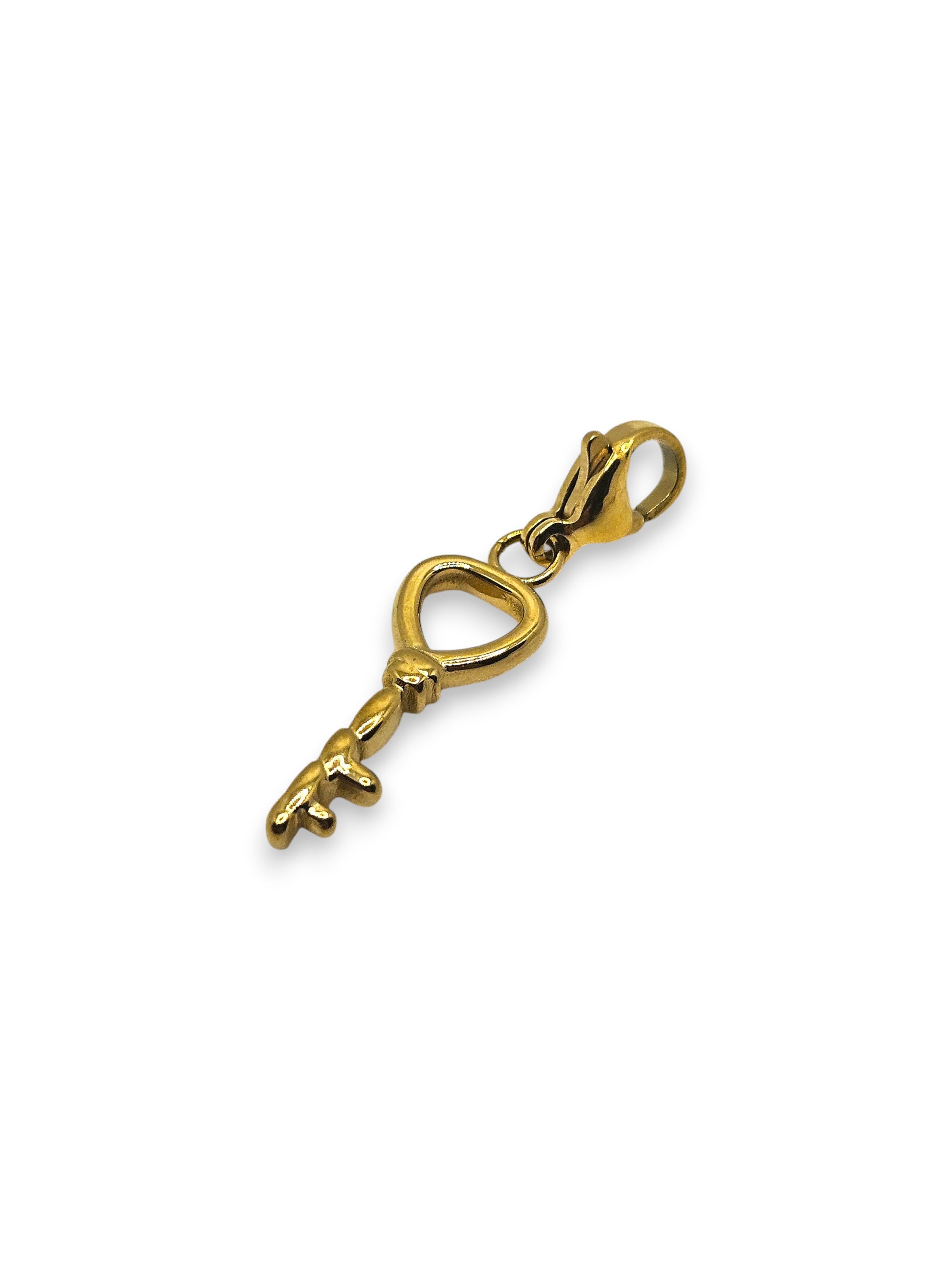 Ciondolo a forma di chiave con cuore, simbolo di amore e segreti custoditi. Puoi sceglierlo con gancio classico o moschettone per un’applicazione più comoda.