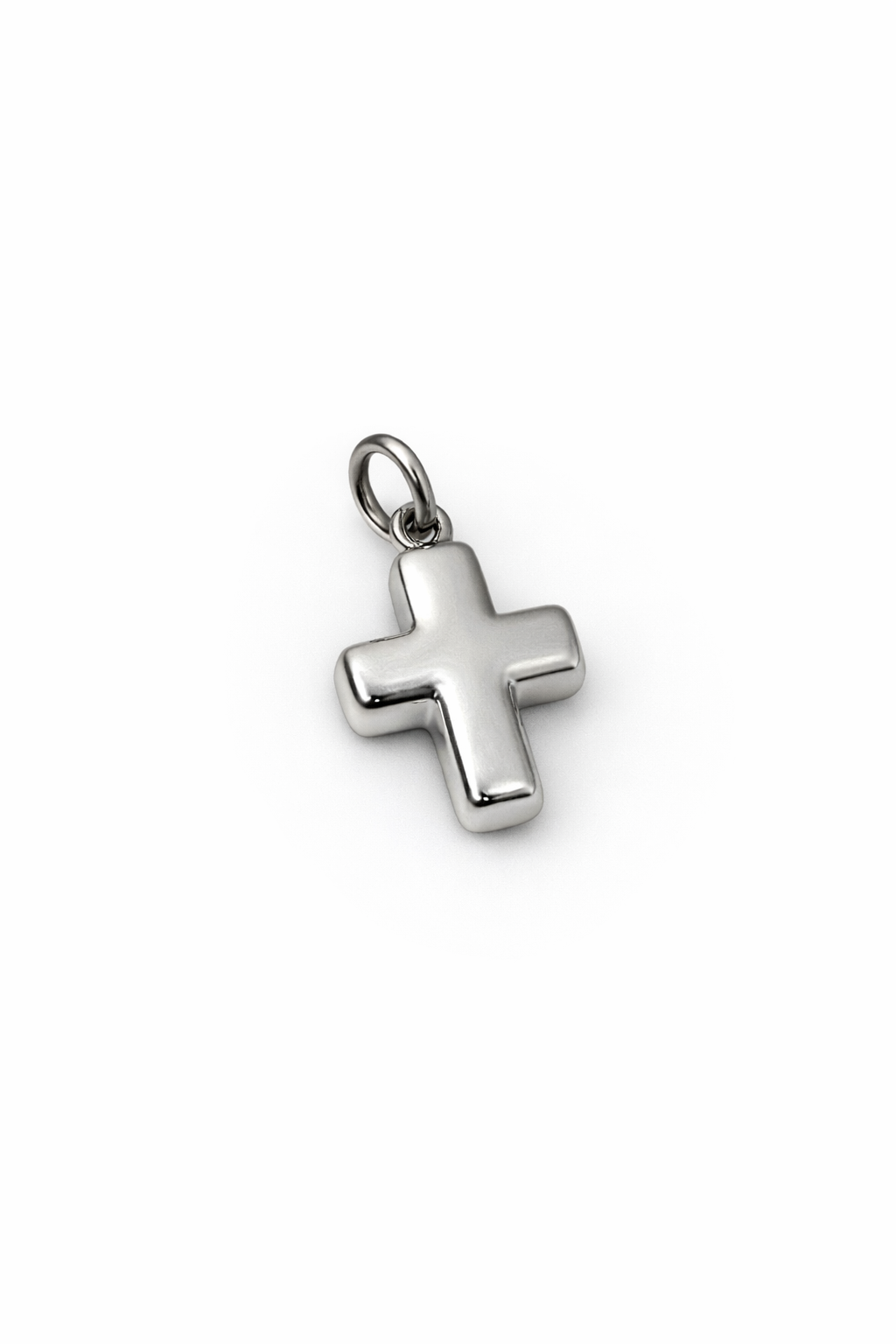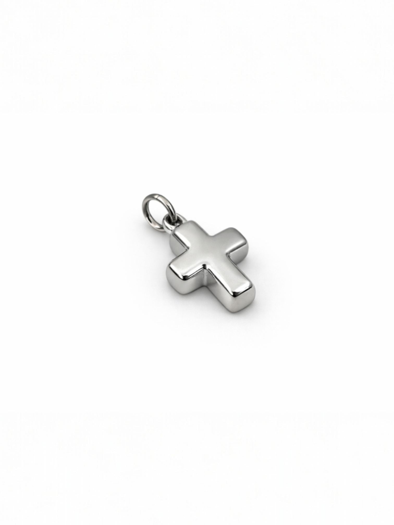 Un ciondolo a croce dalle linee morbide e piene, essenziale ma con presenza.