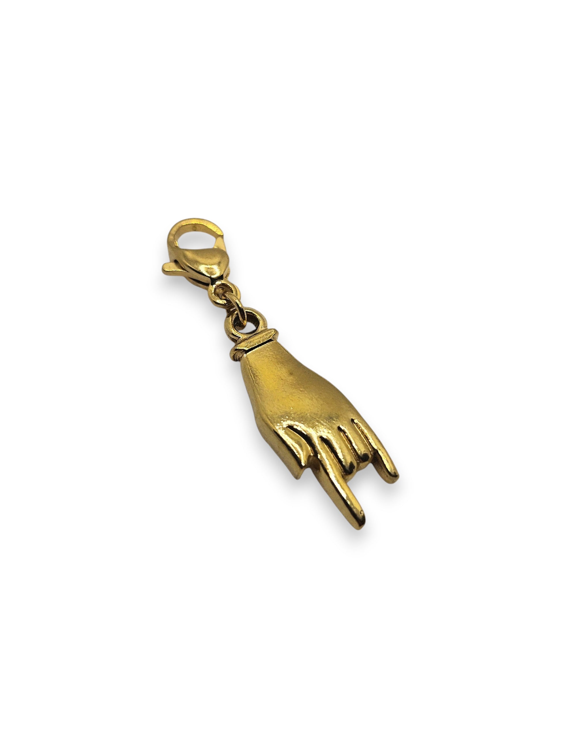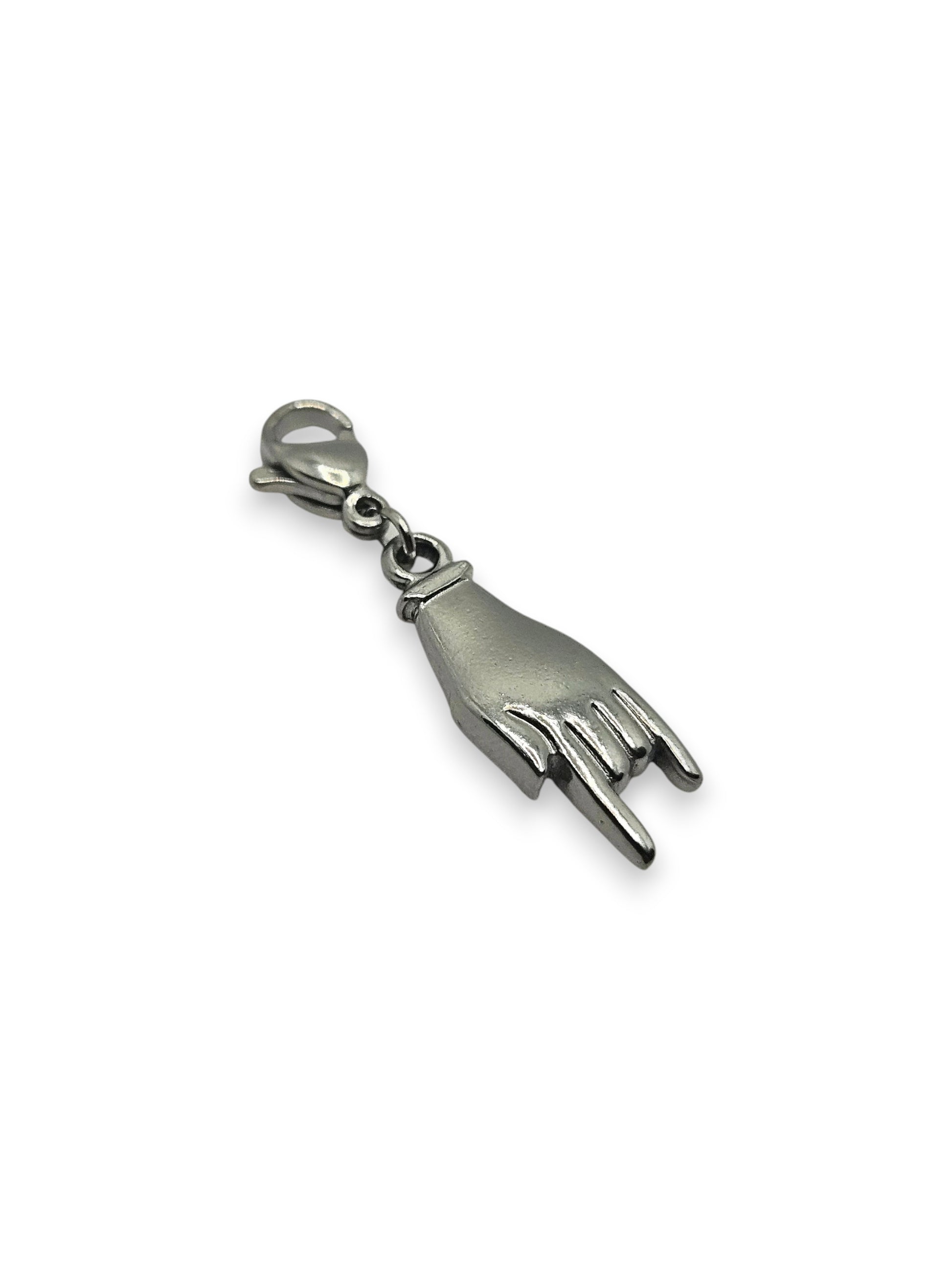 Ciondolo in acciaio raffigurante la mano con le corna, antico simbolo di protezione contro la sfortuna e amuleto di buon auspicio. Disponibile con moschettone o gancio tradizionale.
