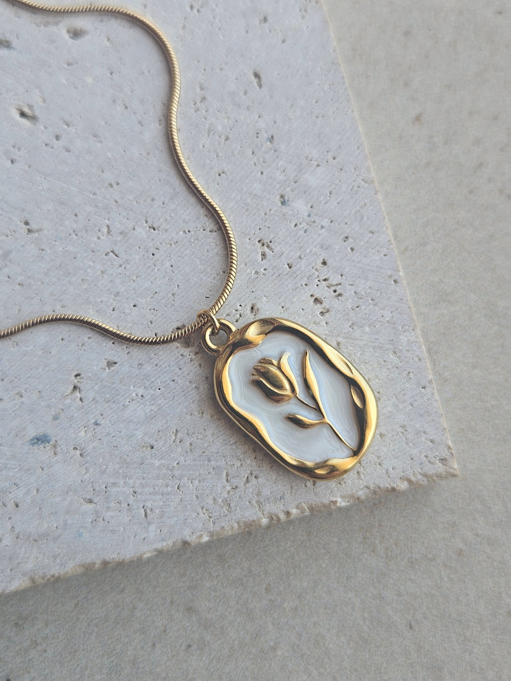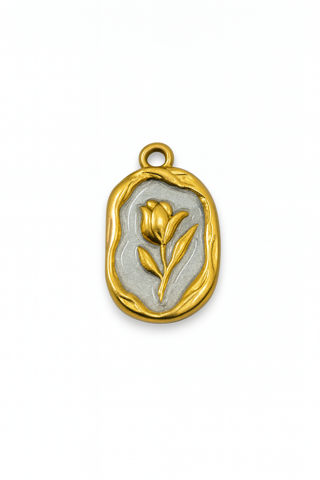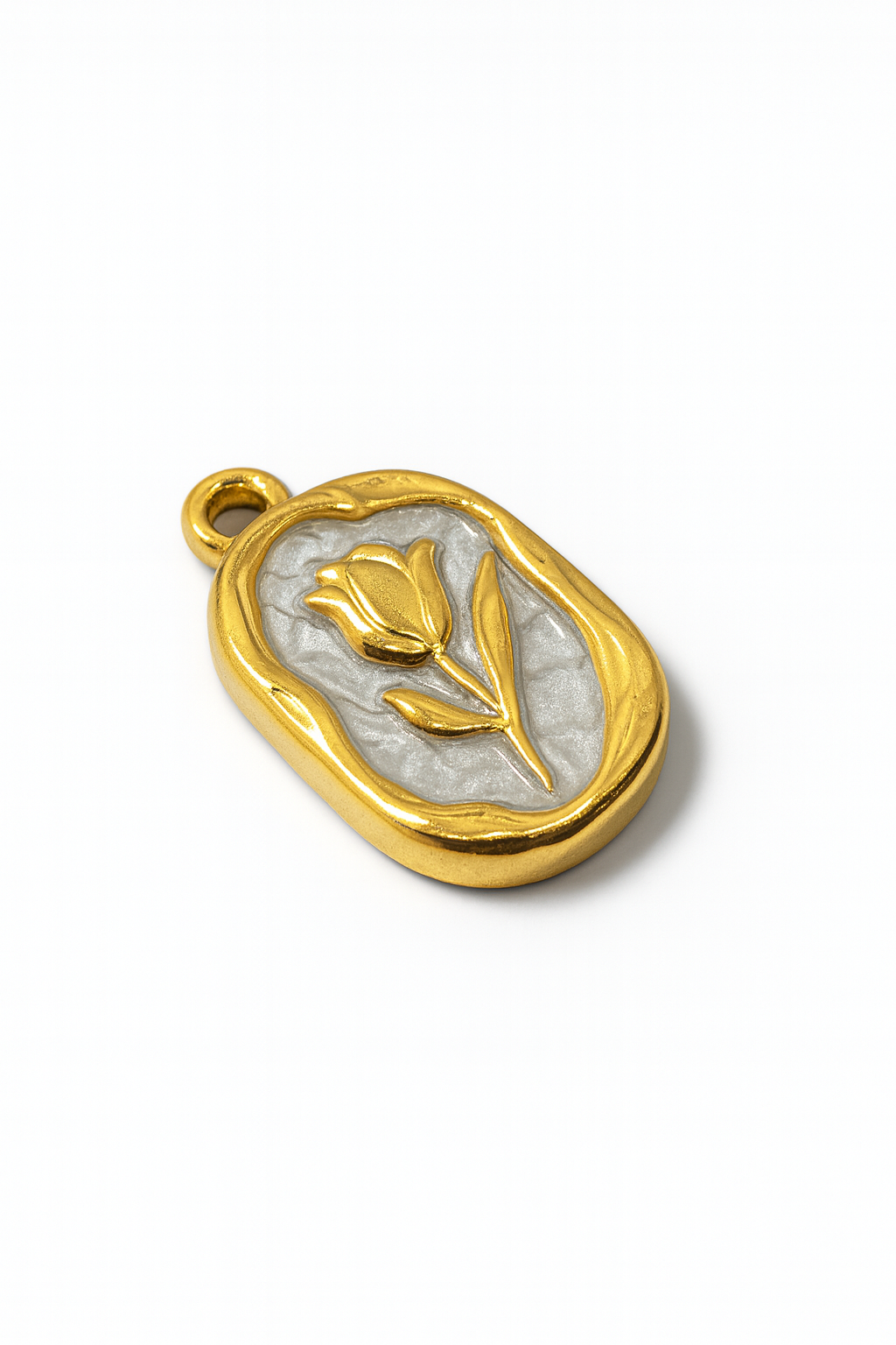 Ciondolo medaglietta effetto madreperla con tulipano, elegante e vintage.
