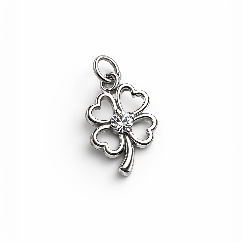 Ciondolo a quadrifoglio dal disegno leggero e armonioso, formato da quattro cuori aperti che si incontrano attorno a un punto luce centrale.