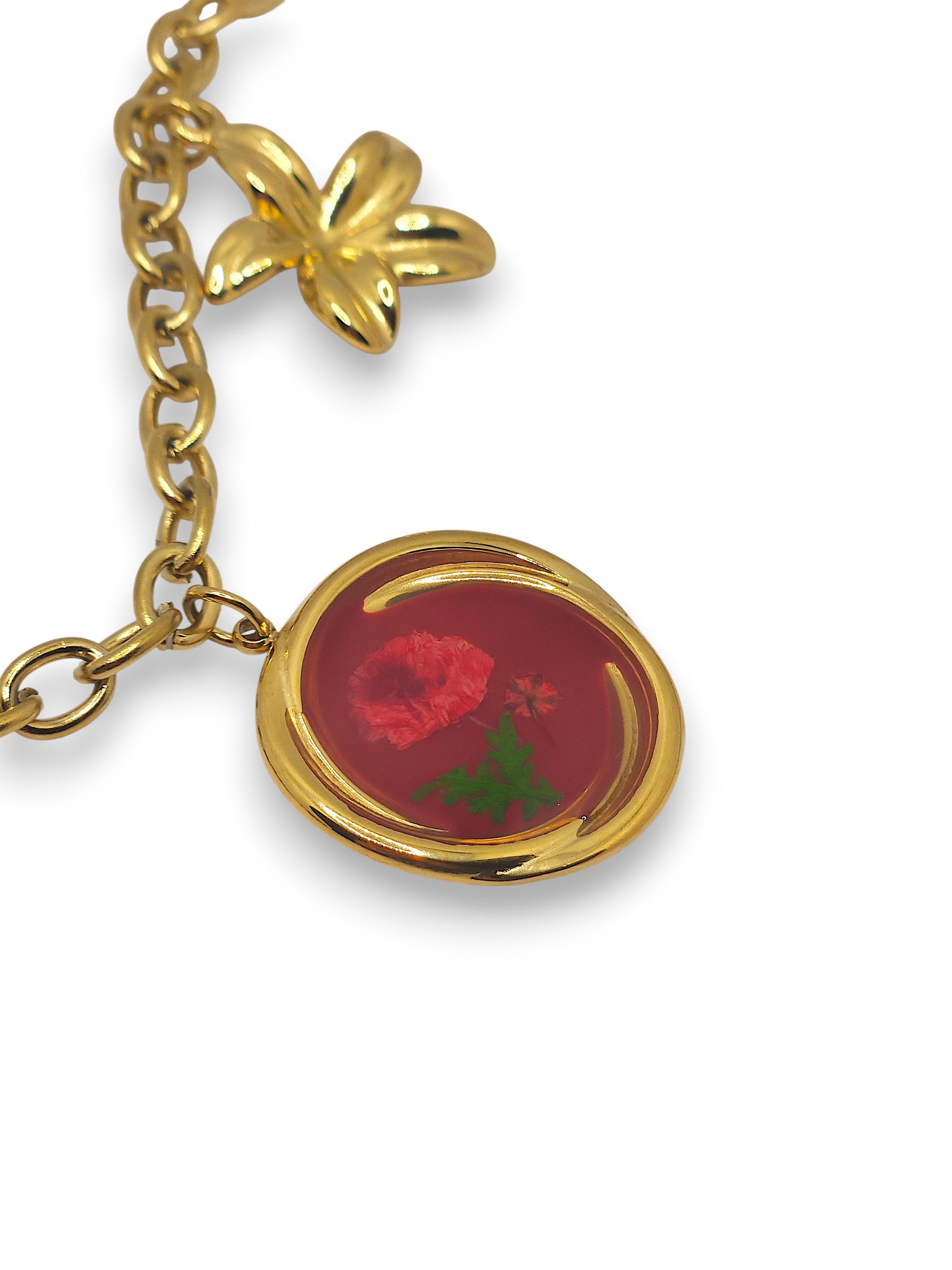 Una collana dal fascino poetico, delicata e preziosa come un cimelio. La catena dorata sostiene charms unici, ognuno diverso dall’altro, che custodiscono fiori secchi veri, racchiusi come piccoli giardini in miniatura. Accanto a loro, dettagli dorati e simboli botanici che illuminano il décolleté con eleganza.