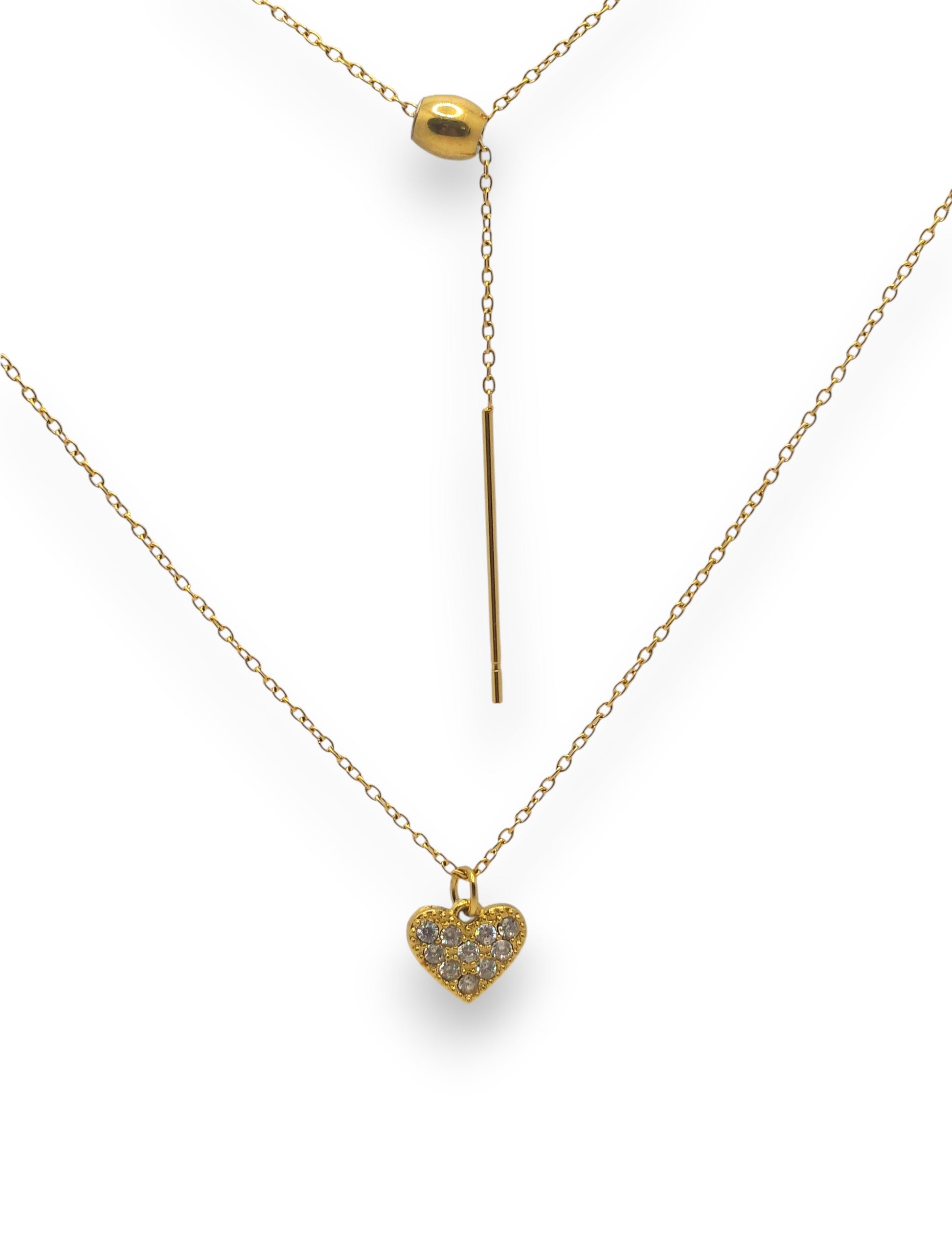 Collana con catena sottile in acciaio inox e ciondolino a cuore con zirconcini incastonati. Dotata di chiusura ad ago regolabile, consente di regolare facilmente la lunghezza per un comfort ottimale e un look sempre perfetto.