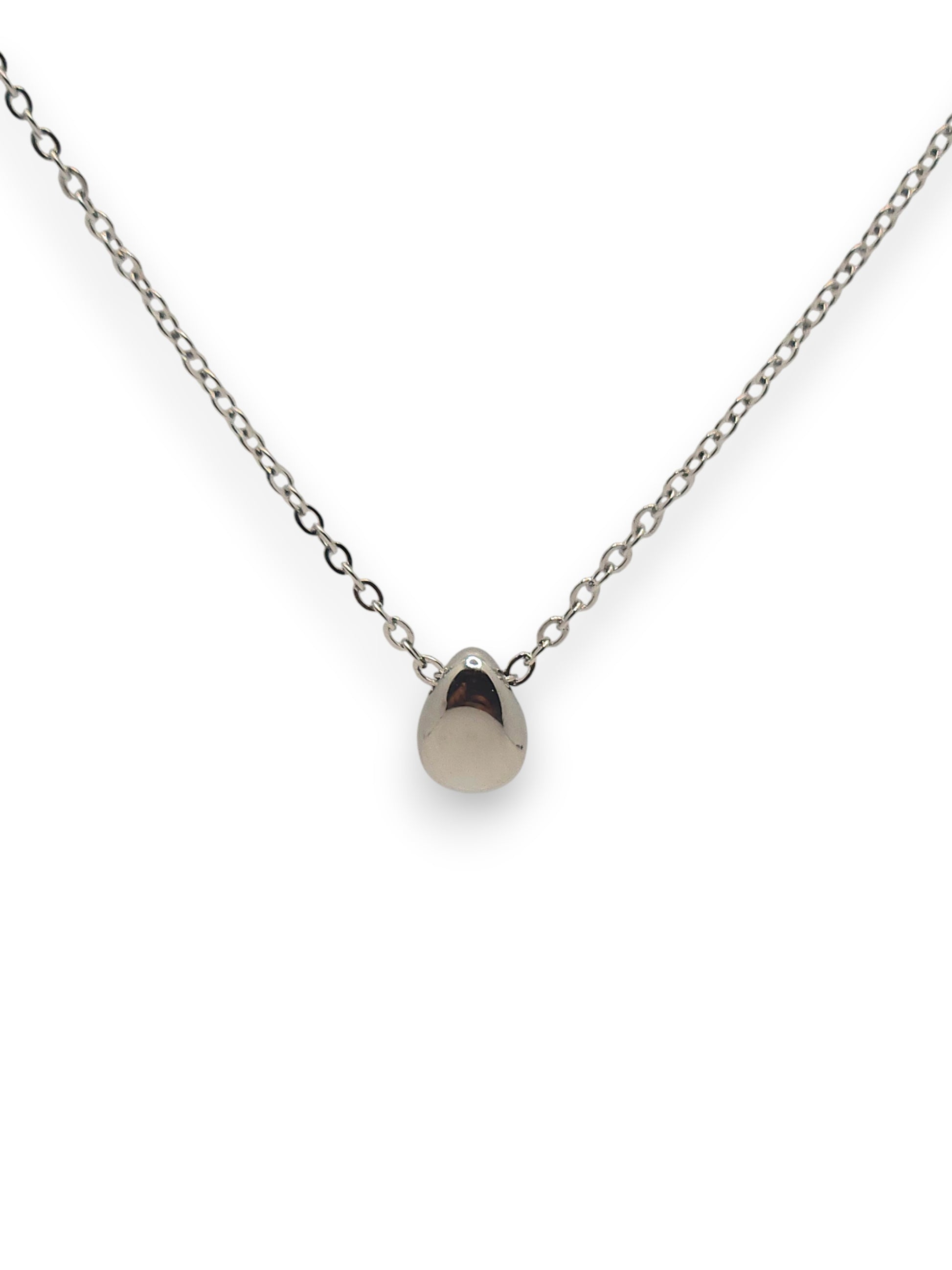 Collana in acciaio inox con piccolo ciondolo irregolare, lucido e tridimensionale che ricorda la forma di un avocado.