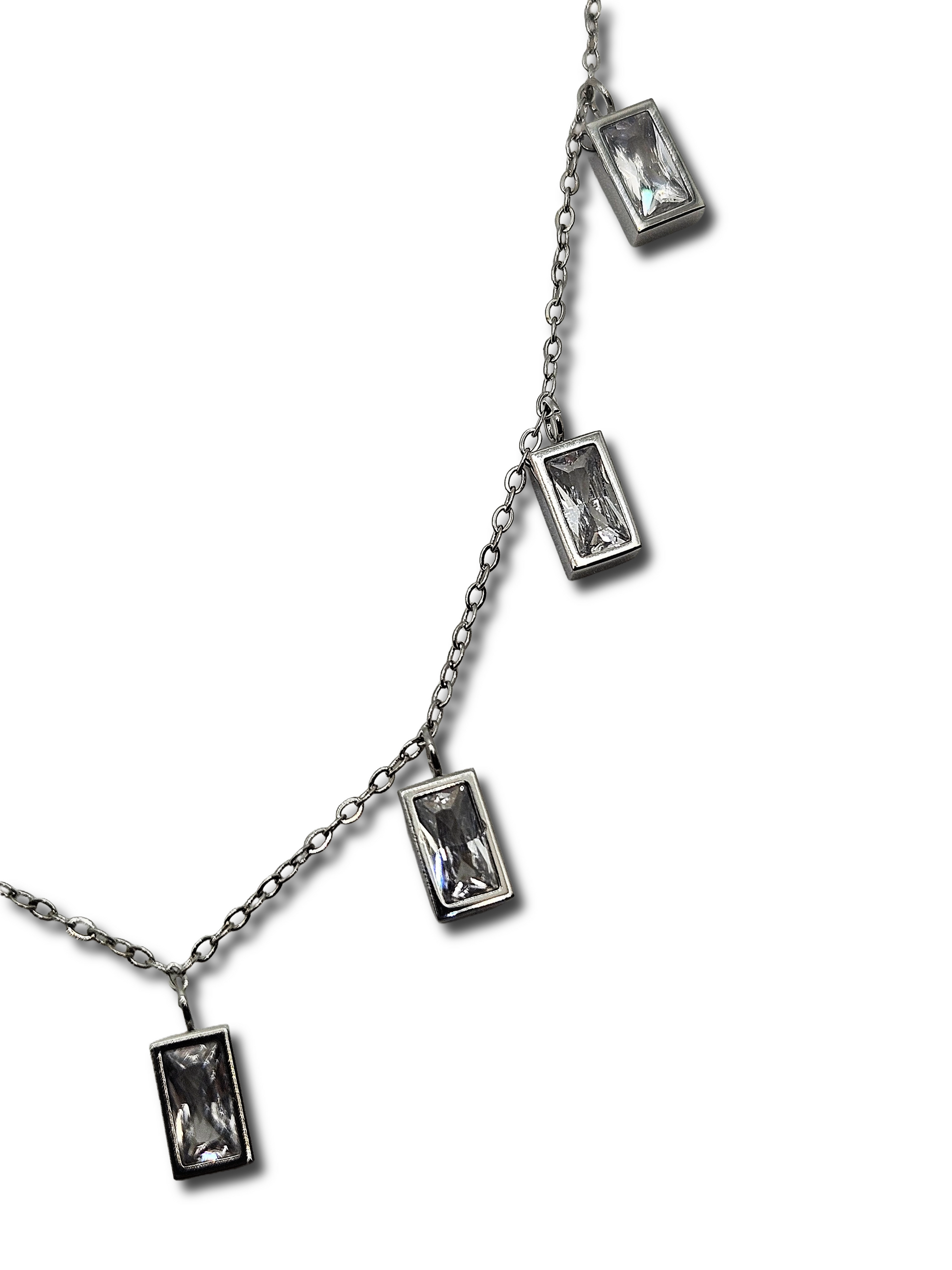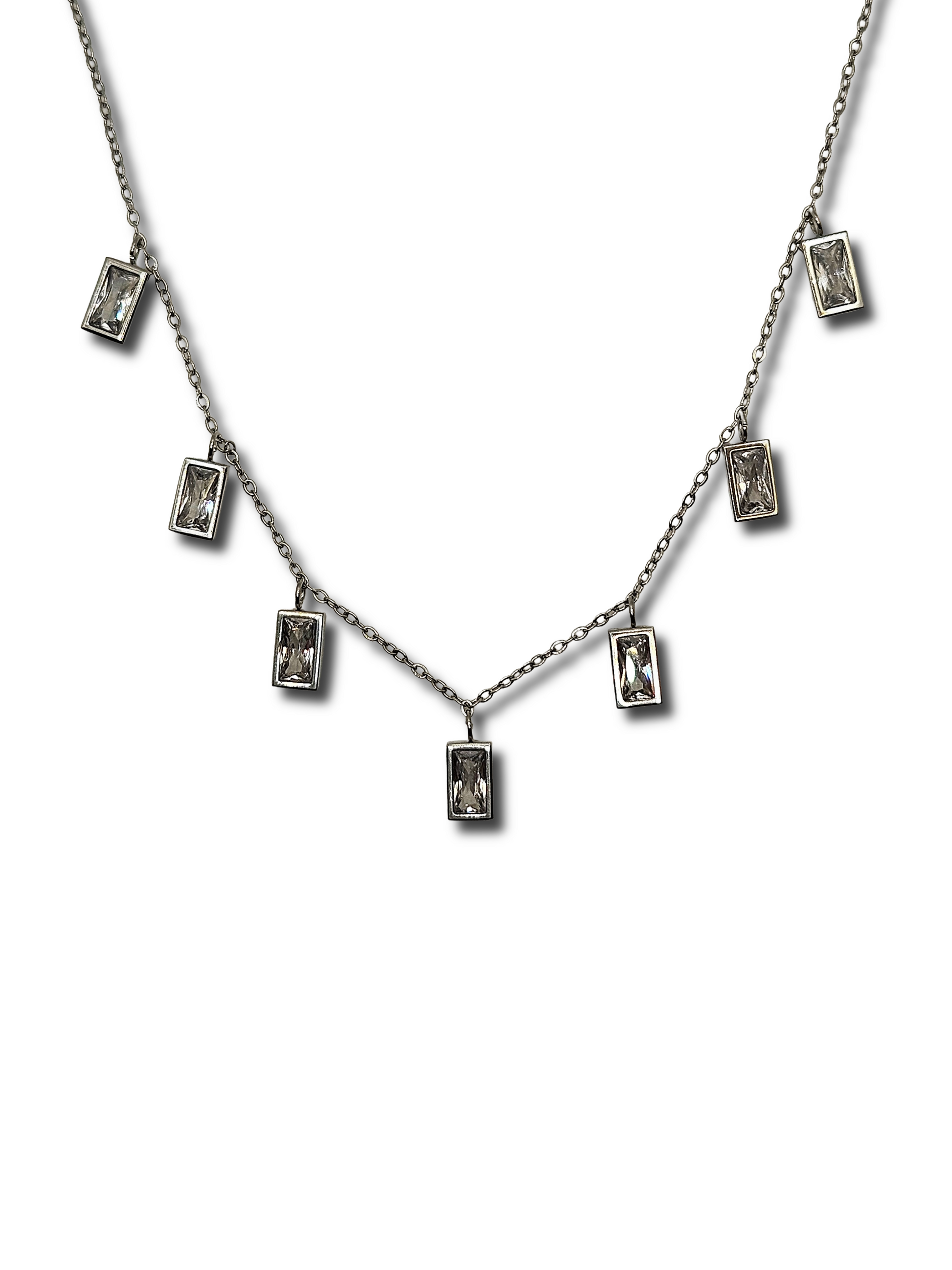 Collana luminosa con catena sottile in acciaio inox e pendenti baguette. Il design brillante e moderno la rende un gioiello ideale per occasioni speciali e look sofisticati.