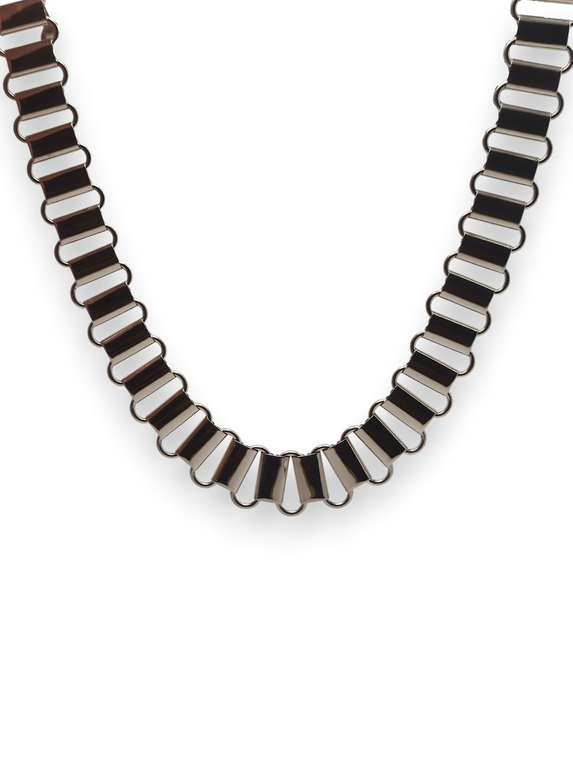 Una collana dal design geometrico contemporaneo, composta da elementi lucidi che creano un effetto visivo elegante e originale. L’estetica architettonica e pulita la rende perfetta per look urbani e sofisticati, aggiungendo un dettaglio fashion che non passa inosservato.