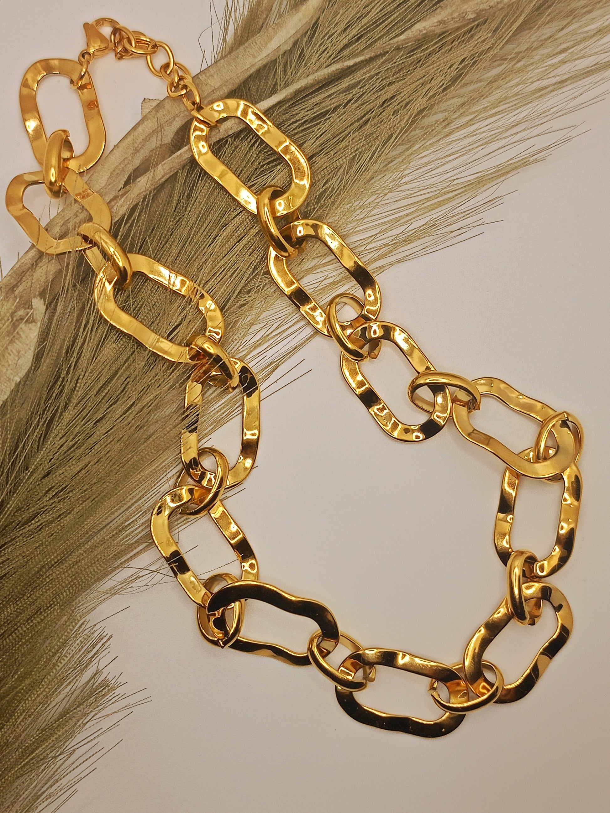 Collana dal design deciso e contemporaneo caratterizzata da grandi maglie martellate. Un gioiello dal fascino audace e sofisticato, perfetto per valorizzare anche i look più minimal con un tocco di carattere e originalità. Leggera ma d’effetto, è ideale da indossare sia da sola come protagonista sia abbinata ad altre collane per un effetto stratificato.