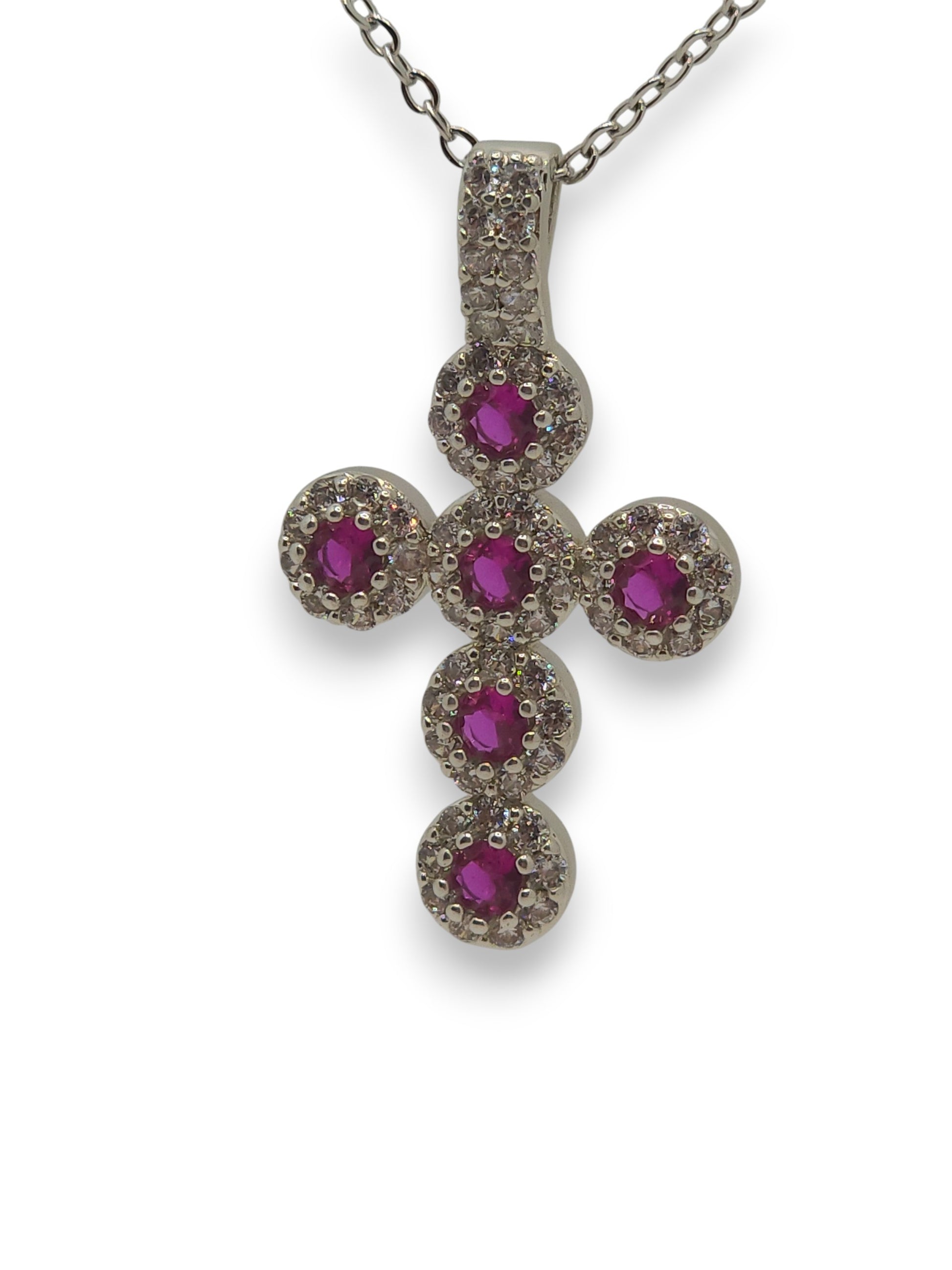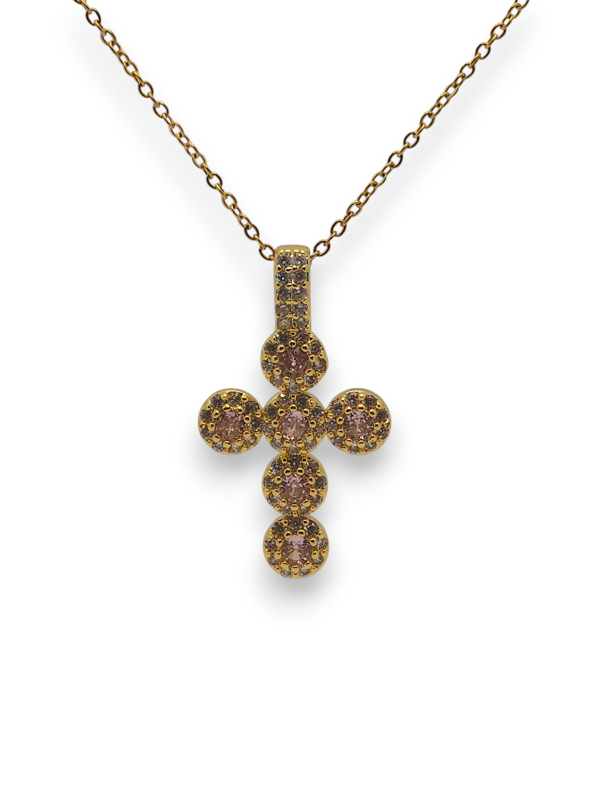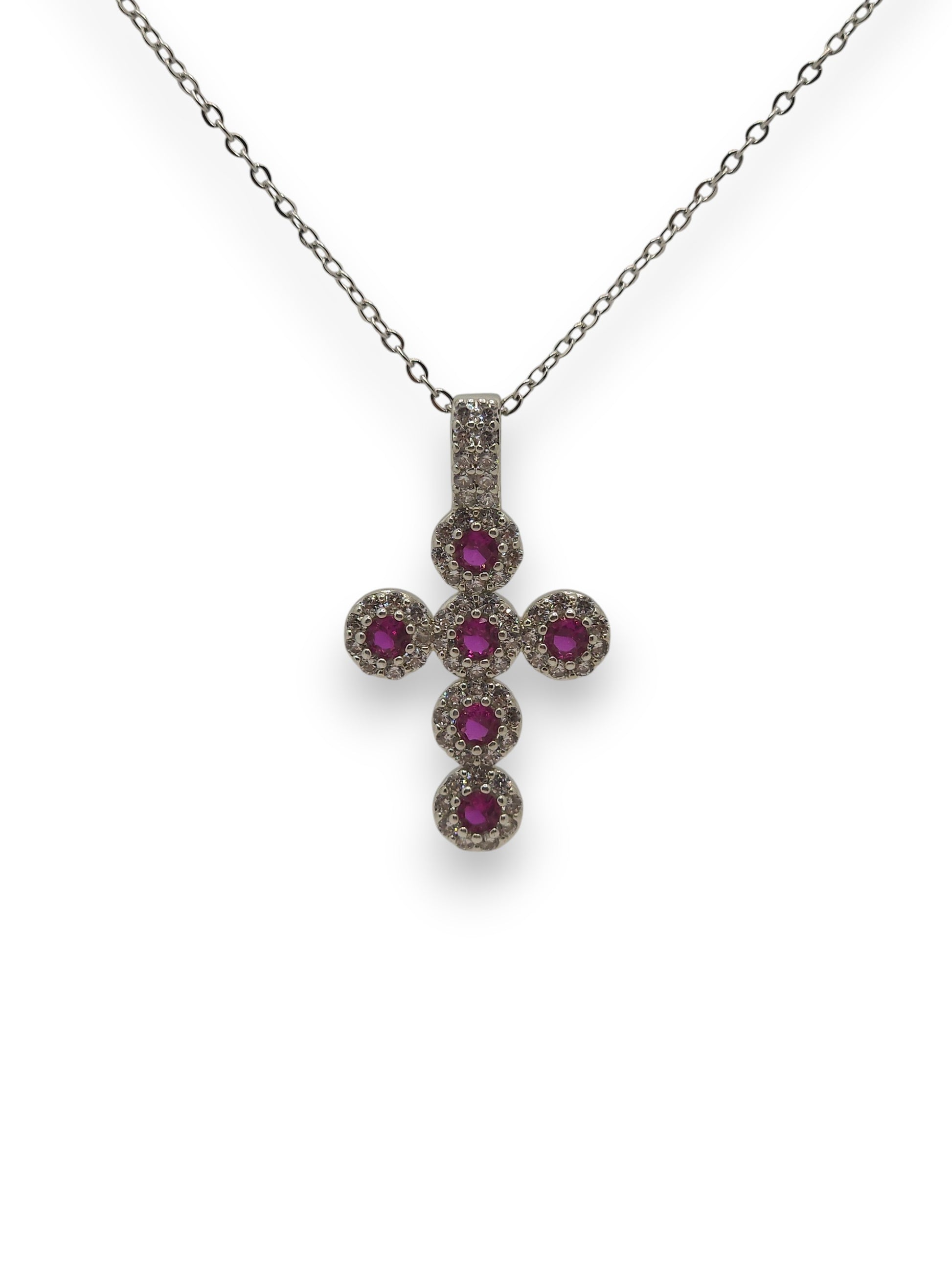 Un’elegante collana con pendente a croce, impreziosita da luminosi zirconi incastonati ( rosa, azzurri, fuxia ). Un gioiello dal design raffinato che unisce simbolismo e stile senza tempo.