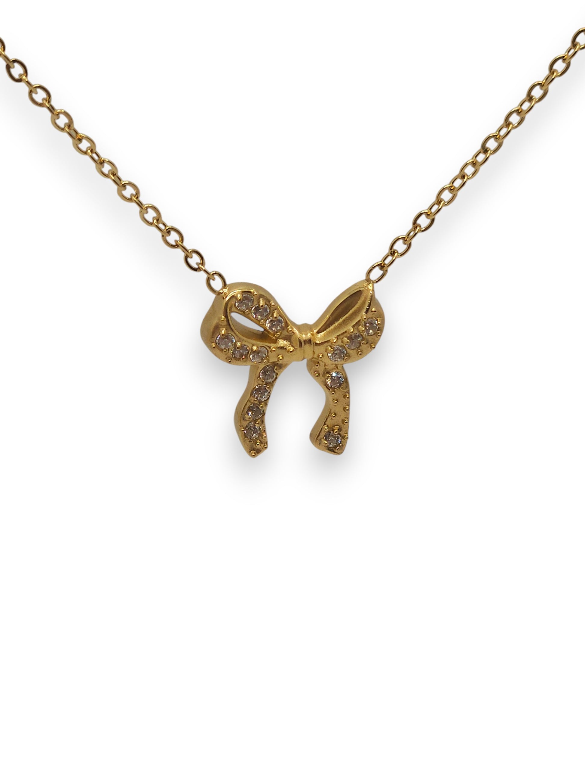 Deliziosa collana con pendente a fiocco, illuminato da una cascata di zirconi trasparenti che donano luce e femminilità. Romantica e versatile, ideale da indossare ogni giorno o in occasioni speciali.