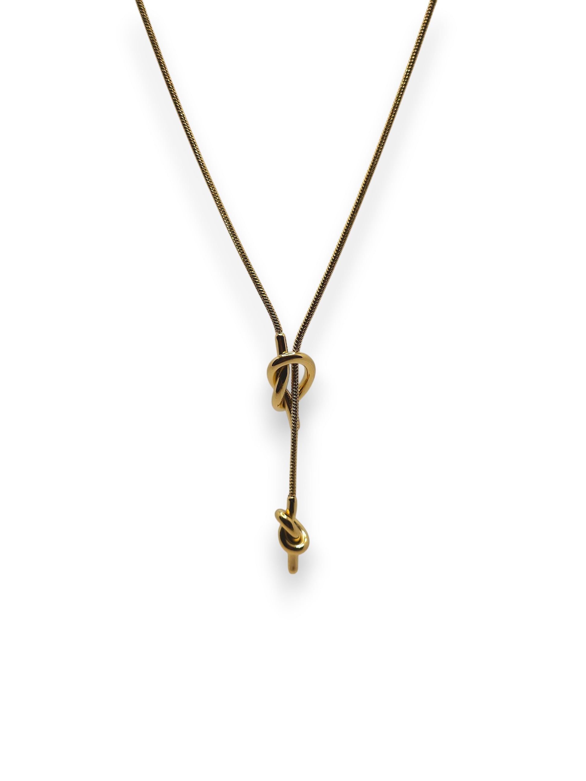 Una collana dal design minimal e raffinato impreziosita da un elegante dettaglio a nodo, simbolo di legame e armonia. La struttura sottile e fluida avvolge il collo con eleganza senza tempo, rendendola perfetta per ogni occasione. Un gioiello versatile e ricco di significato, ideale da regalare o indossare ogni giorno.