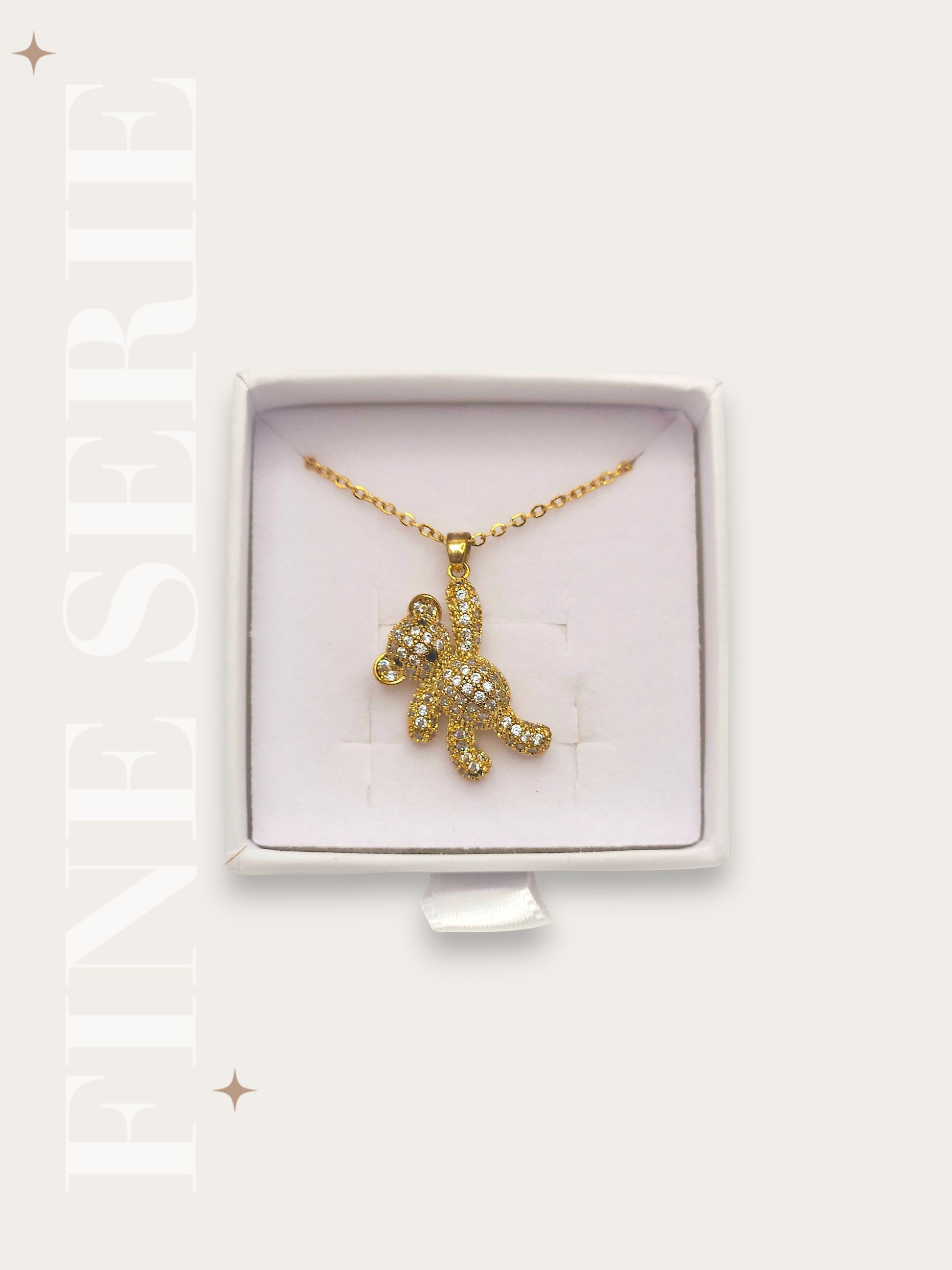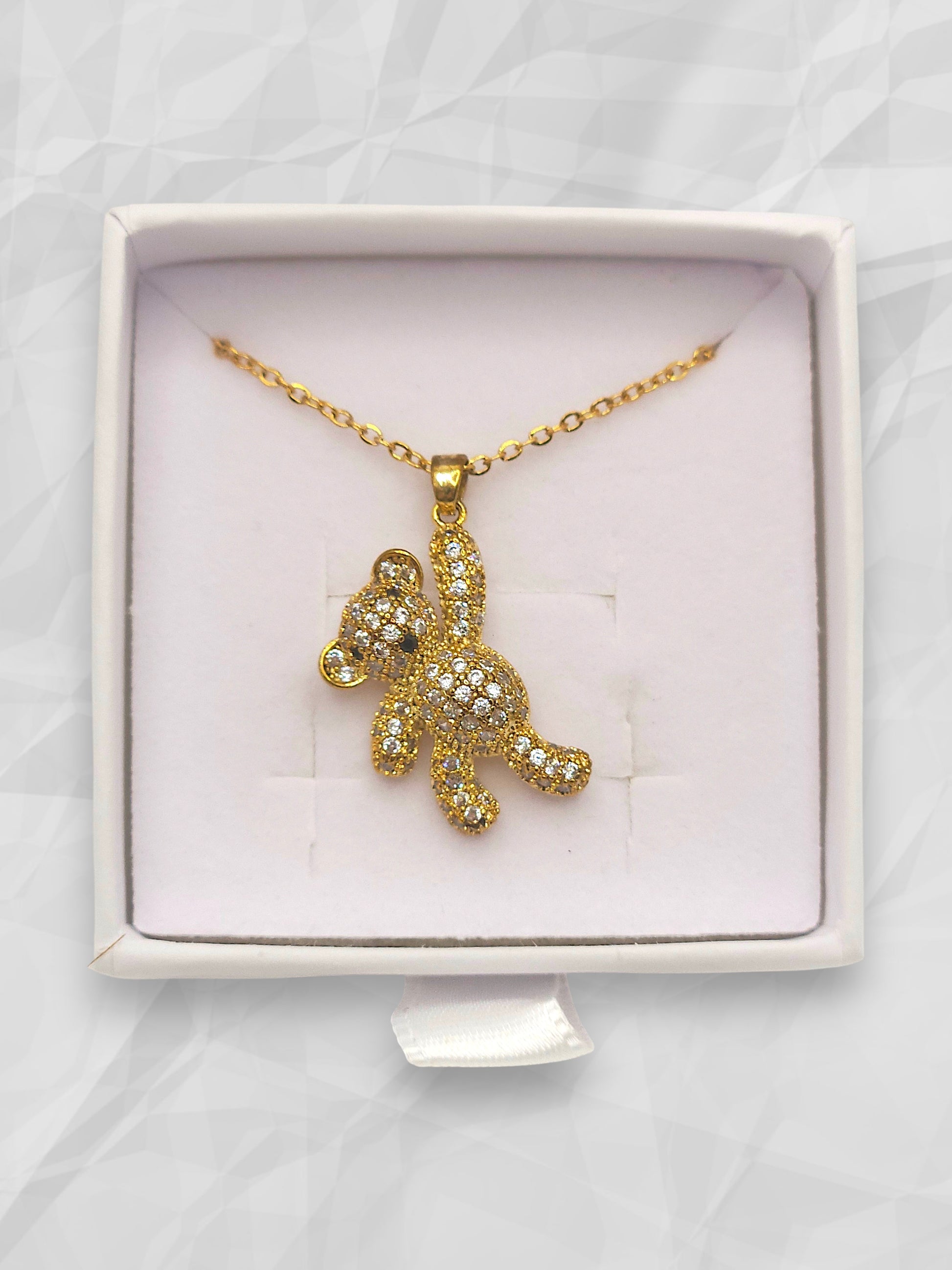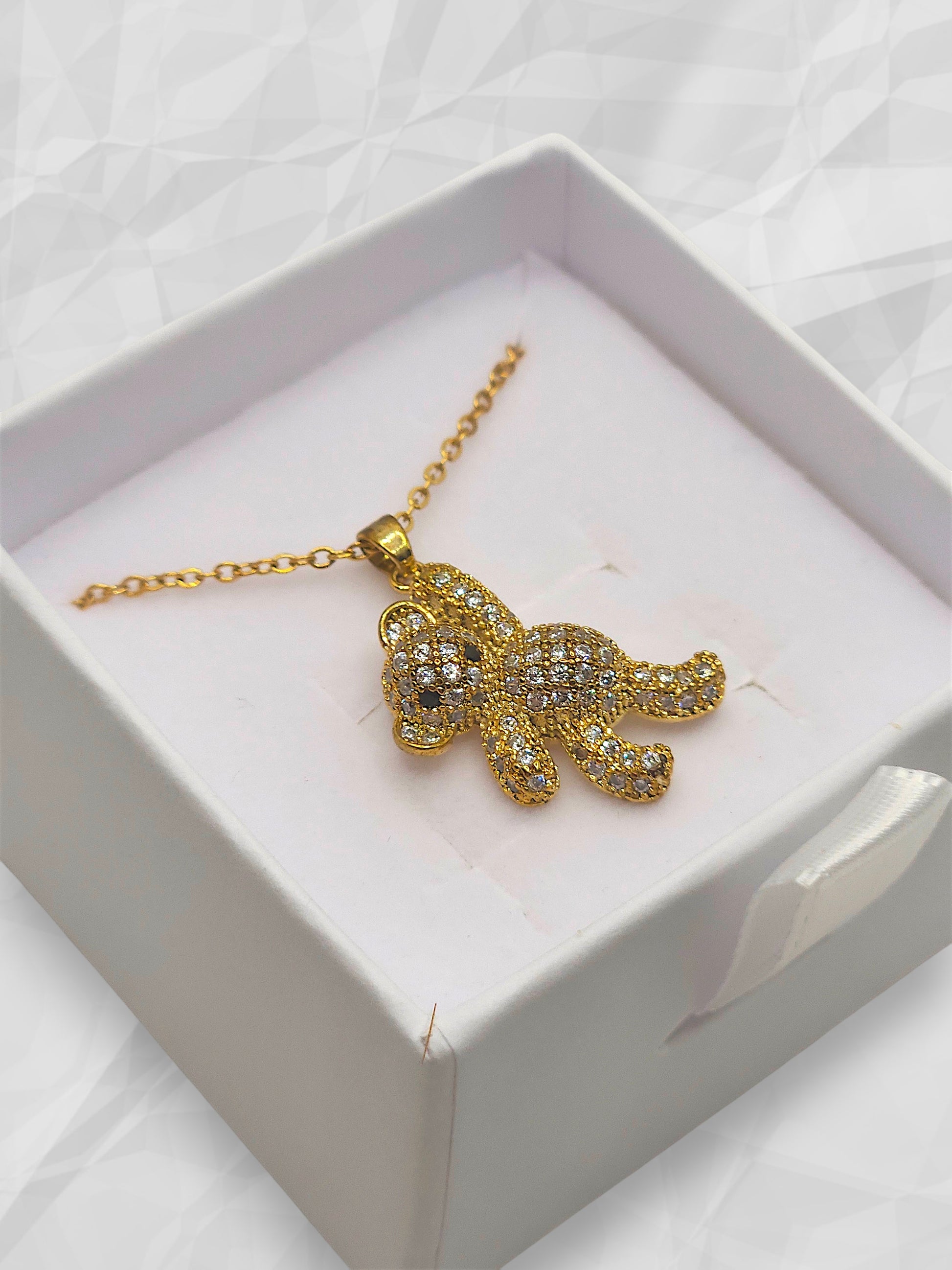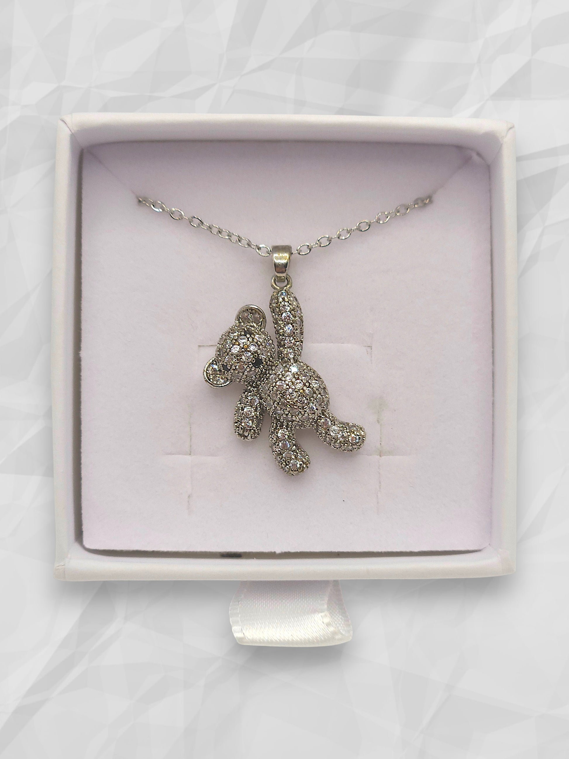 Collana con ciondolo a forma di orsetto interamente impreziosito da zirconi luminosi.