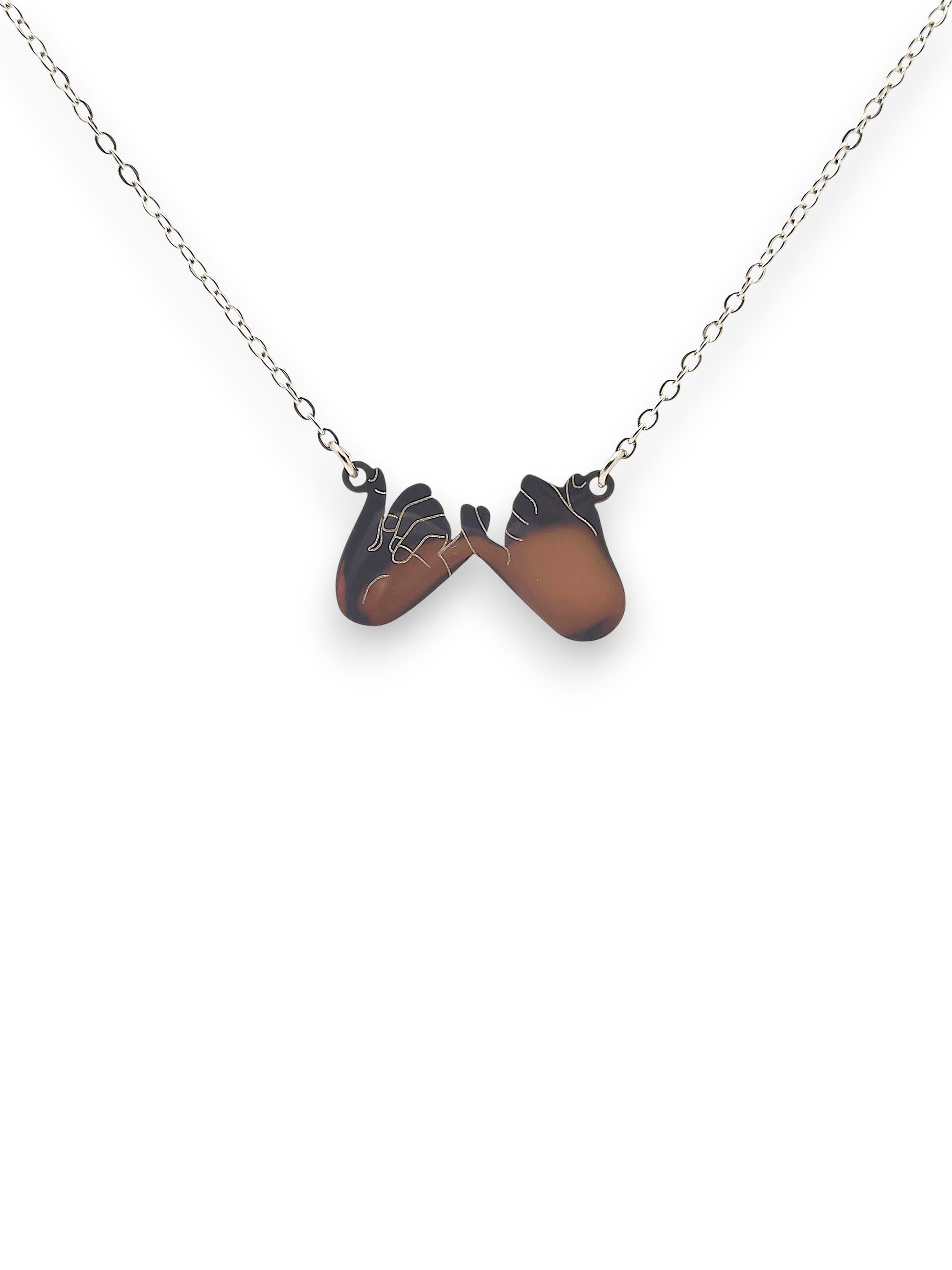 Pinky promise? Collana unica e simbolica realizzata in acciaio inox con un pendente raffigurante due mani che stringono la loro promessa con i mignoli, emblema di connessione e legame profondo.