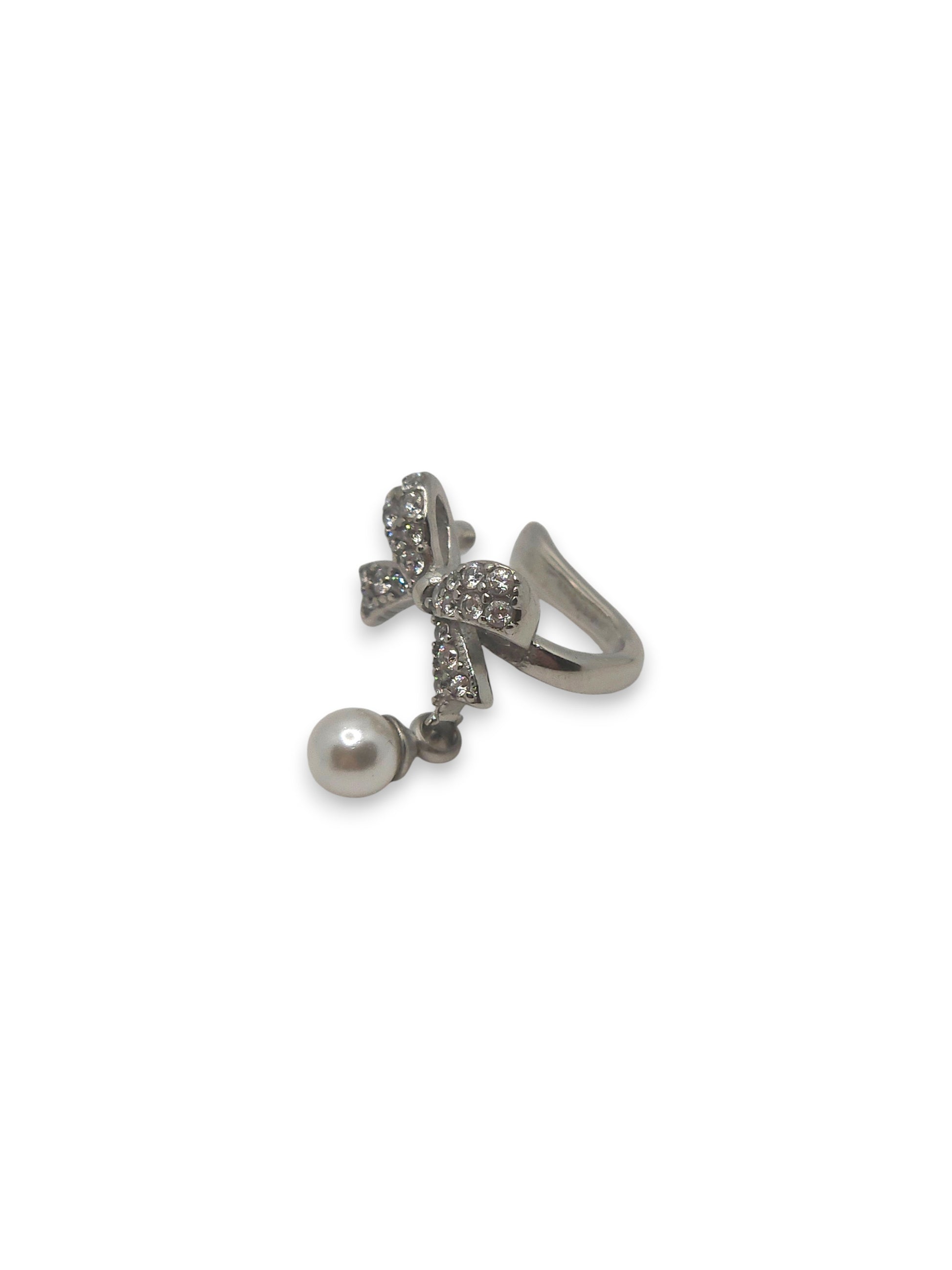 Un ear cuff rifinito da un fiocco pavé scintillante e una piccola perla pendente che aggiunge movimento e grazia. Un mix perfetto tra romanticismo e brillantezza, ideale da indossare da solo o in combinazione con altri orecchini.