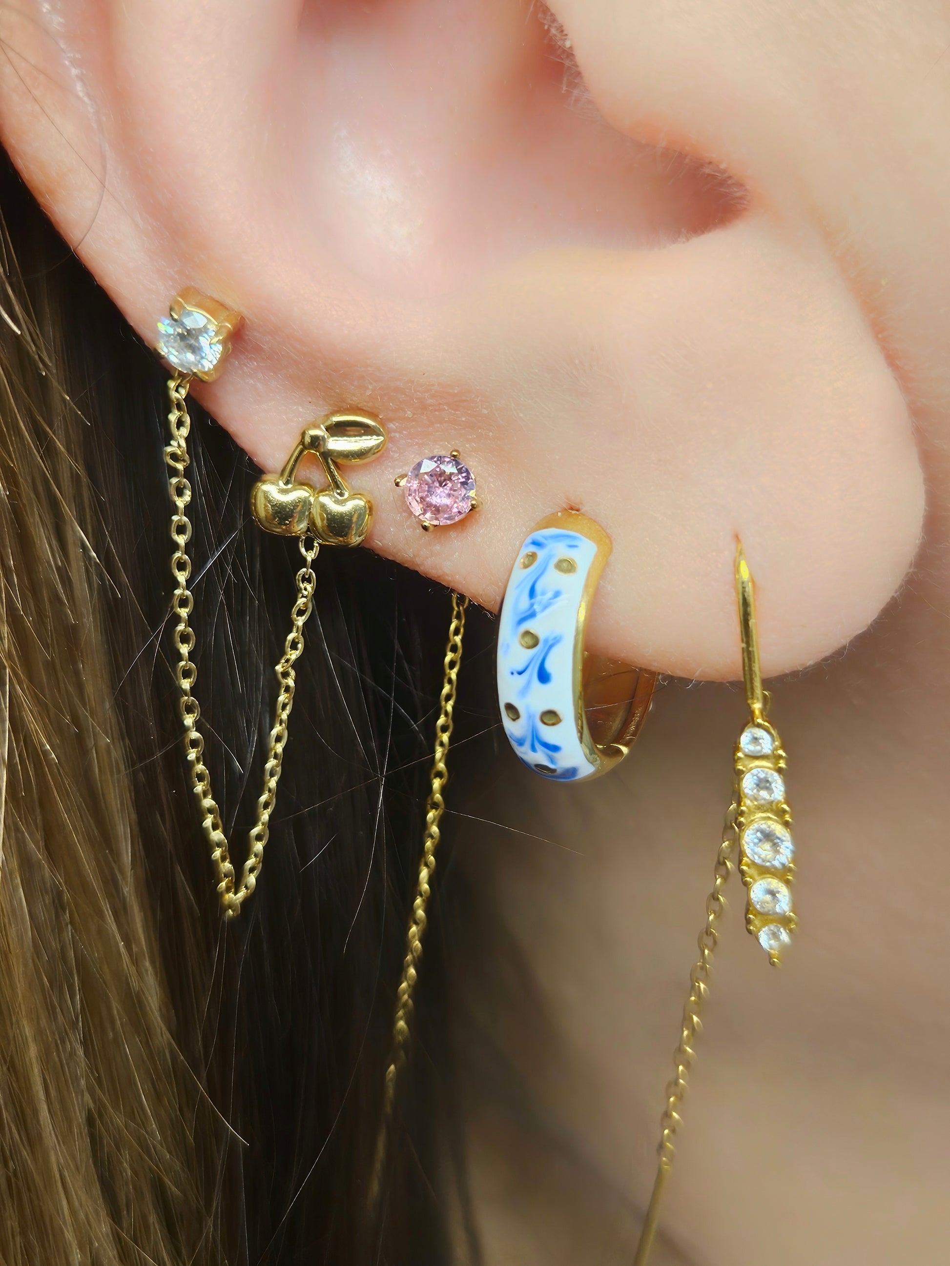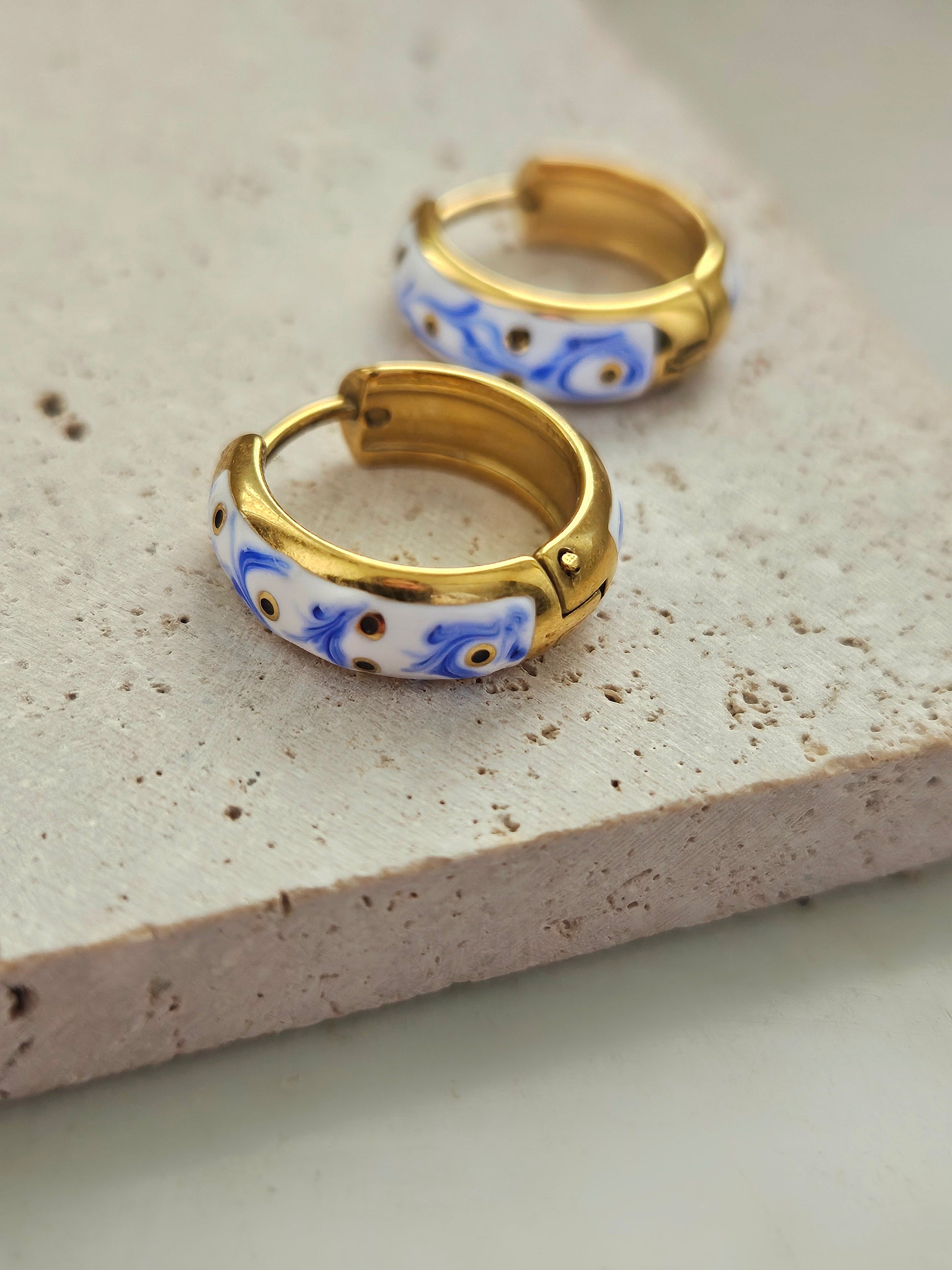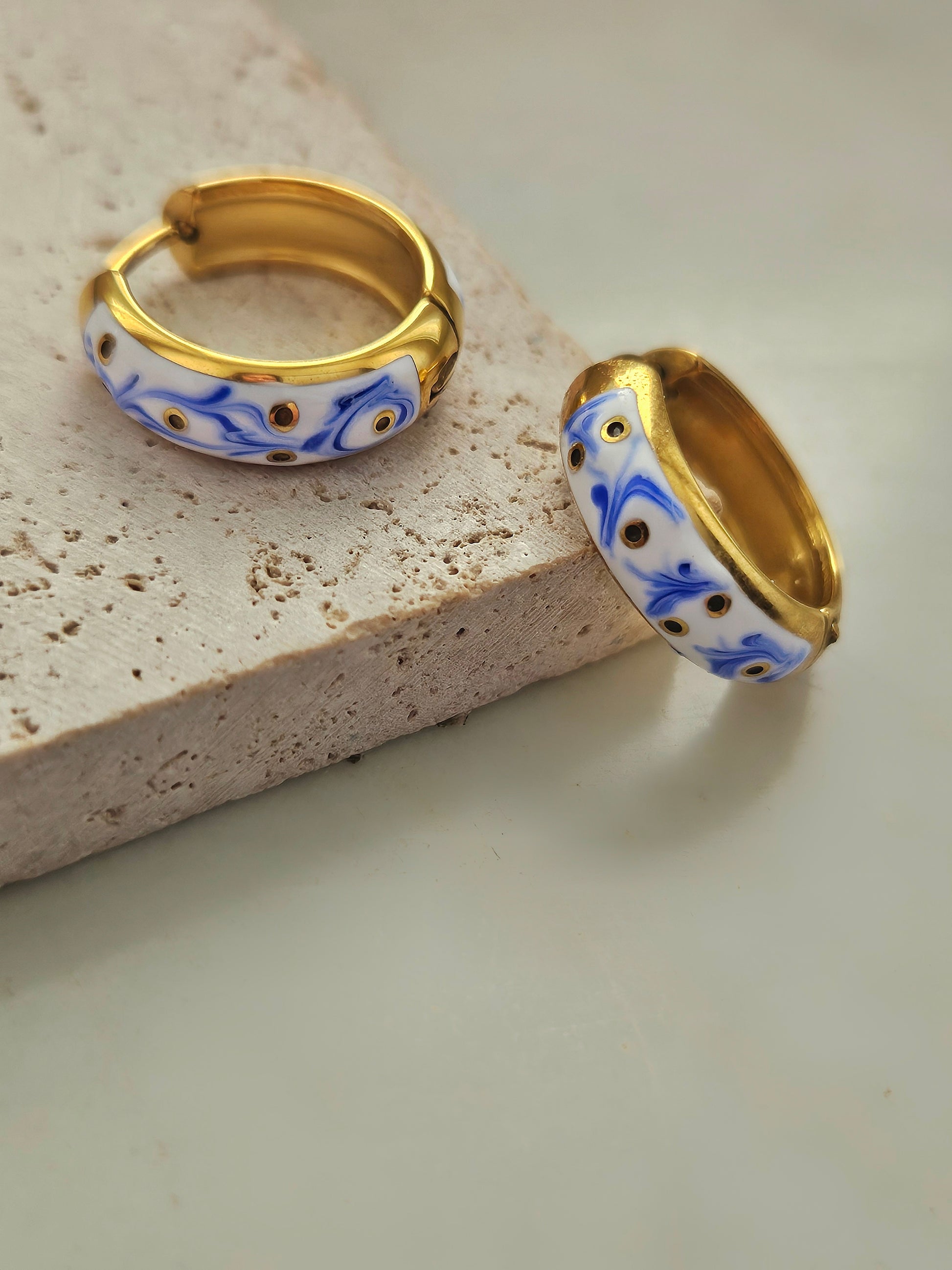Cerchi in acciaio dorato con smalto bianco e decori blu in stile floreale. Originali e raffinati, un dettaglio unico che cattura lo sguardo.