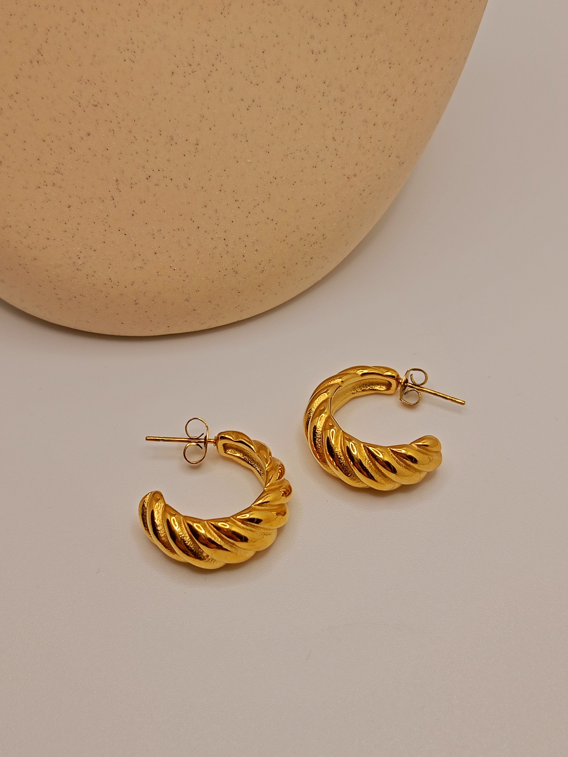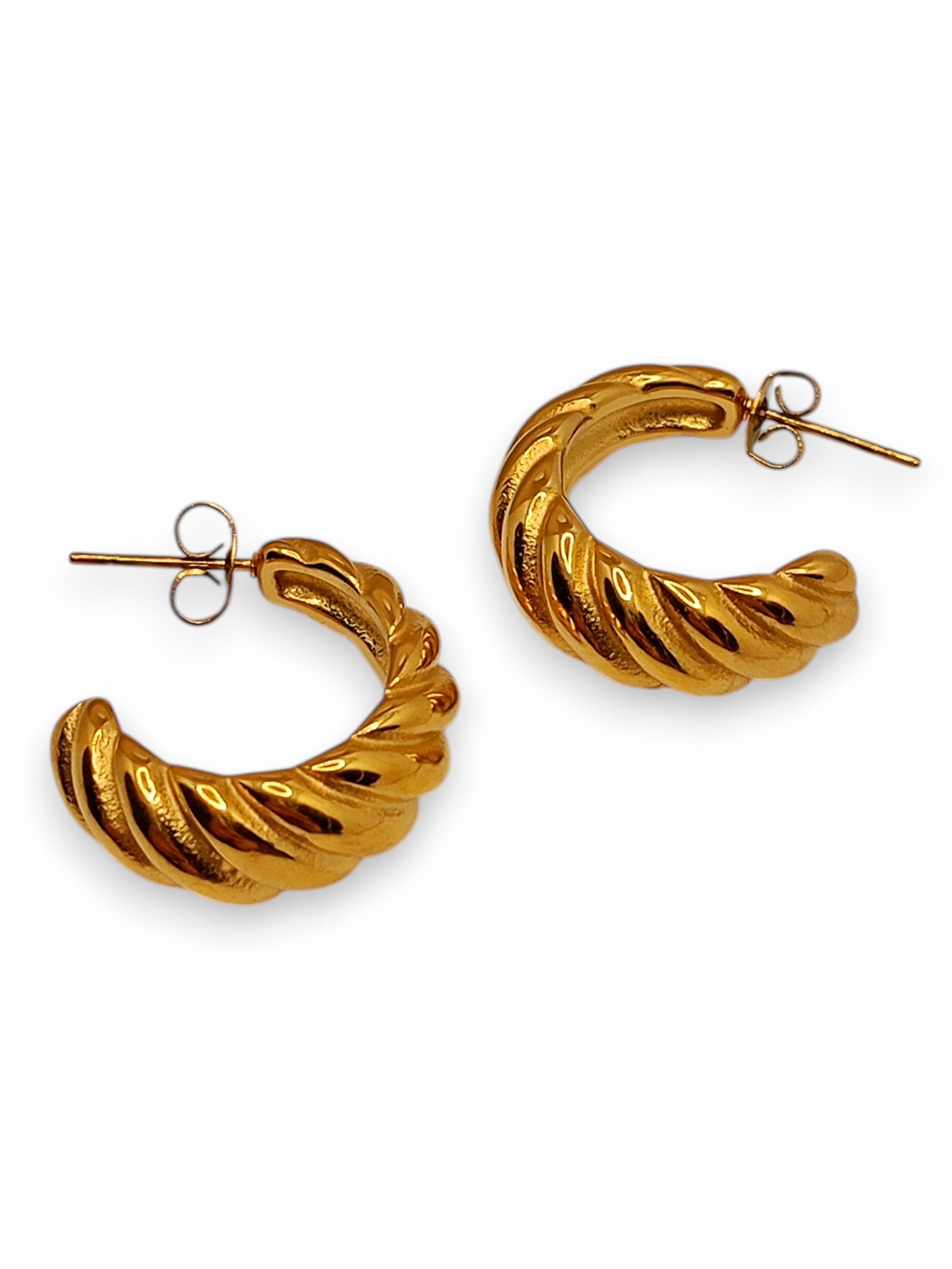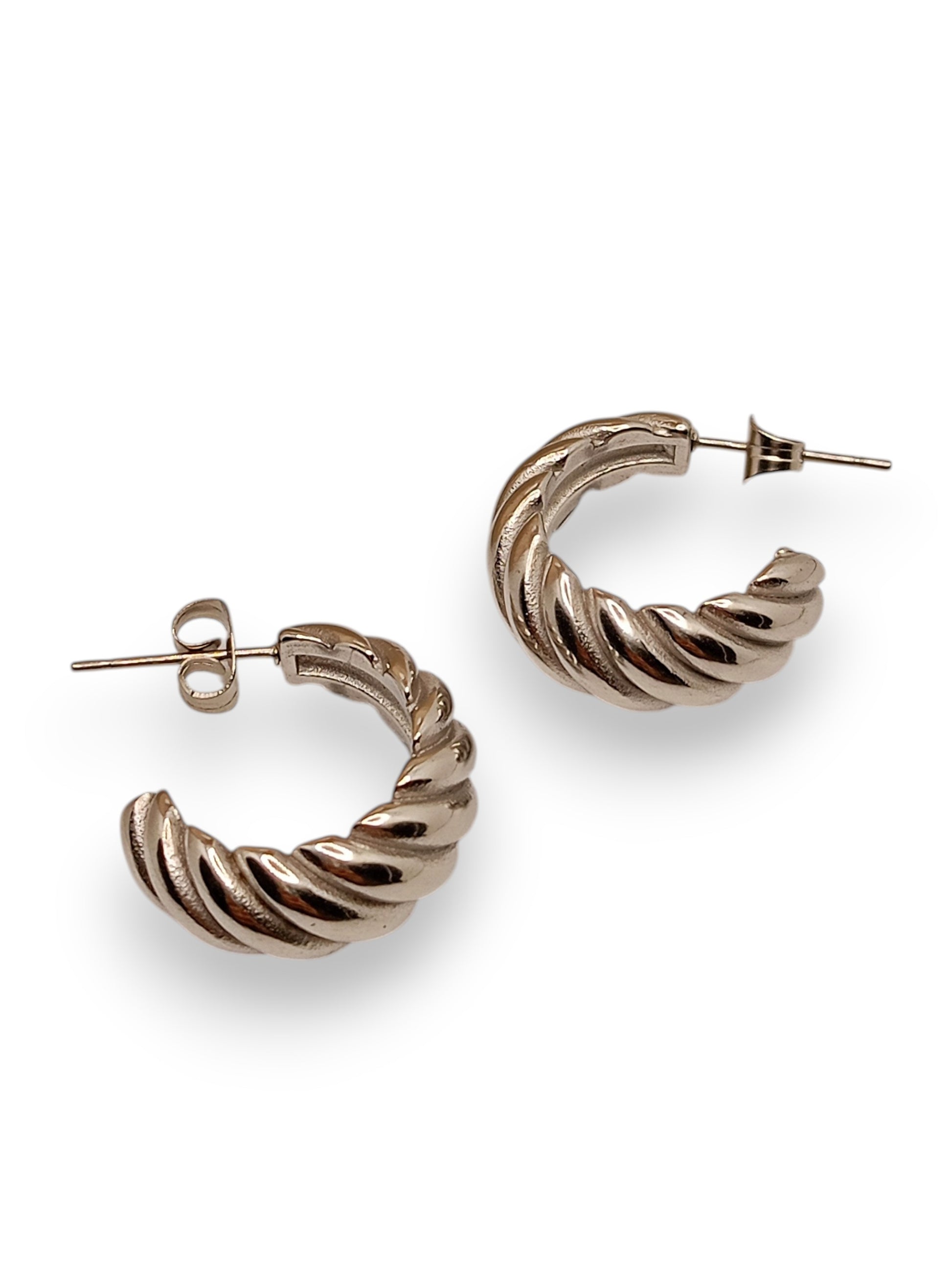 Hoop intrecciati in acciaio con finitura bold. Un modello che unisce eleganza e originalità, richiamando le texture vintage rivisitate in chiave contemporanea.
