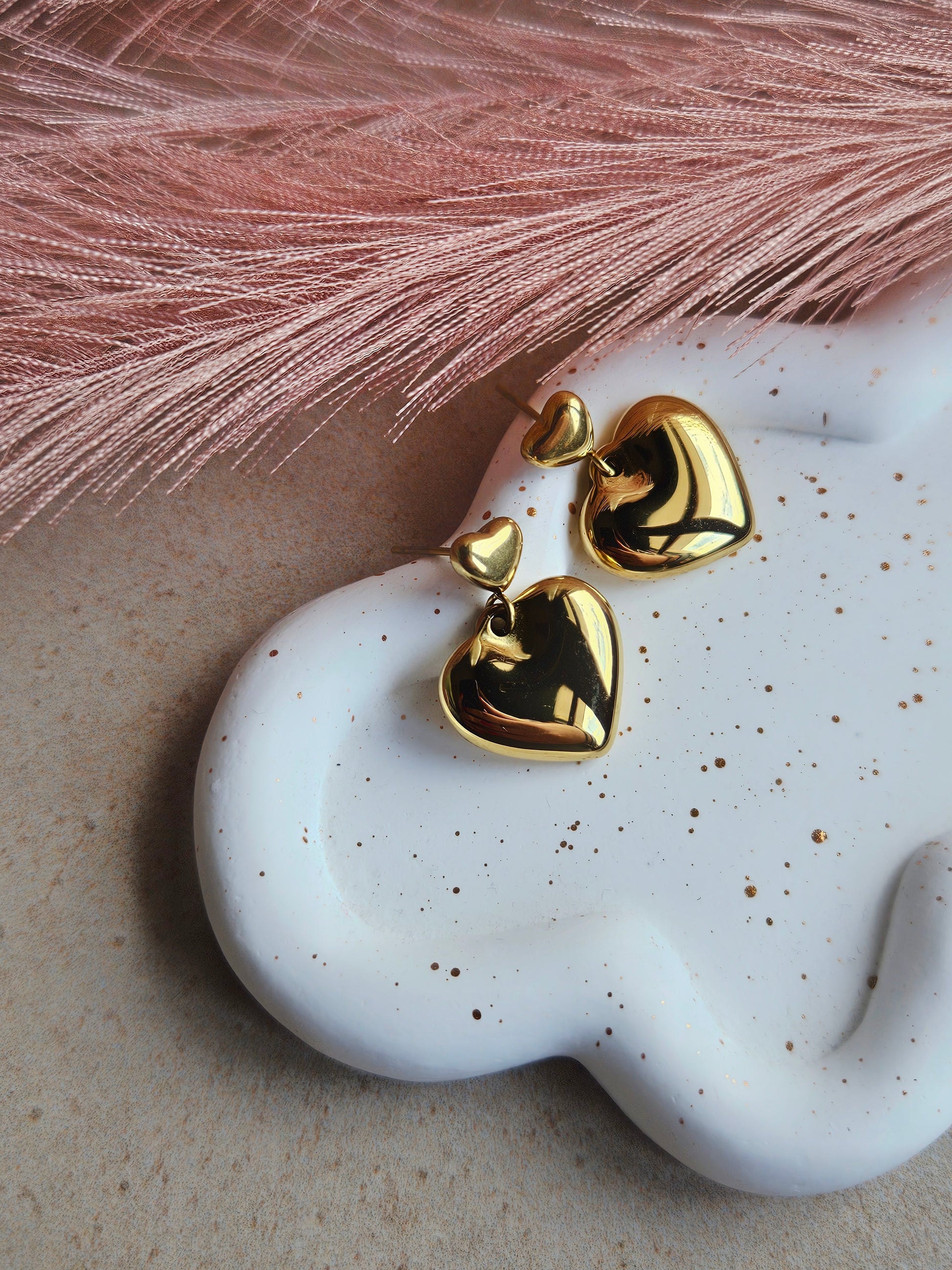 Orecchini in acciaio composti da due cuori bold, uno più piccolo e uno più grande, uniti in un elegante pendente. Dallo stile romantico e moderno, perfetto per aggiungere dolcezza e luminosità alle tue combo.