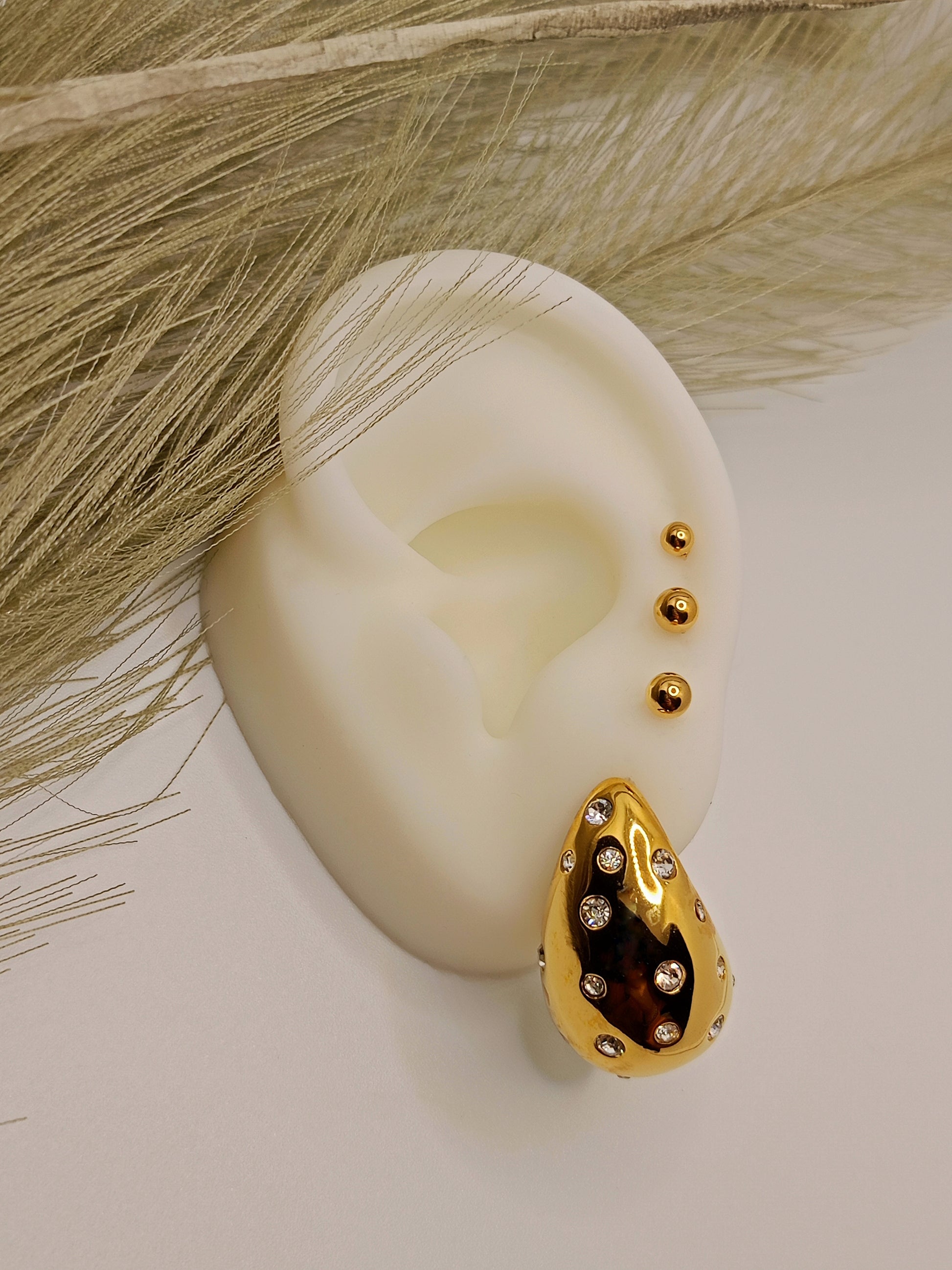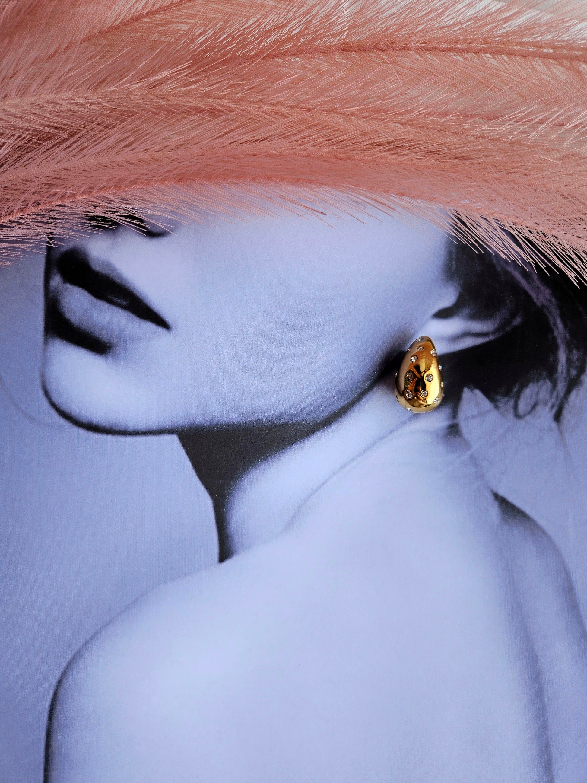 Un’interpretazione luminosa delle iconiche gocce. Se il modello classico è sinonimo di essenzialità, questa versione con zirconi incastonati aggiunge brillantezza e carattere. Mantengono la forma morbida e bombata tipica delle gocce, ma con un tocco in più che cattura la luce.
