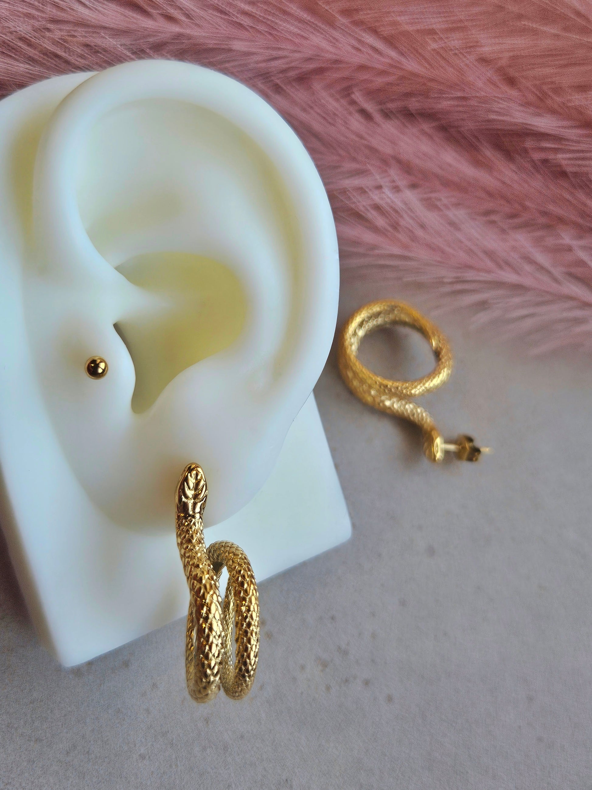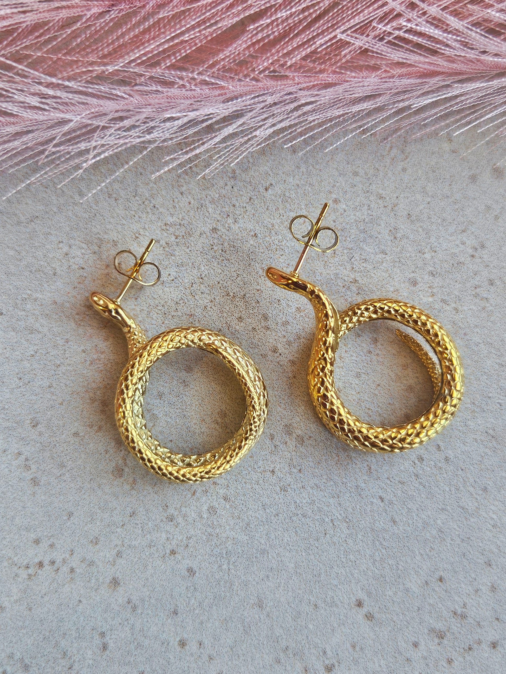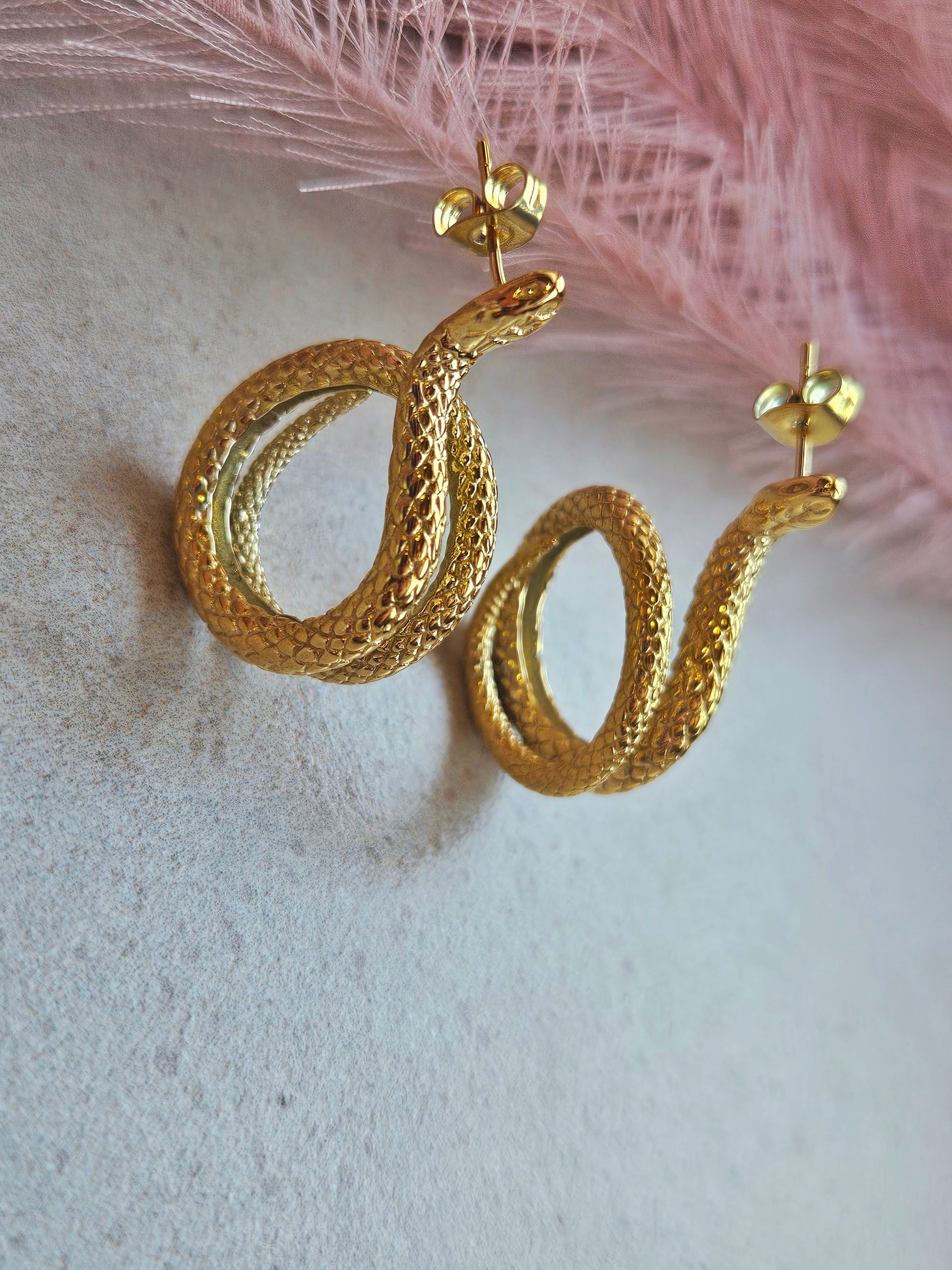 Audaci orecchini serpente in acciaio inox, con dettagli incisi che riprendono la texture delle squame. Un gioiello di carattere che avvolge l’orecchio con stile deciso, ideale per chi ama distinguersi.