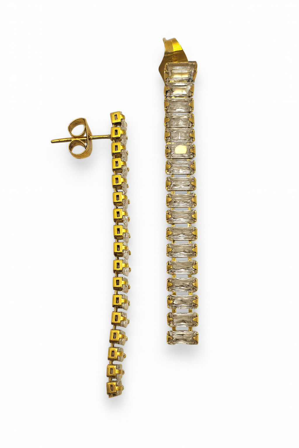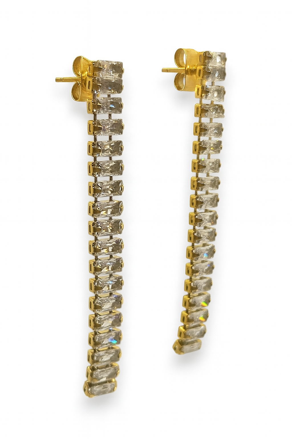 Lunghi, luminosi e incredibilmente chic: questi orecchini pendenti sono impreziositi da una fila di zirconi baguette incastonati che catturano la luce ad ogni movimento.