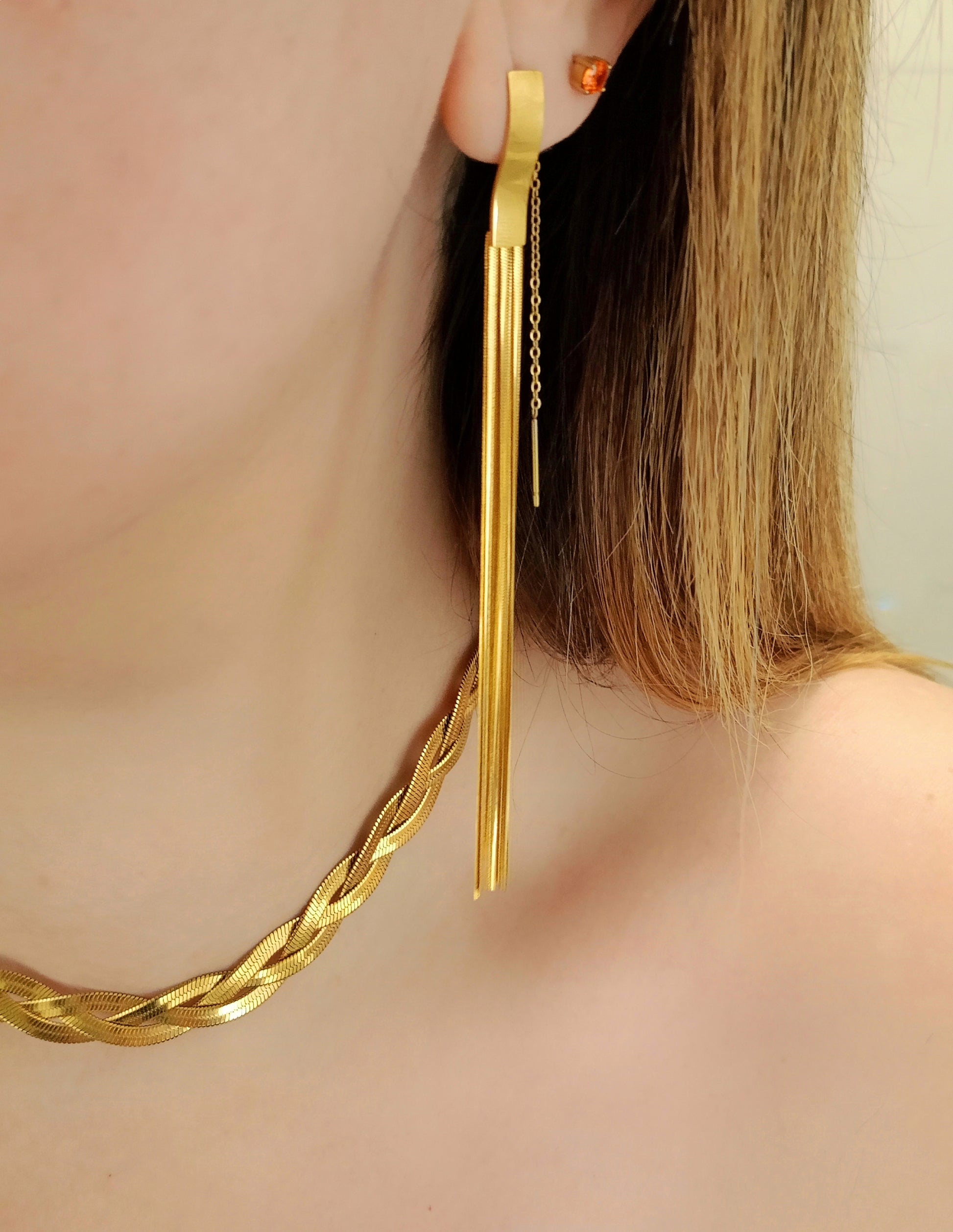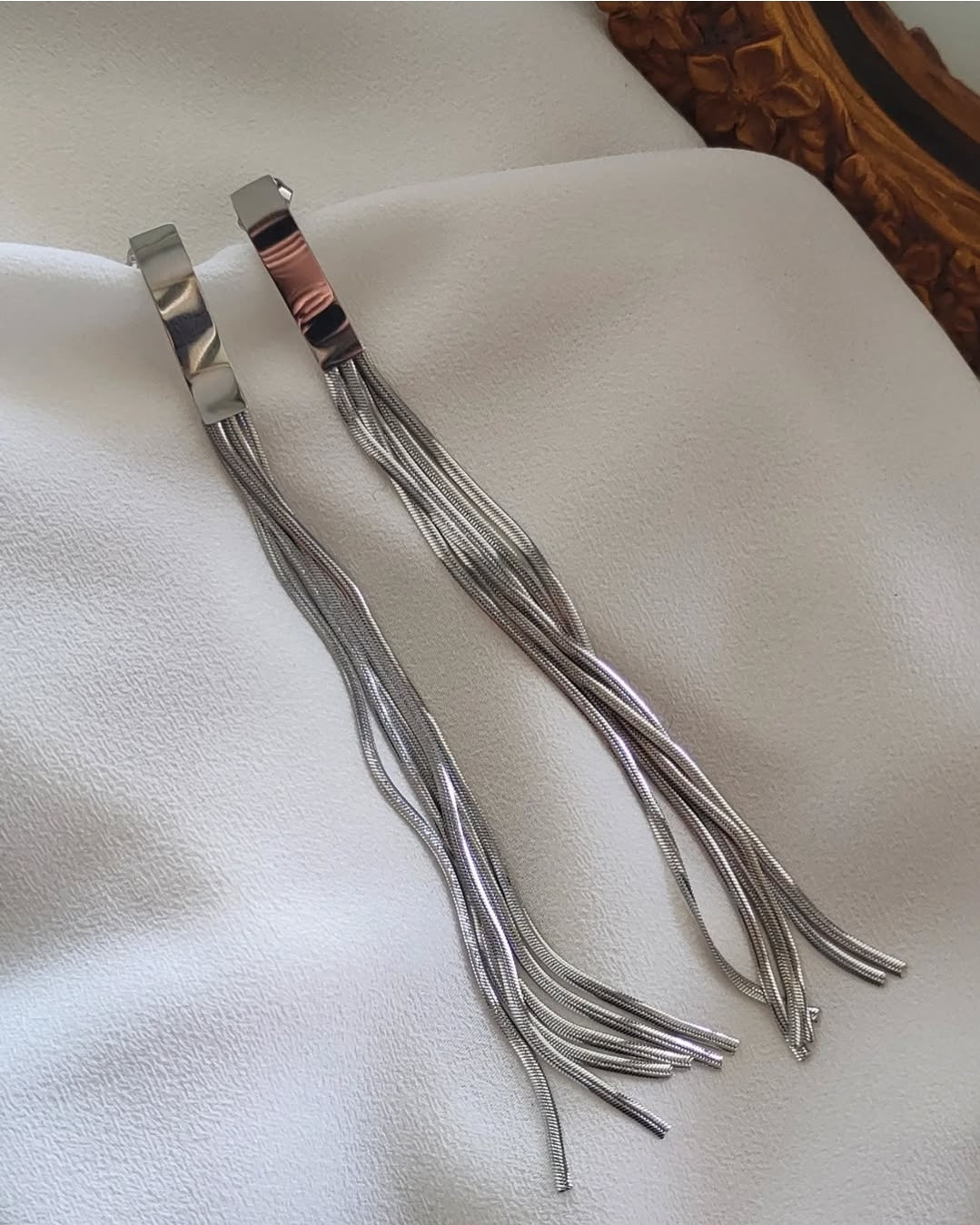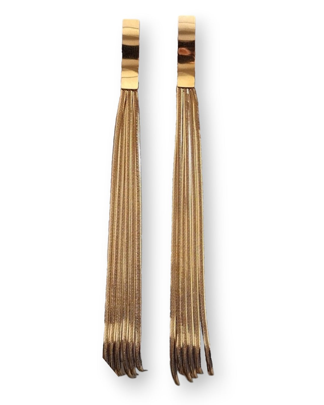 Gli orecchini Sofia sono caratterizzati da lunghe frange sottili effetto snake, che donano movimento e luminosità al volto. Design elegante e di forte impatto, ideale per serate ed eventi speciali. Leggeri da indossare, perfetti da abbinare alle collane Snake.