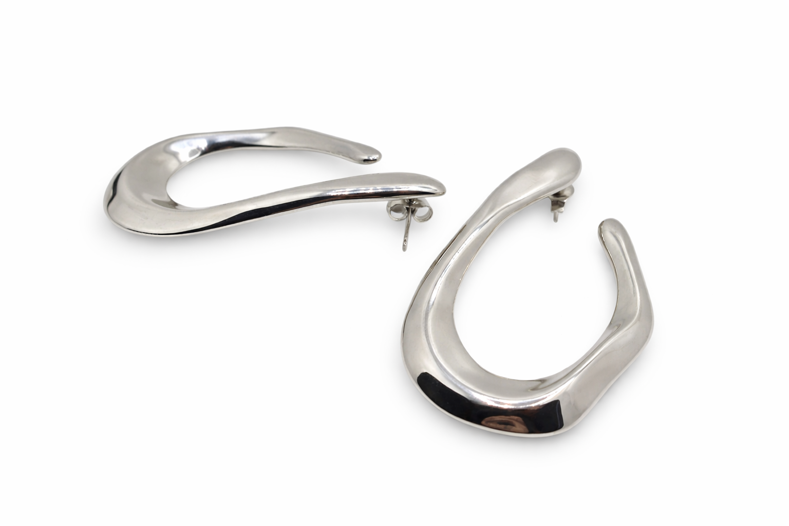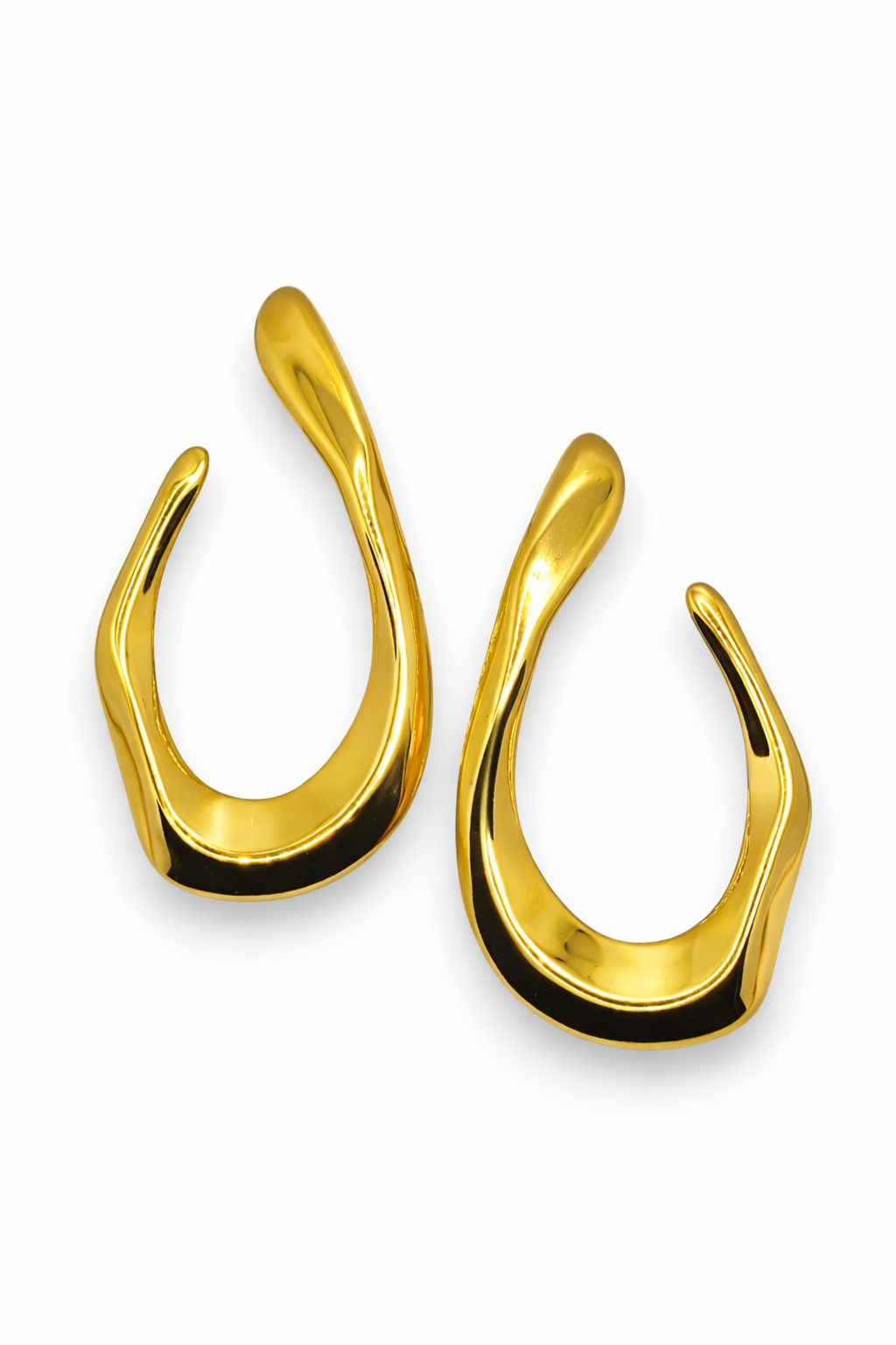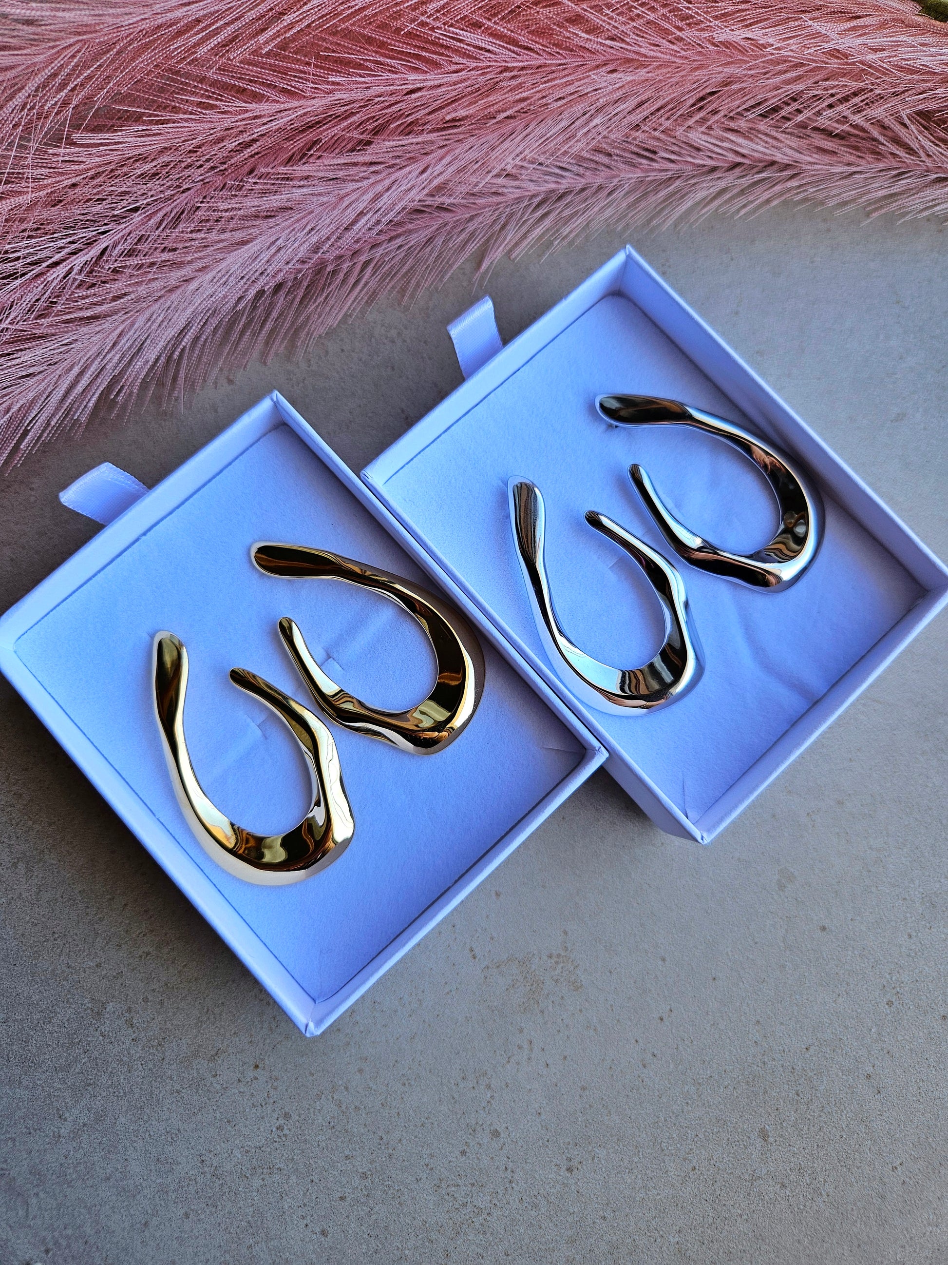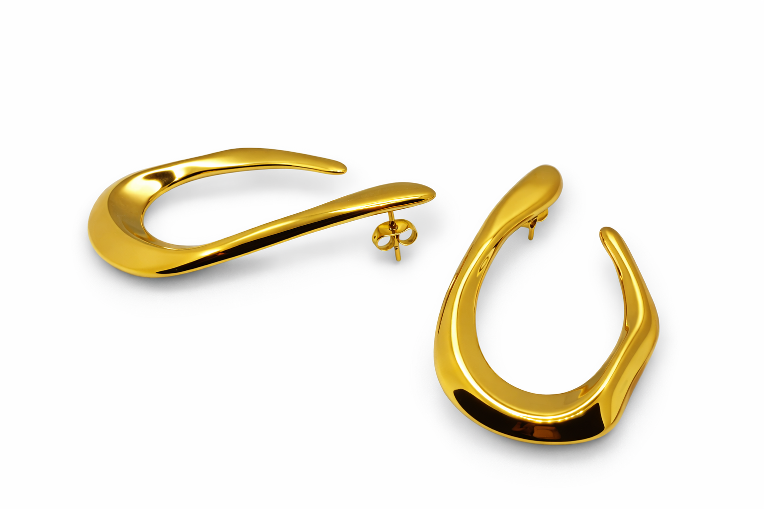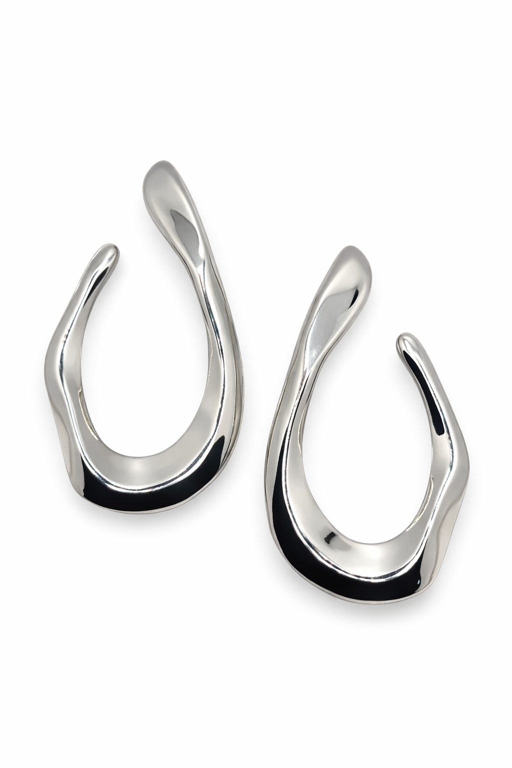 Orecchini dal design organico e scultoreo, con una forma fluida che avvolge il lobo in modo armonioso ma deciso. La loro silhouette irregolare richiama un’onda in movimento, morbida ma potente. Leggeri e sottili, come non averli