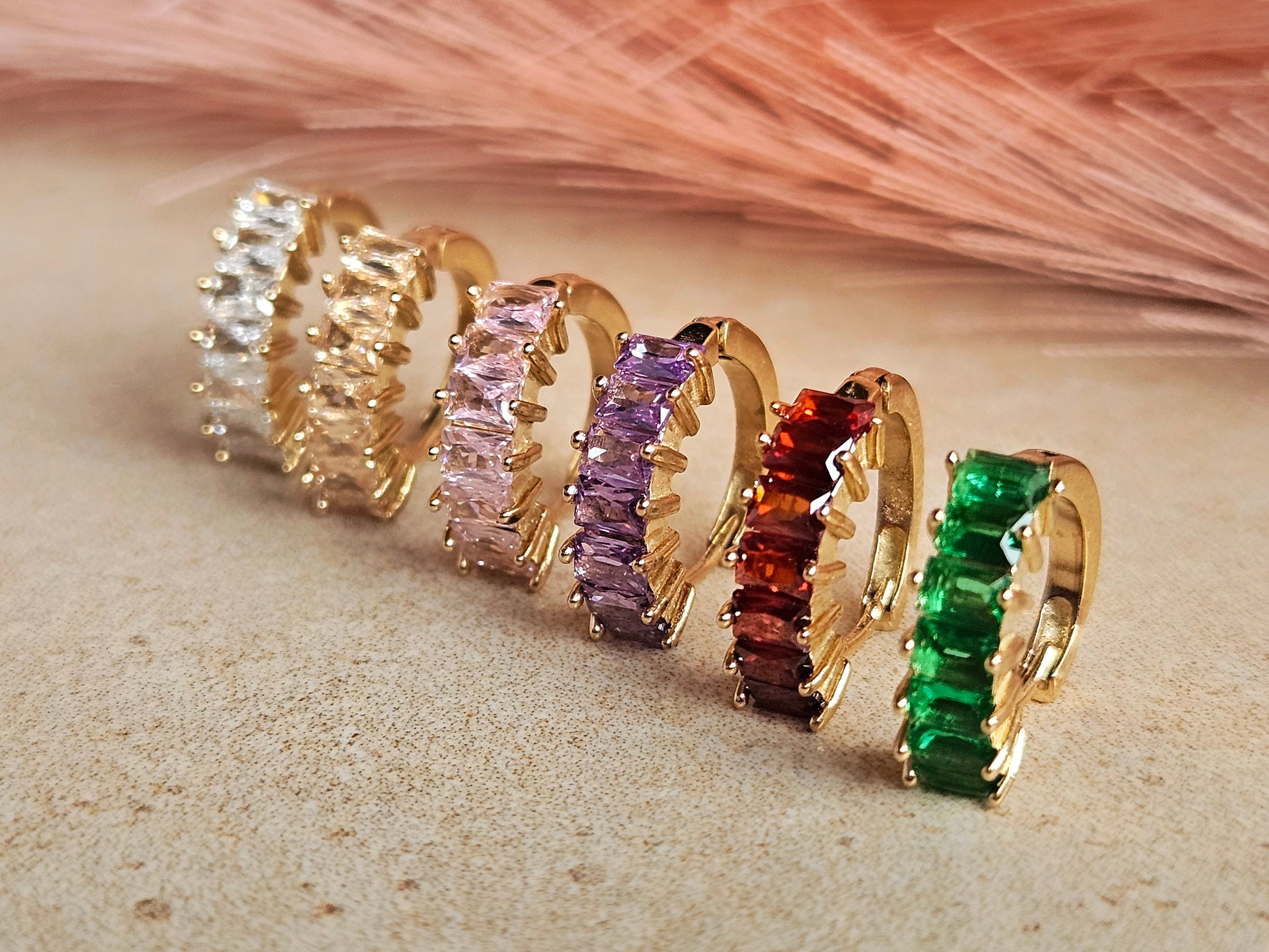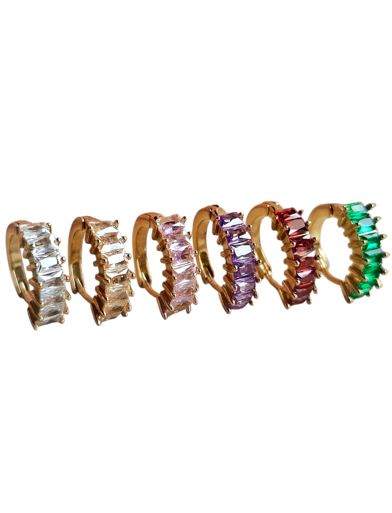 Orecchino singolo in acciaio, disponibile in oro o argento, arricchito da zirconi baguette colorati. Perfetto per chi ama aggiungere un tocco vivace alle proprie combo.