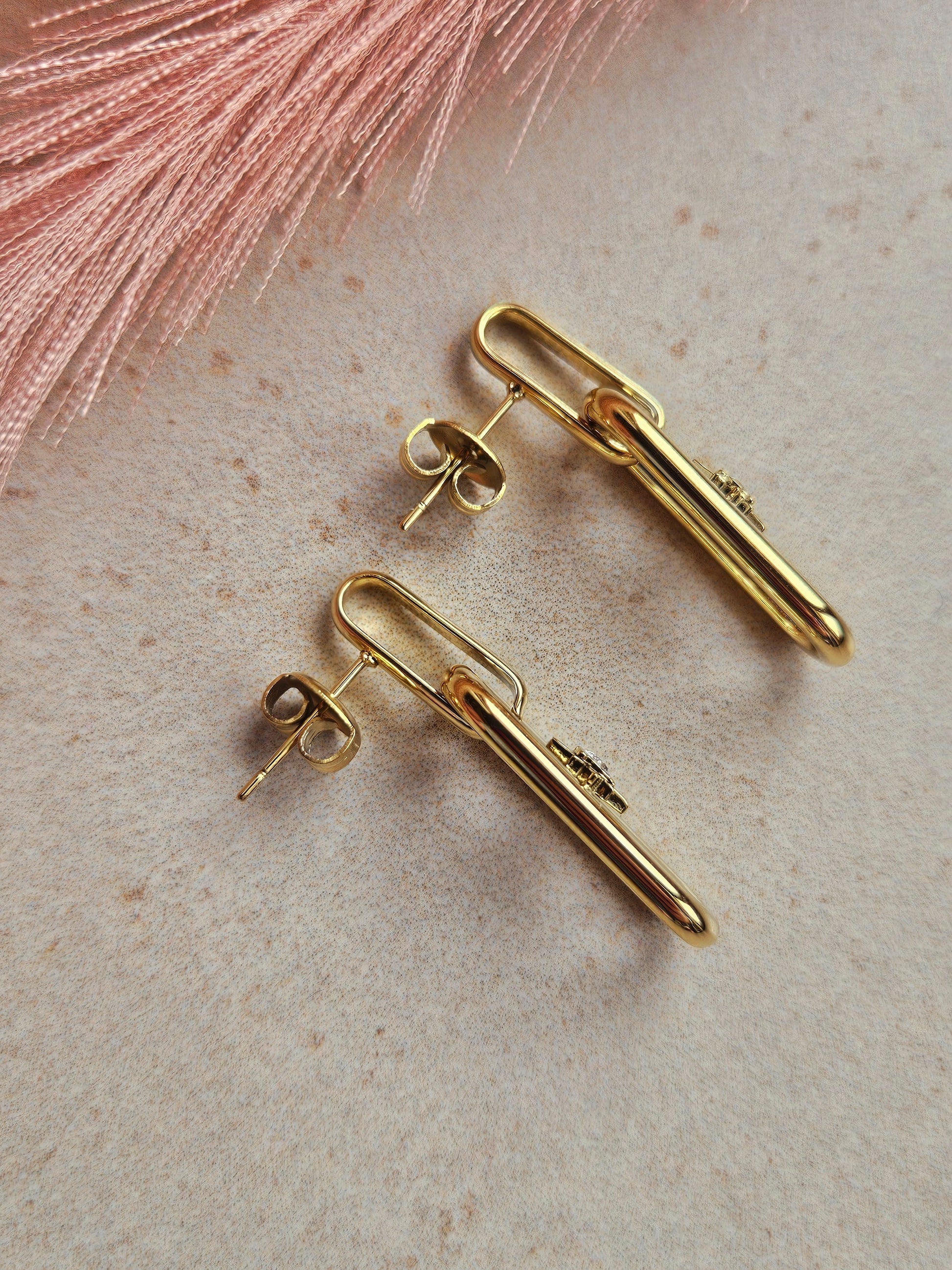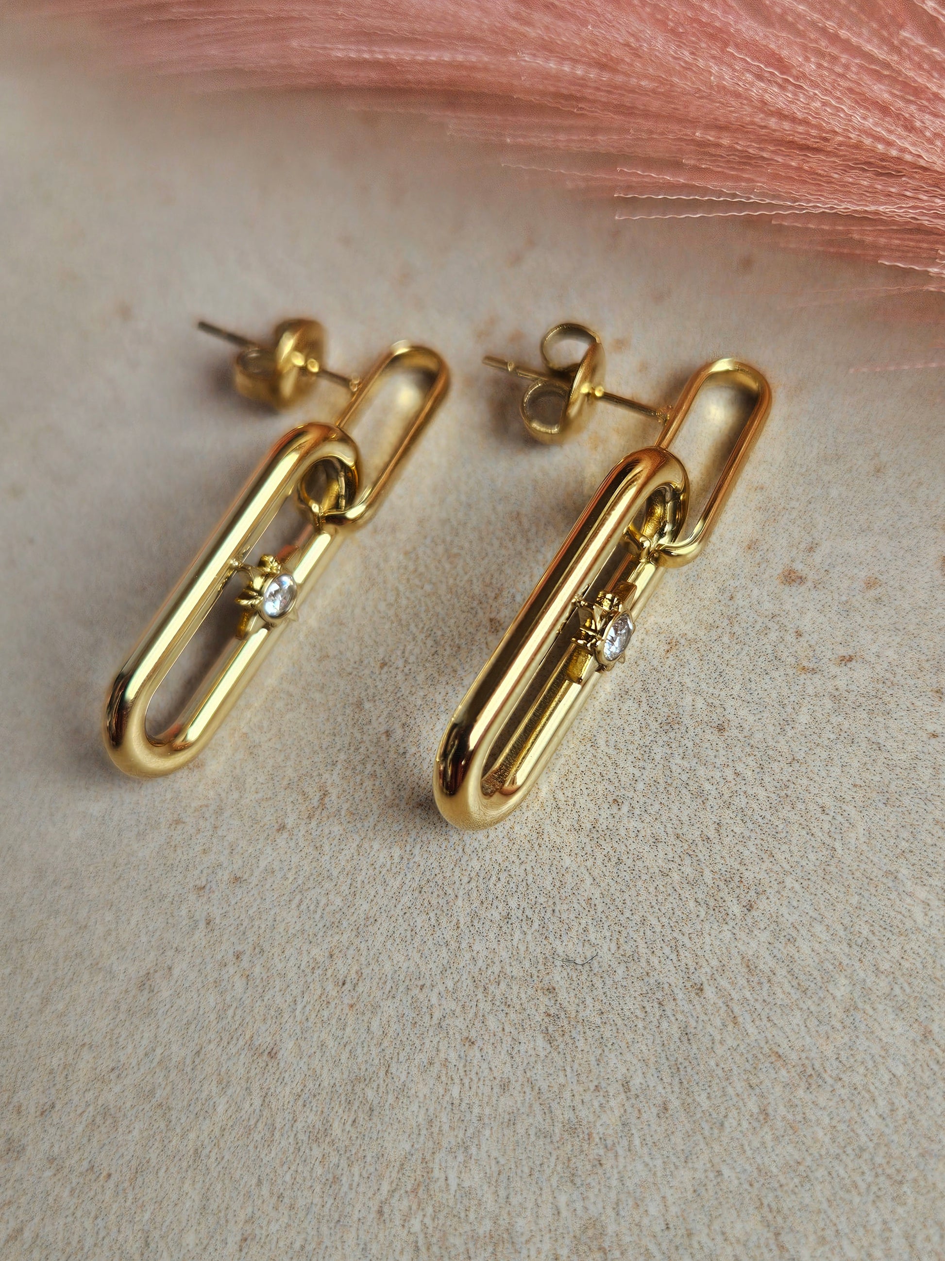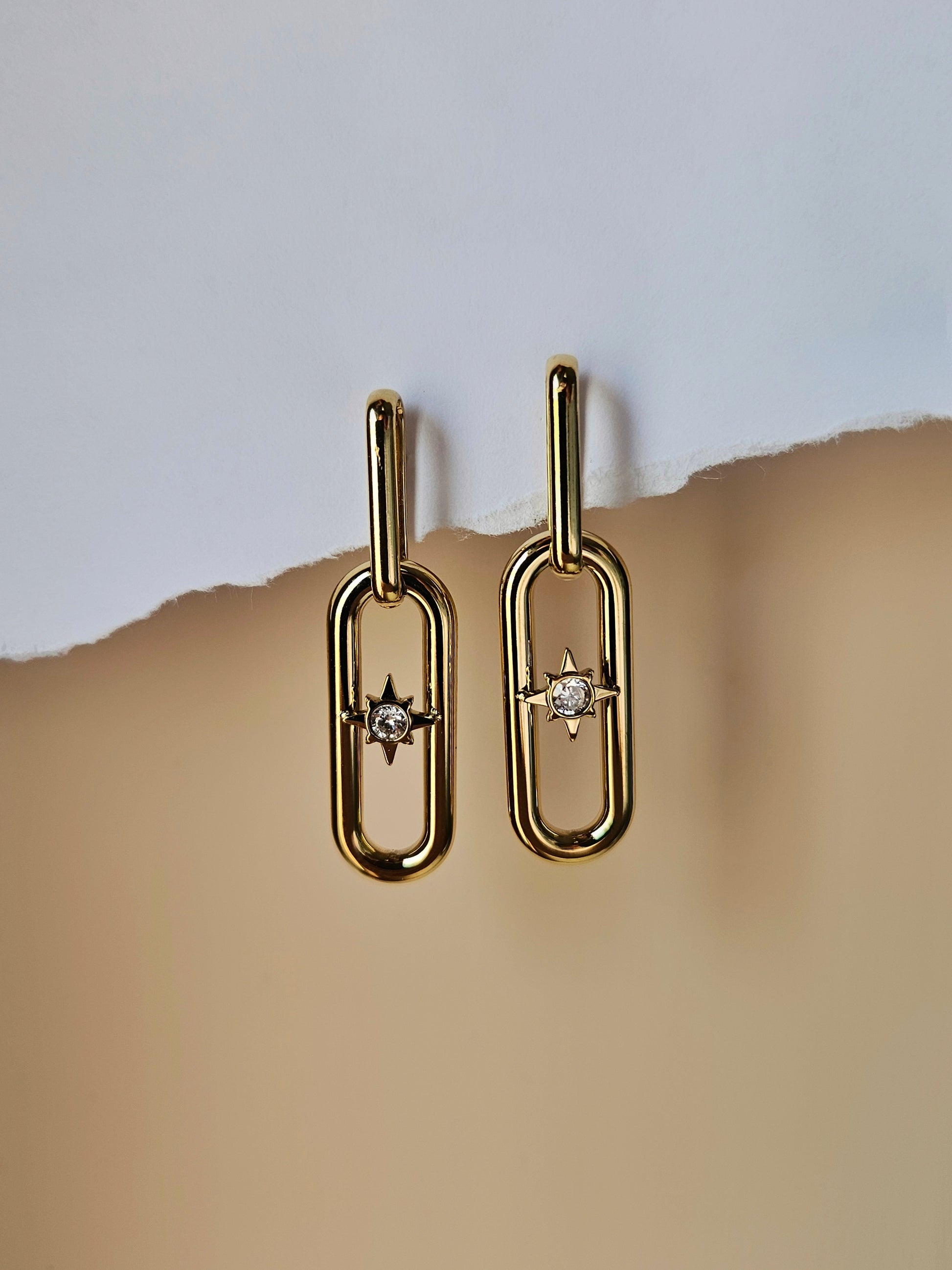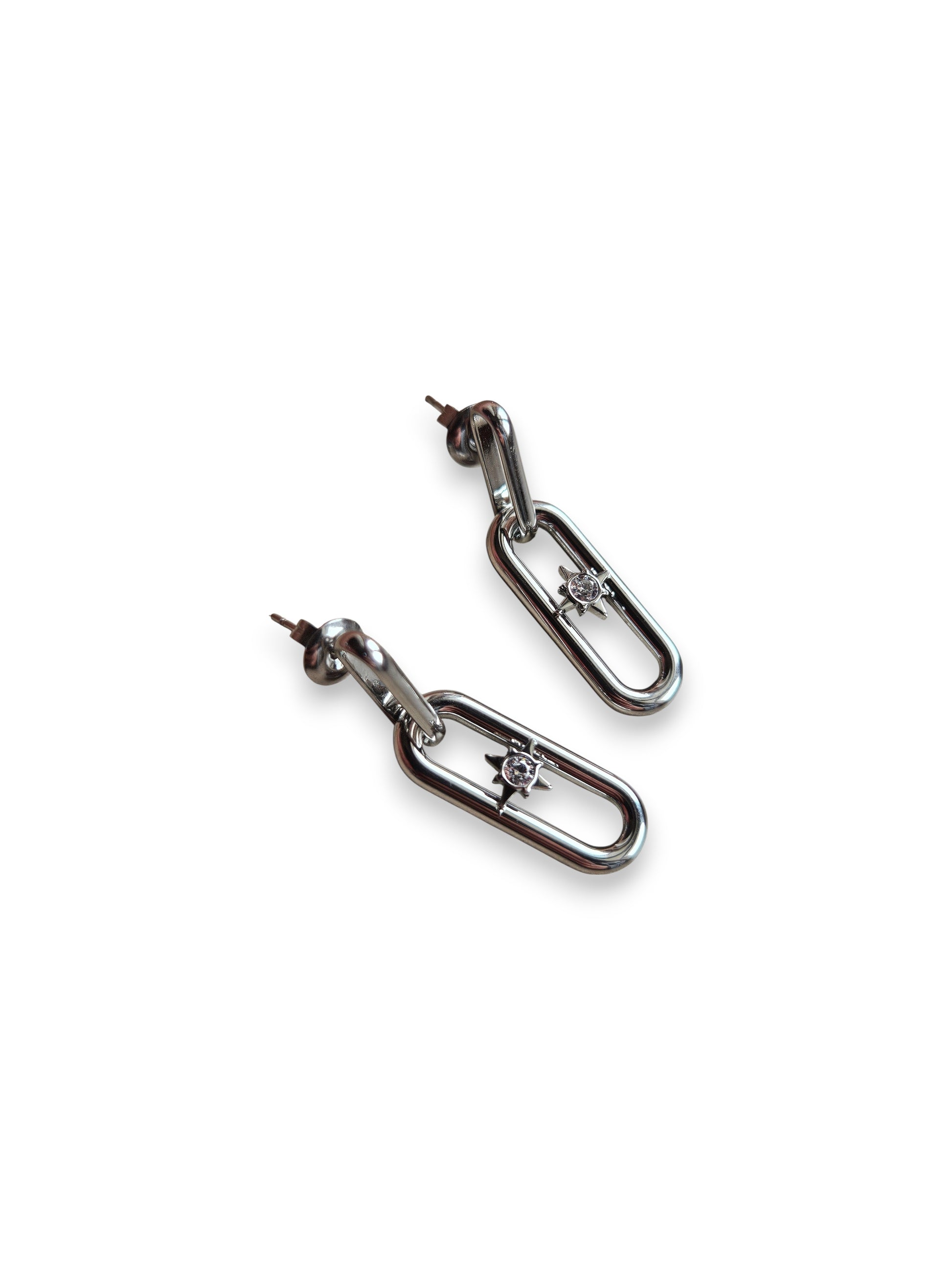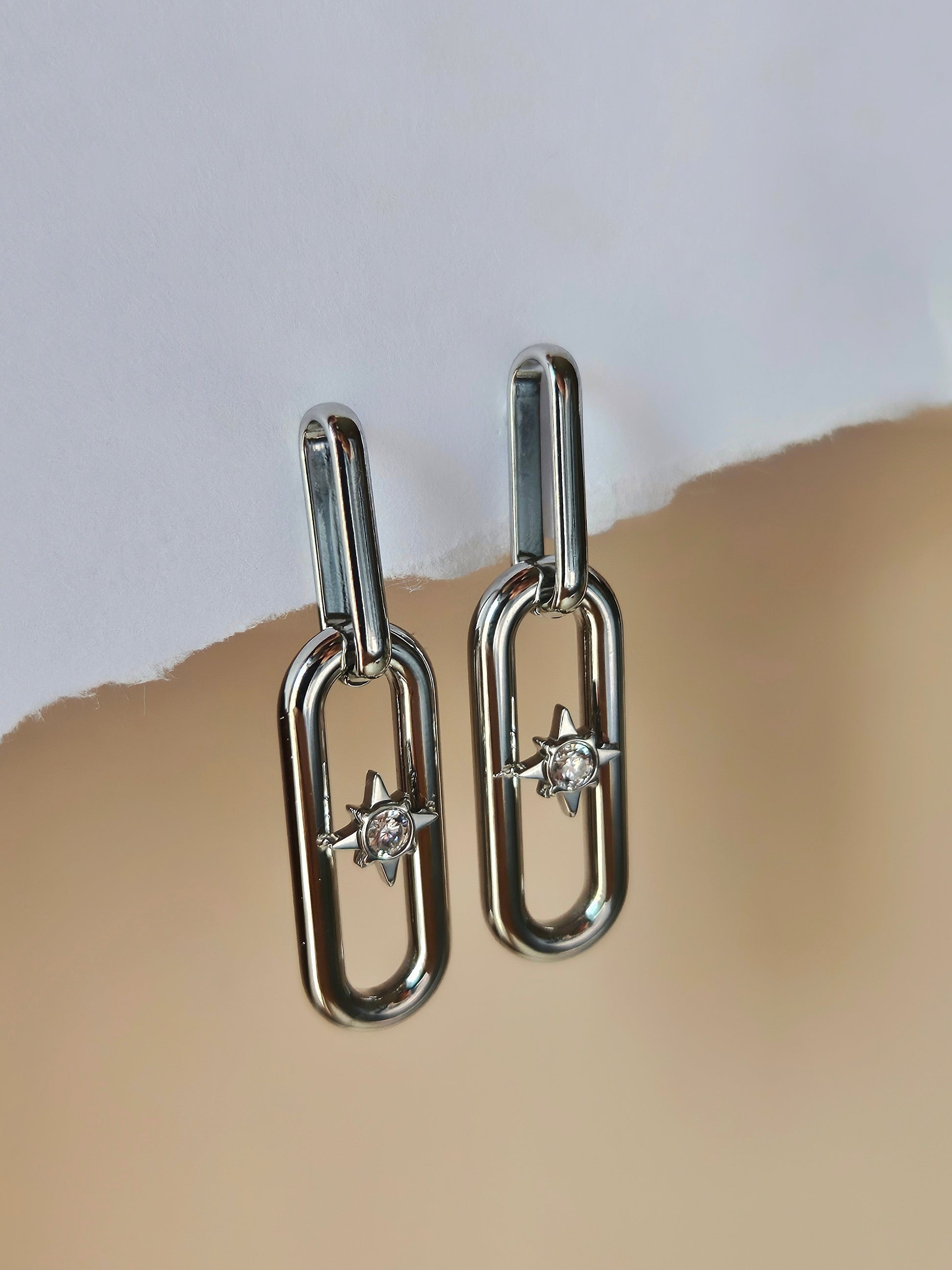 Moderni orecchini a catena rettangolare in acciaio inox, arricchiti da una stella polare con al centro un brillante zircone incastonato. Perfetti per chi cerca un tocco di eleganza contemporanea.