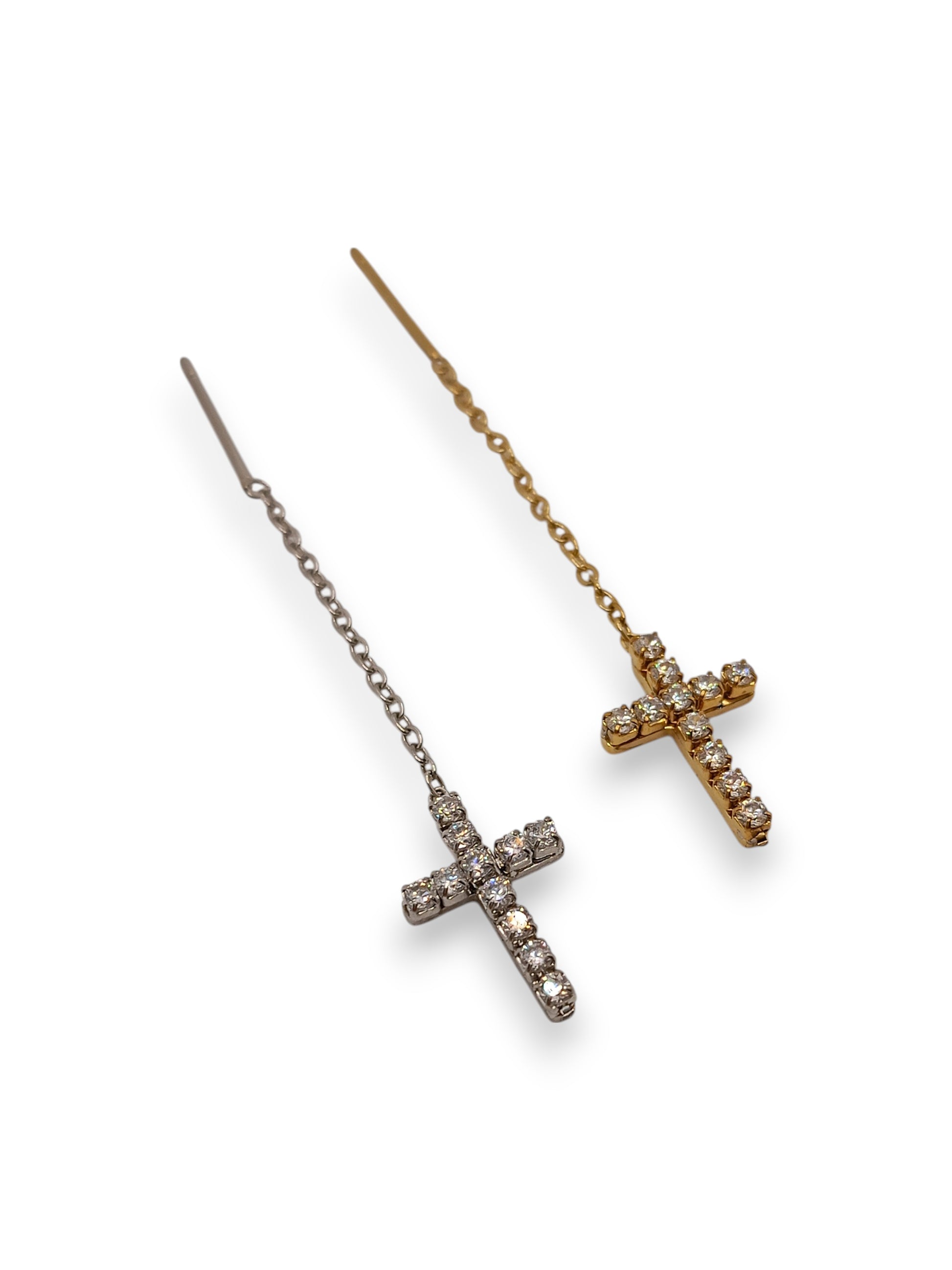 Orecchini saliscendi con ciondolo a croce interamente decorata da zirconi. Raffinati e luminosi, sono un accessorio dal forte impatto simbolico e stilistico.