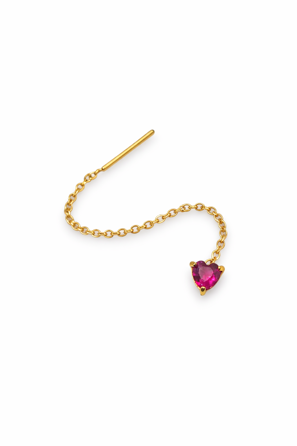 Orecchino saliscendi con delicato punto luce a cuore, luminoso e raffinato. Il design essenziale della catenina crea un movimento elegante che accompagna il viso, mentre il cuore aggiunge un tocco di colore deciso ma armonioso.