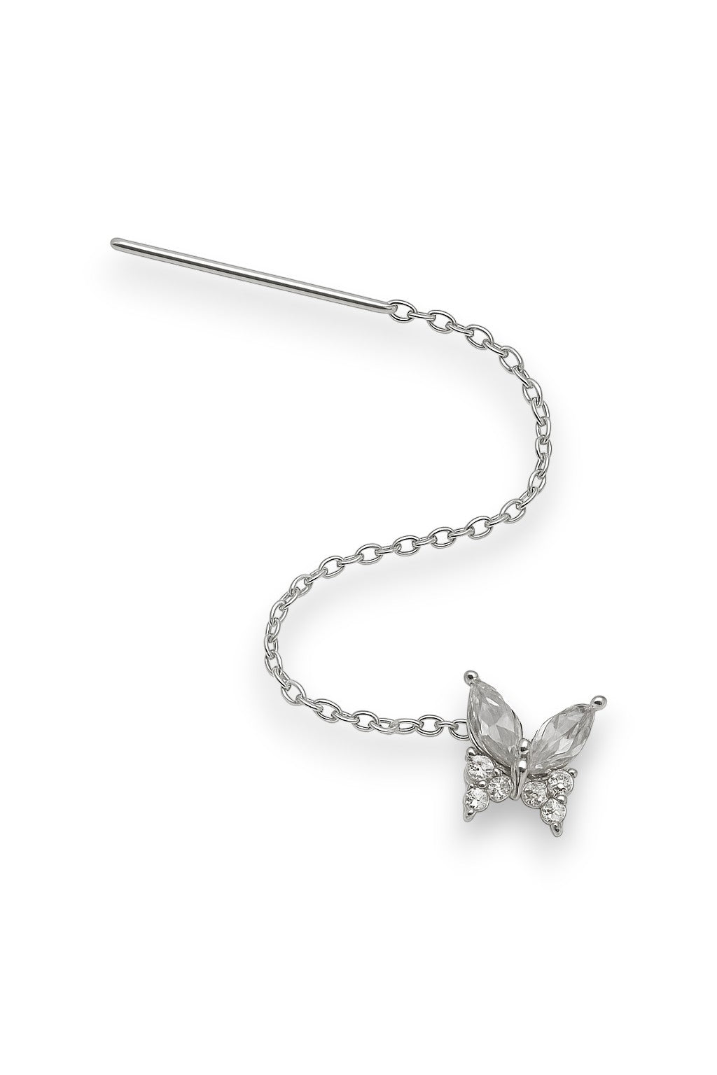 Orecchino singolo con catena saliscendi sottile e ciondolo a farfalla tempestato di zirconi. Il design delicato e raffinato lo rende ideale per chi ama i dettagli femminili e originali.