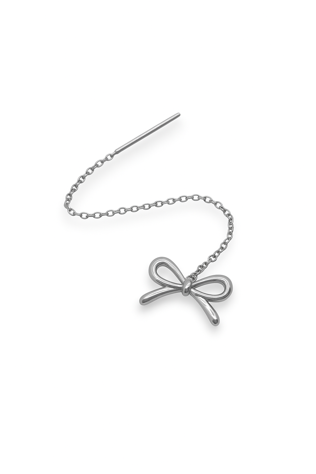 Orecchino con fiocco stilizzato e catena fine, ispirato alla delicatezza dei nastri di seta.