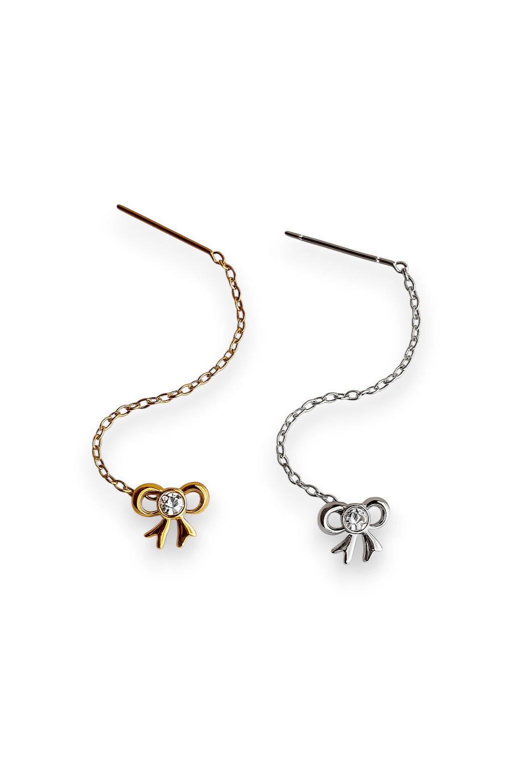 Orecchini saliscendi con catenina sottile e charm a forma di fiocco impreziosito da un piccolo zircone centrale. Leggeri, romantici e delicati.
