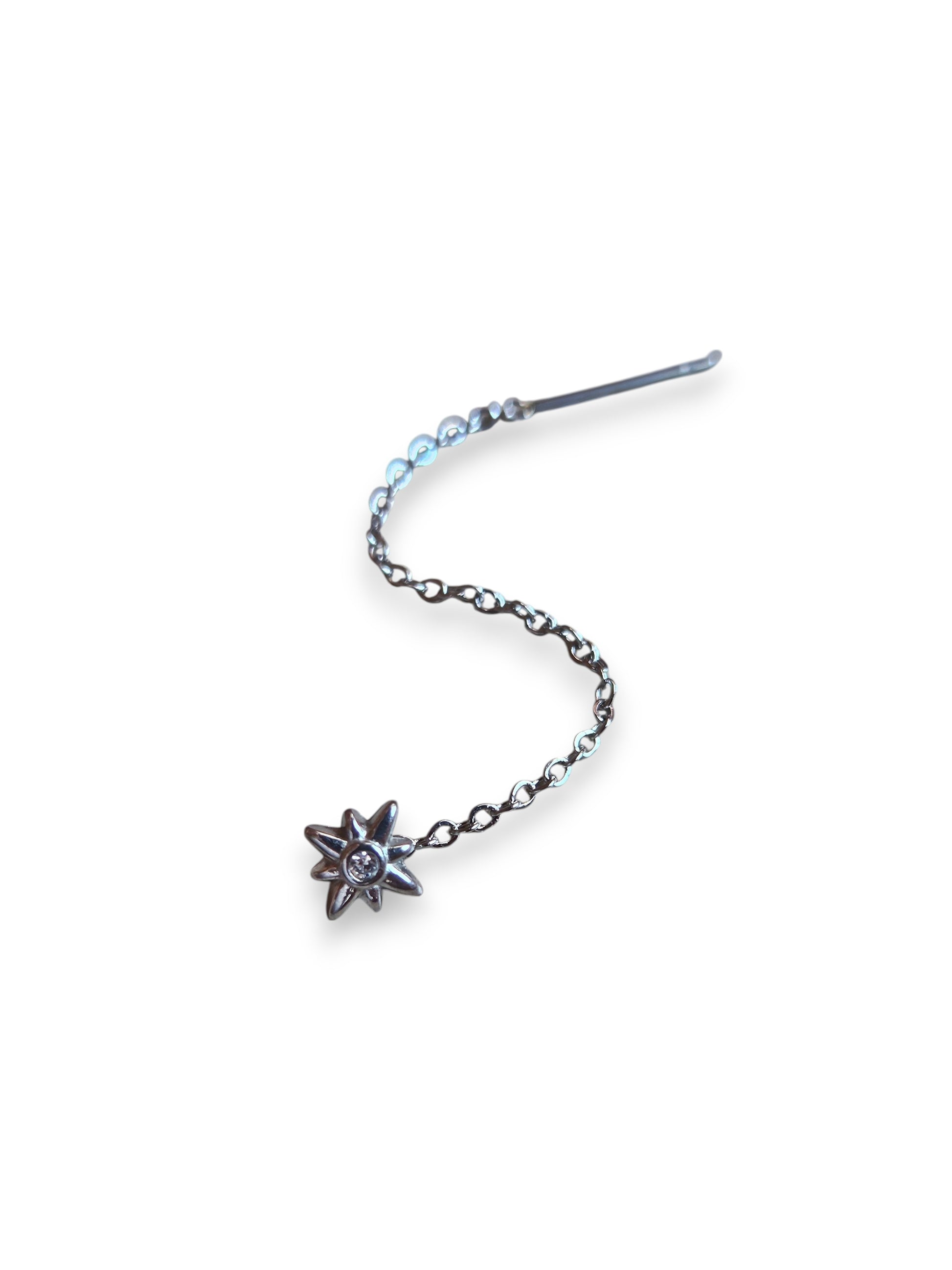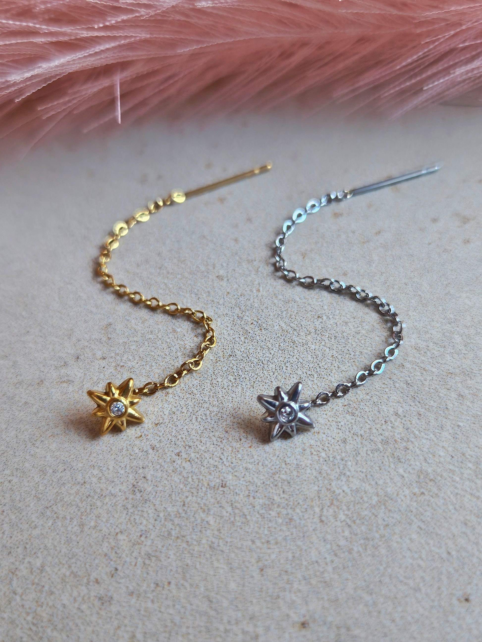 Orecchini saliscendi con charm a forma di stella polare e punto luce centrale. Semplici e luminosi, regalano eleganza discreta e un tocco di originalità.