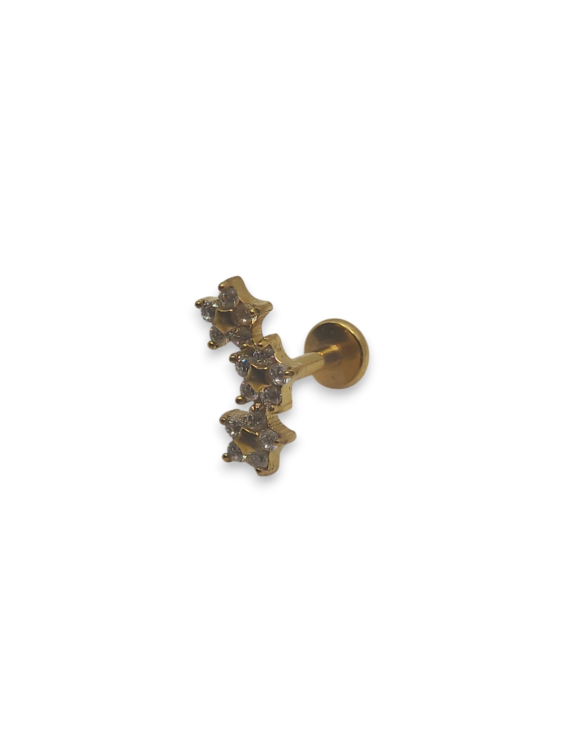 Piercing per helix o lobo in acciaio inox, decorato da tre piccole fiori con zirconi per un effetto luminoso e moderno. Chiusura piatta a vite, comoda da indossare ogni giorno. Un dettaglio versatile perfetto per chi ama i look minimal ma brillanti.
