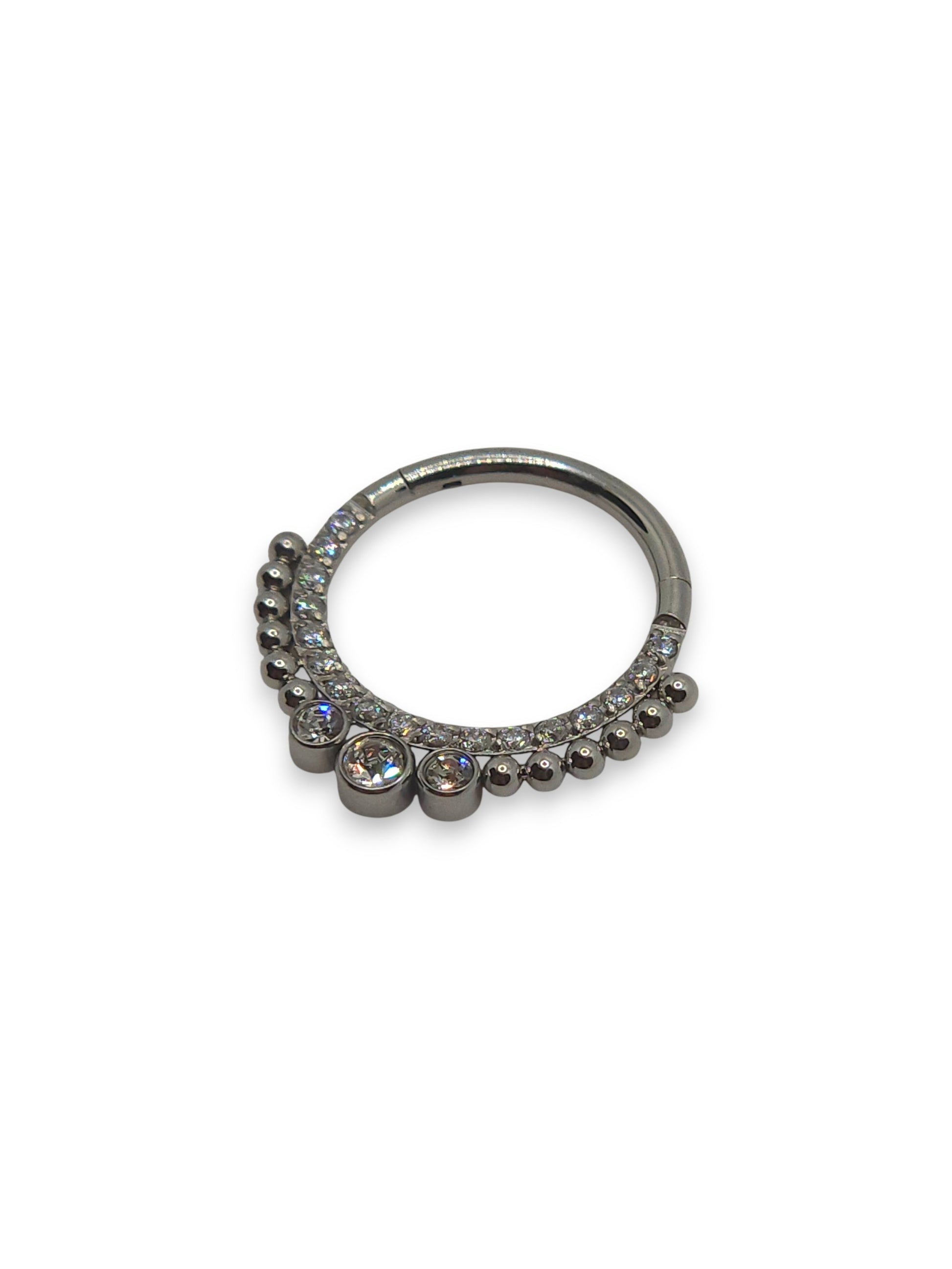 Piercing hoop in acciaio inox decorato con zirconi e micro sfere per un effetto elegante e luminoso. Ideale per creare un punto luce sofisticato nella composizione.