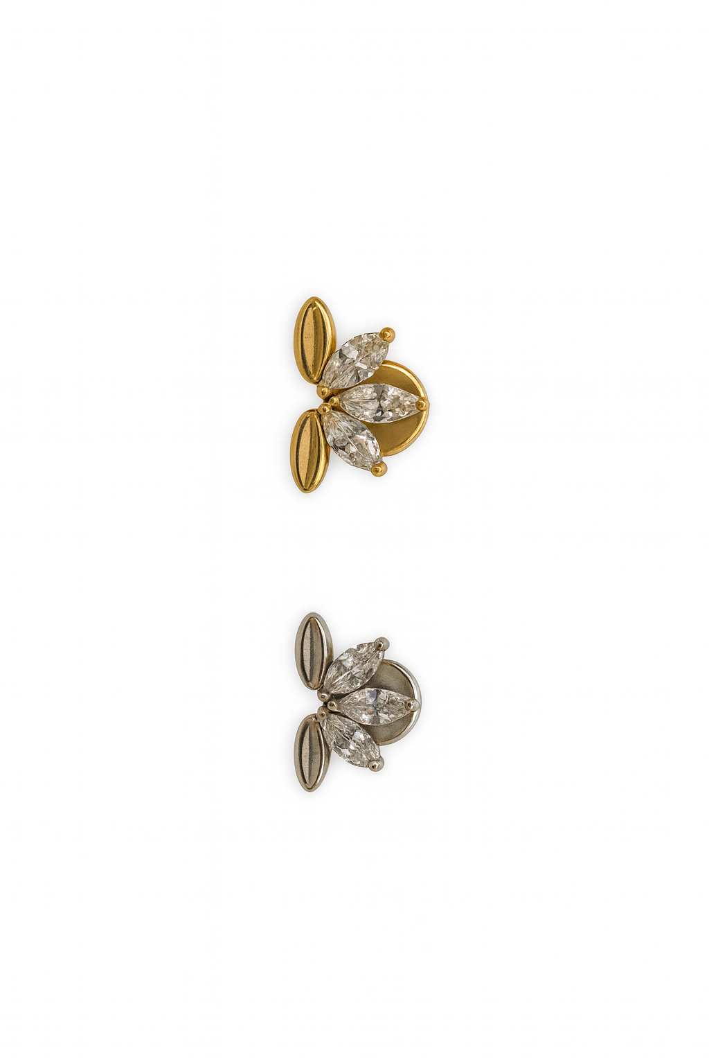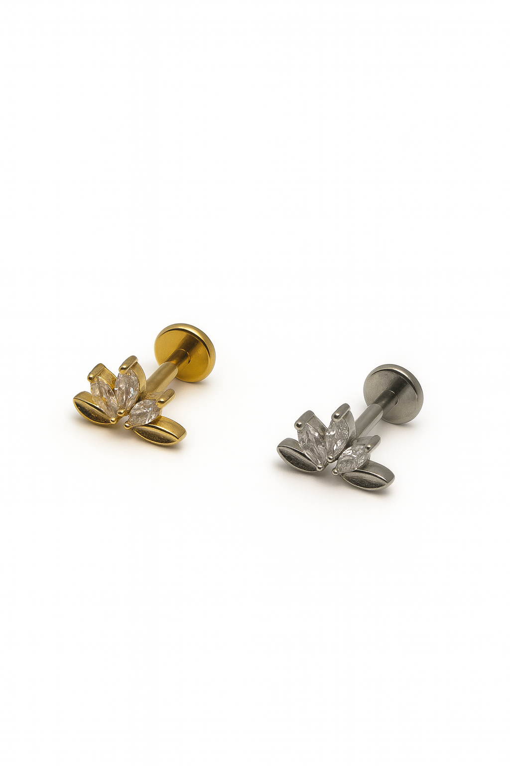 Piercing in acciaio inox con chiusura piatta, caratterizzato da un piccolo motivo floreale con zirconi luminosi. Un gioiello discreto ma raffinato, ideale per tragus, helix o lobo.