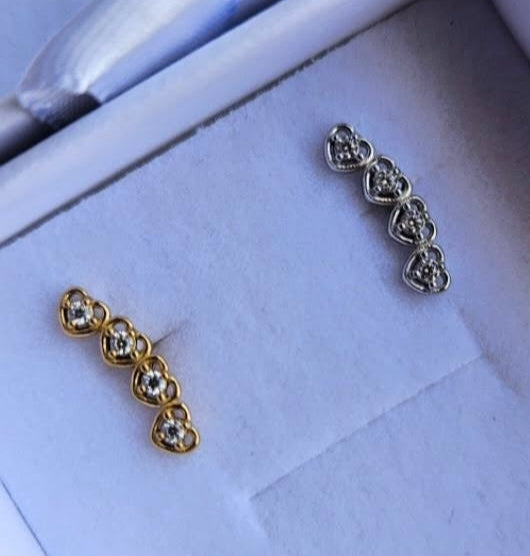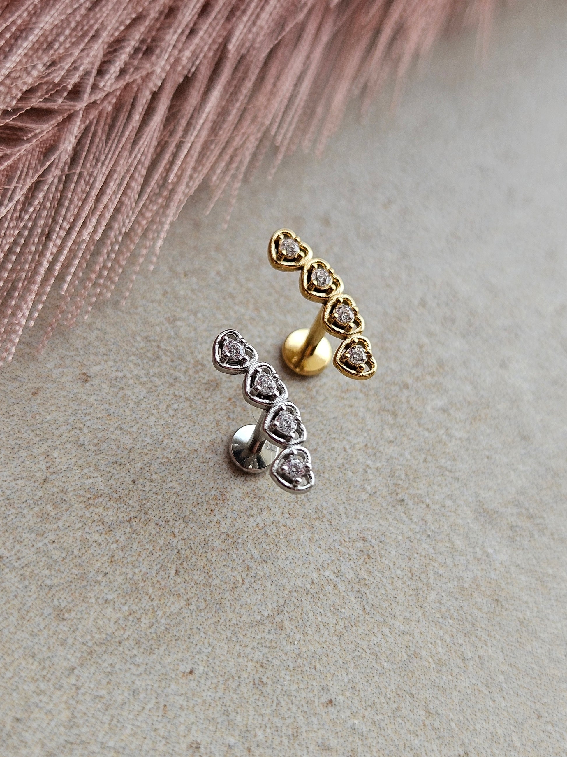 Delicato piercing a forma di piccoli cuori allineati con pietre, perfetto per aggiungere un tocco romantico al tuo look. Realizzato in acciaio inox e disponibile in finitura oro e argento.